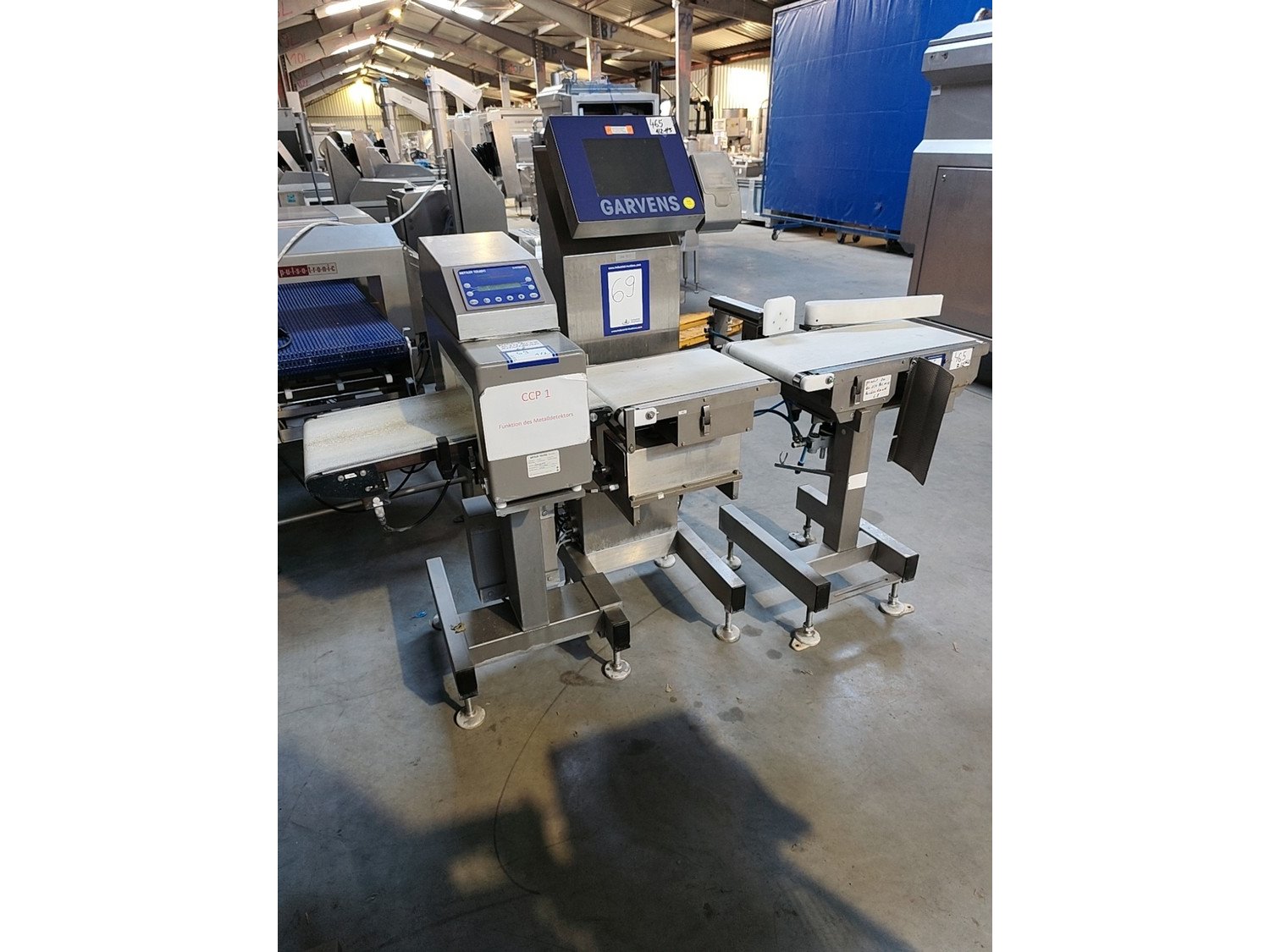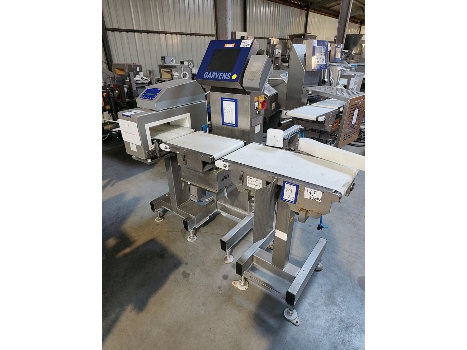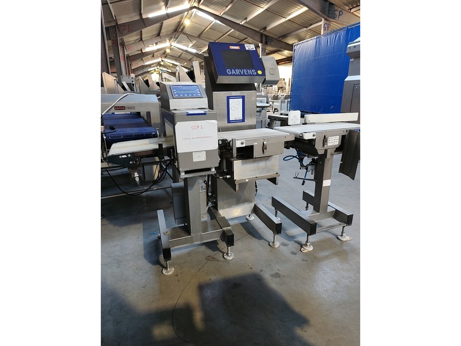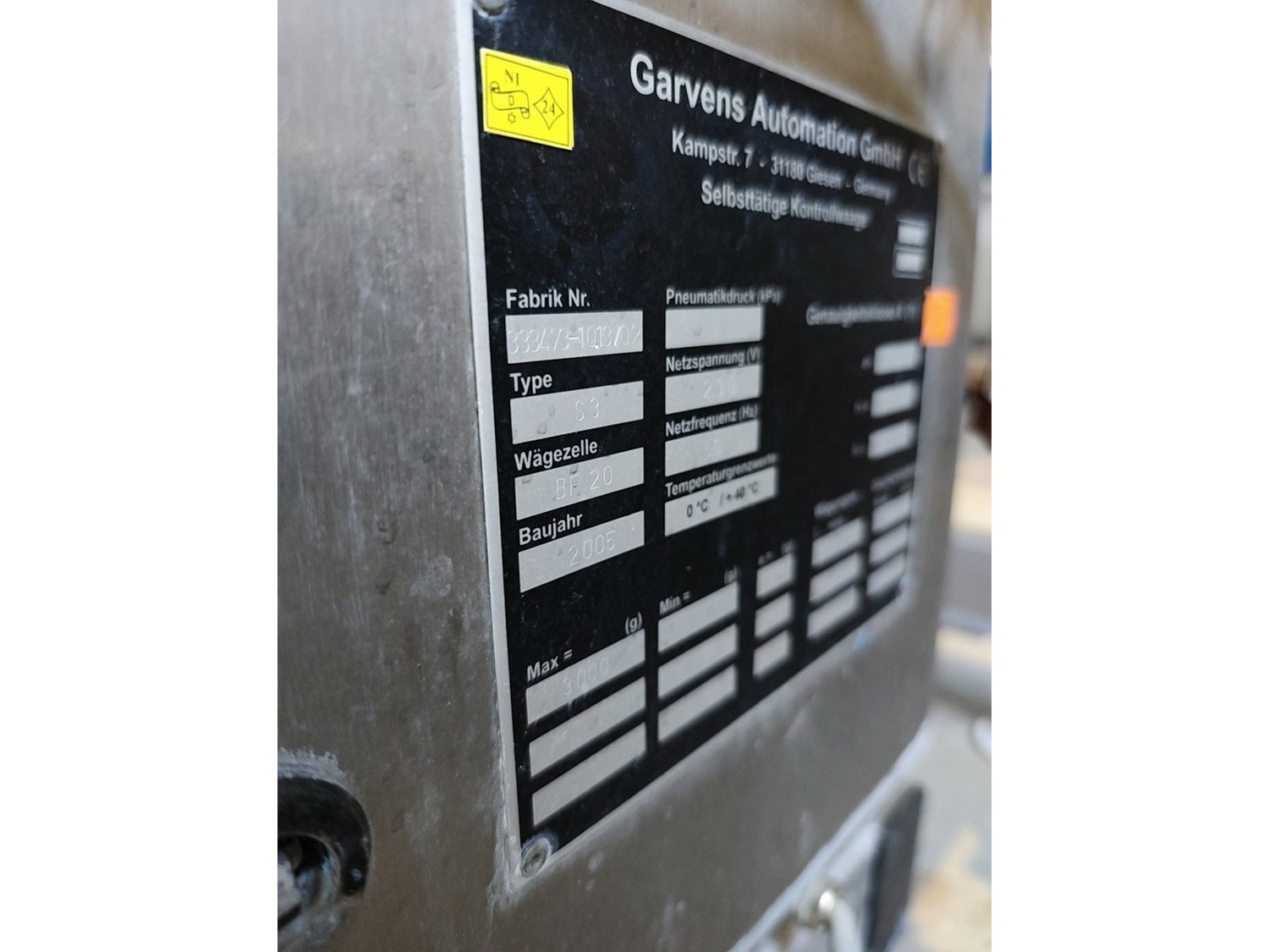 Garvens checkweigher with metal detector and rejector, model S3, serial number: 333473-10.13/02, year of construction: 2005, 230 V, 50 Hz, weigher: BF20, dimensions: 2000 mm x 730 mm x 1520 mm, dimensions transport belt with rejectors, dimensions 600 mm x 700 mm x 1050 mm.