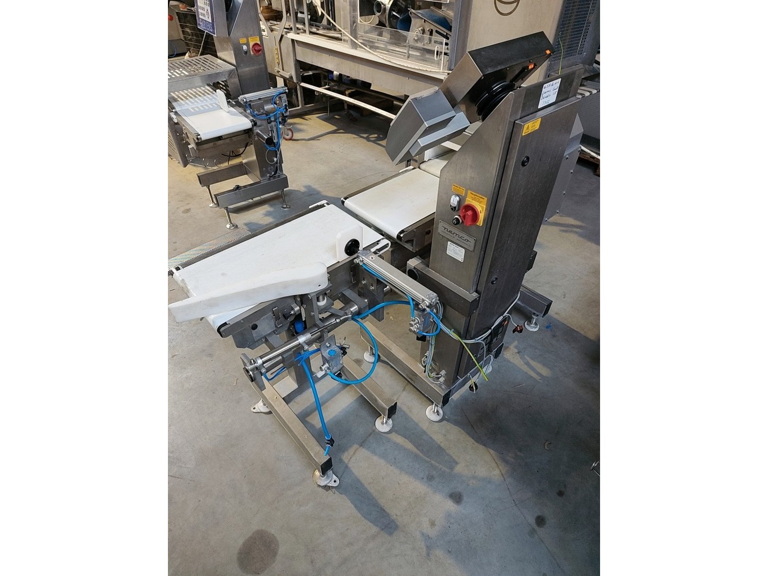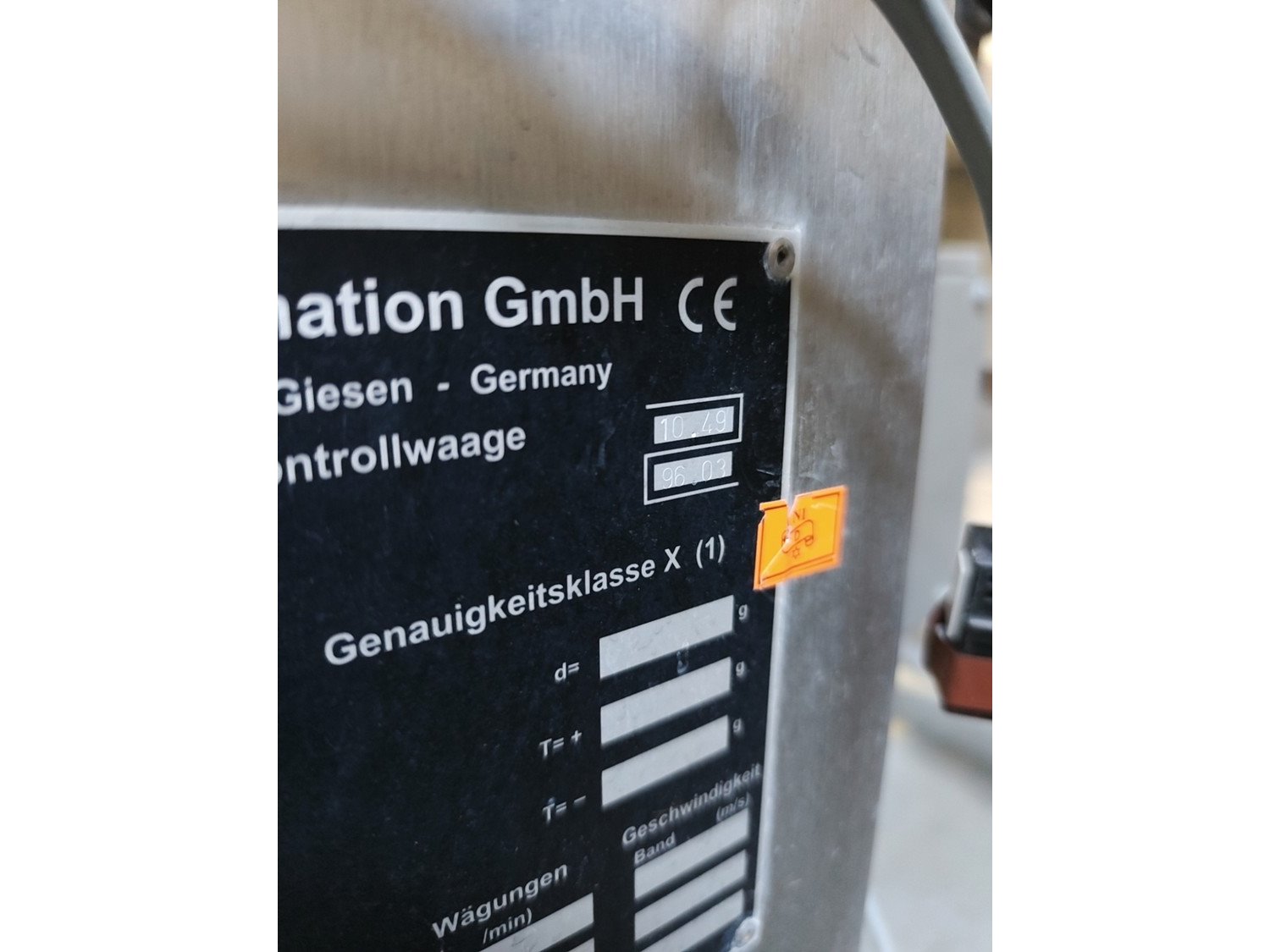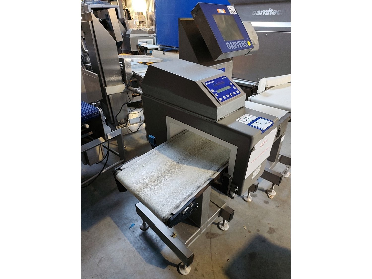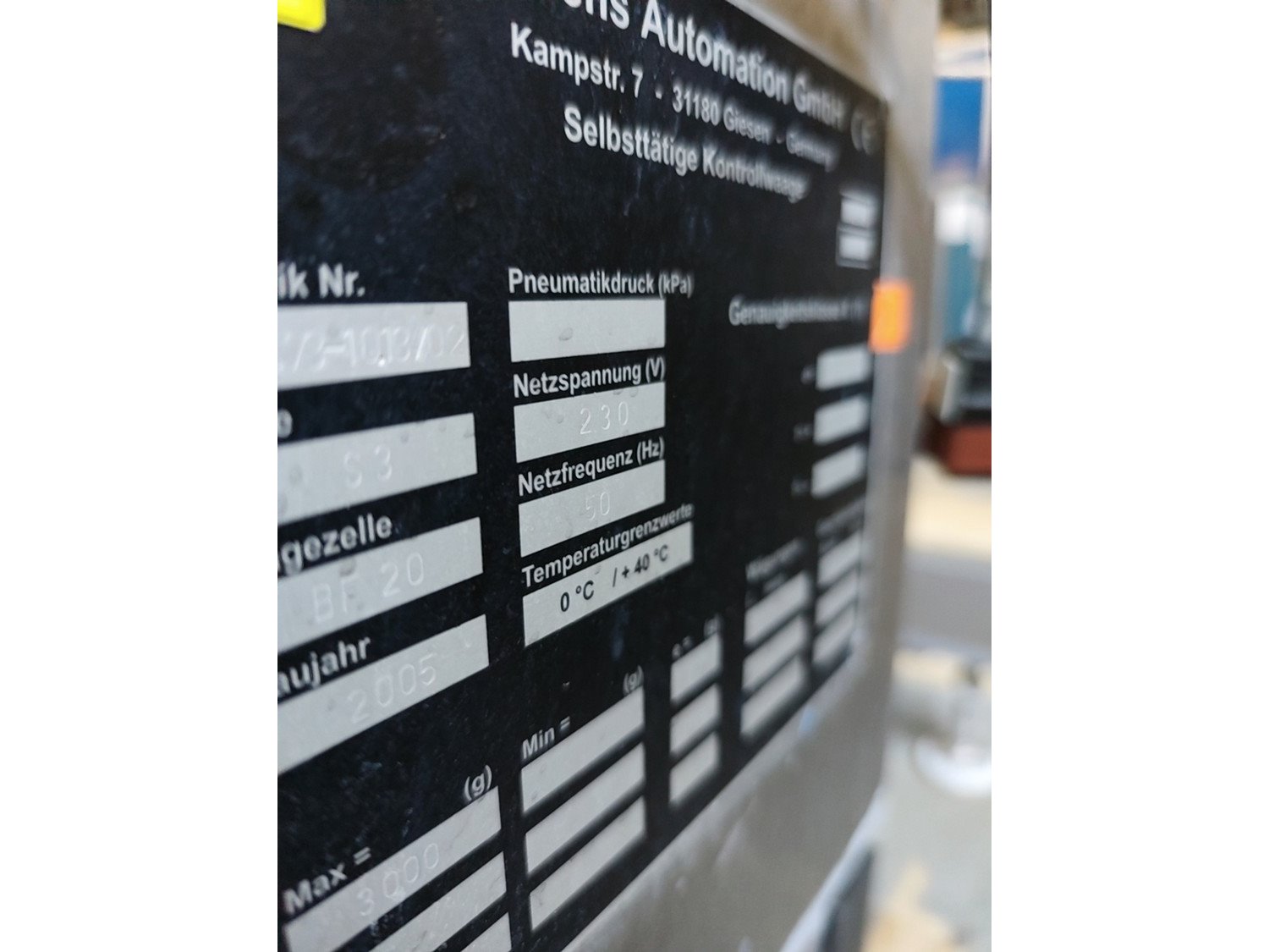 Garvens checkweigher with metal detector and rejector, model S3, serial number: 333473-10.13/02, year of construction: 2005, 230 V, 50 Hz, weigher: BF20, dimensions: 2000 mm x 730 mm x 1520 mm, dimensions transport belt with rejectors, dimensions 600 mm x 700 mm x 1050 mm.