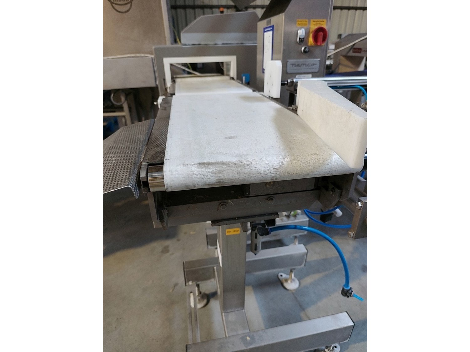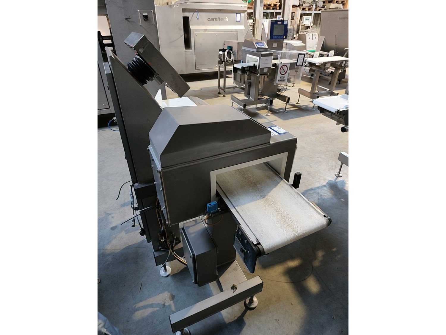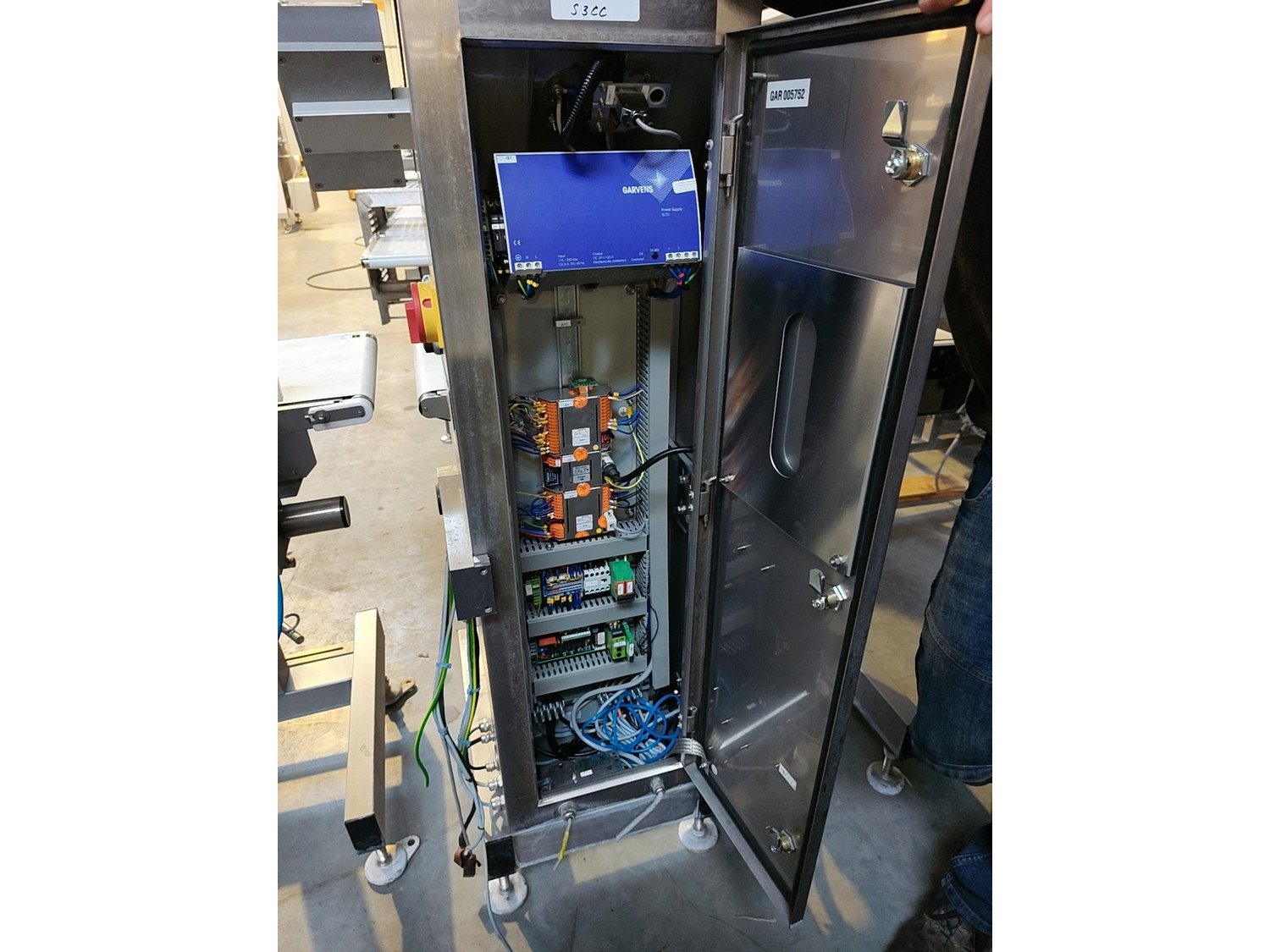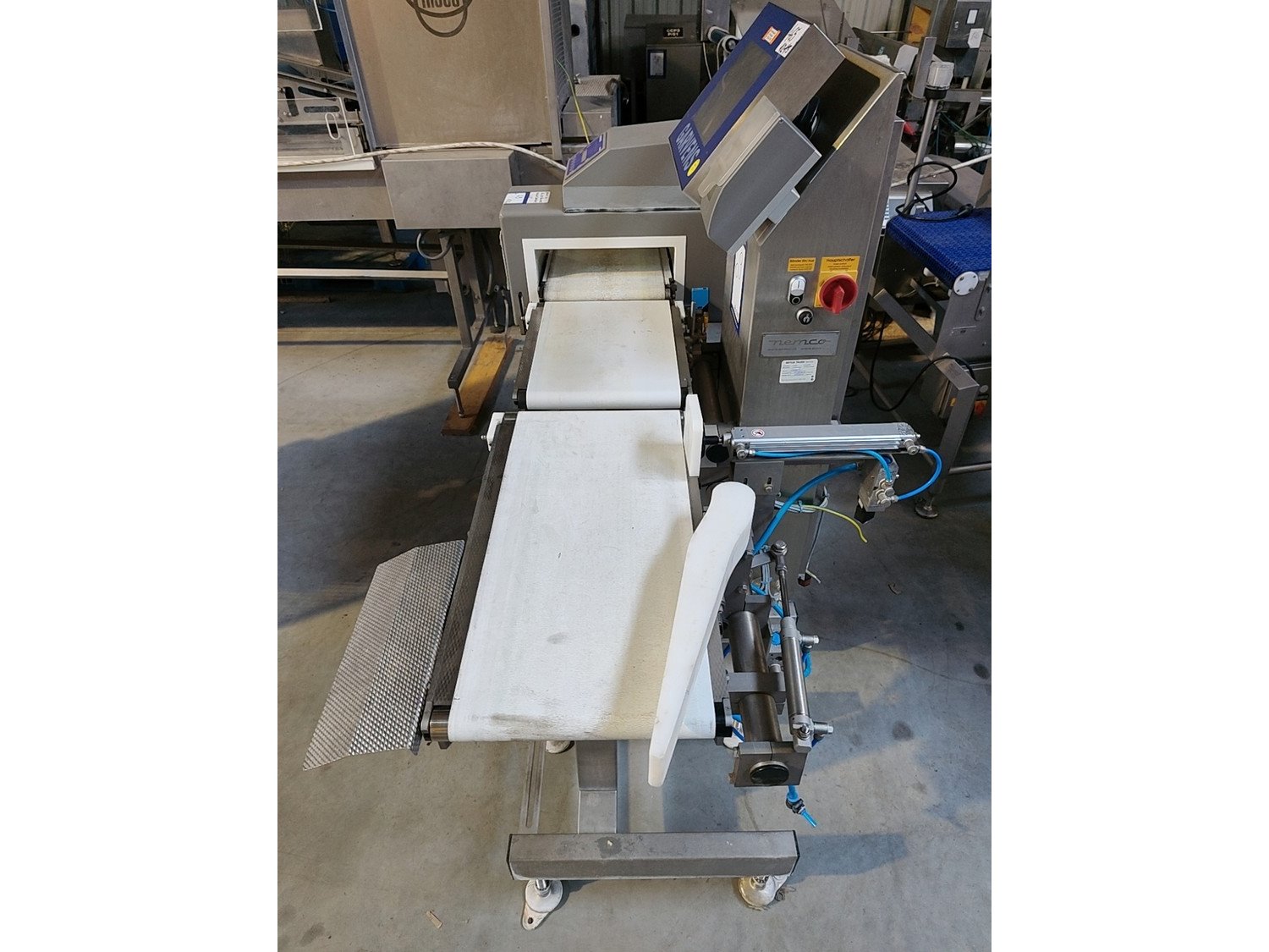 Garvens checkweigher with metal detector and rejector, model S3, serial number: 333473-10.13/02, year of construction: 2005, 230 V, 50 Hz, weigher: BF20, dimensions: 2000 mm x 730 mm x 1520 mm, dimensions transport belt with rejectors, dimensions 600 mm x 700 mm x 1050 mm.