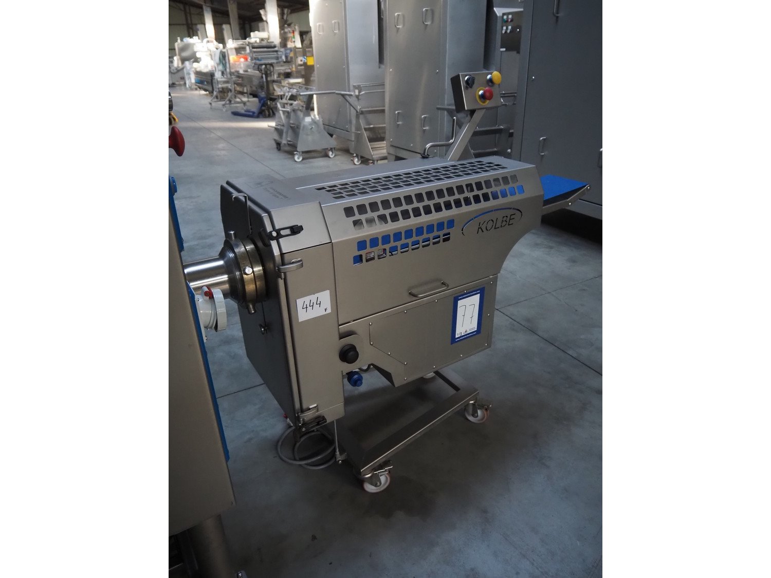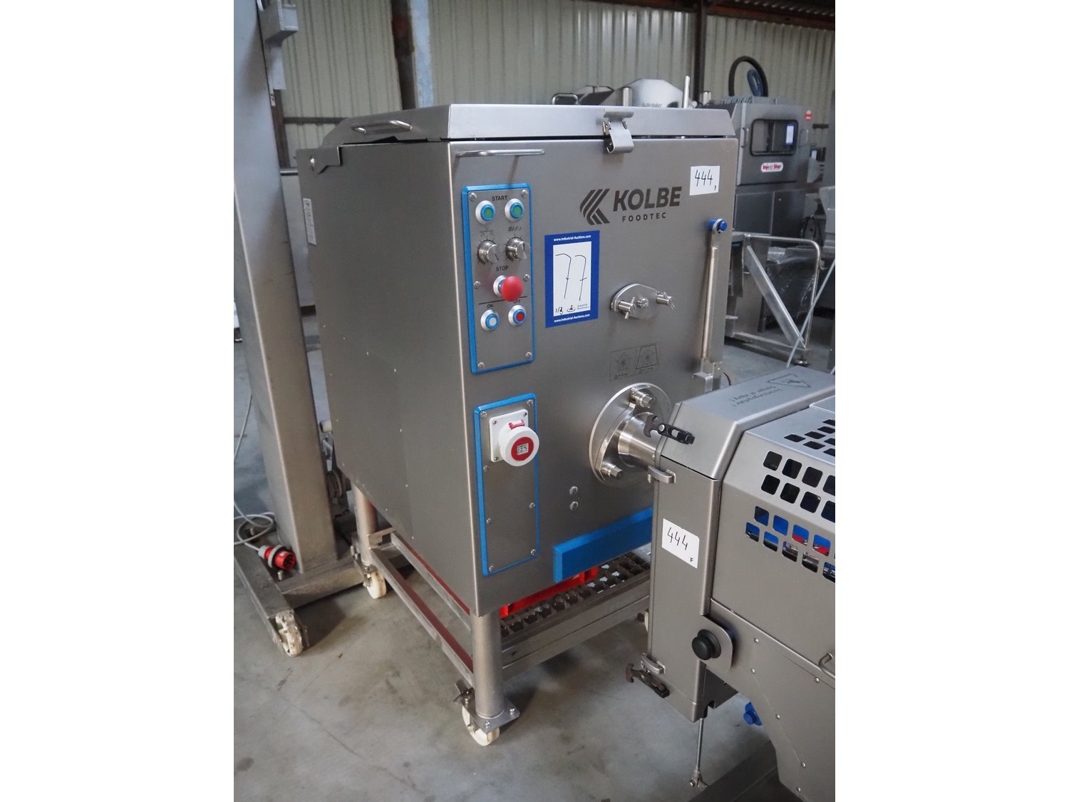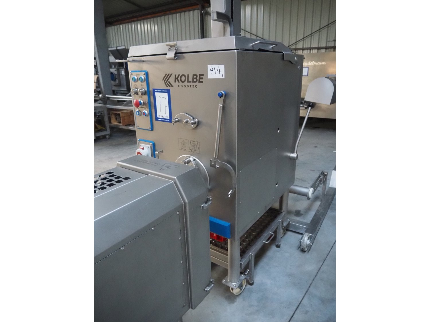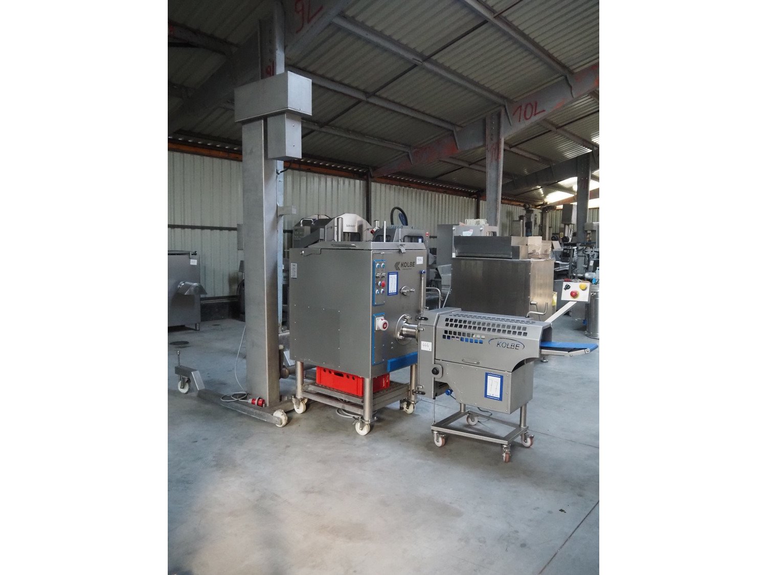 Kolbe grinding- and portioning line, consisting of: Servotech mobile lifter for 200 liter meat bins, type: PST 200, machine number: 58, year of construction: 2018, 400 V, 3 Ph, 2.1 A, 0.75 kW, weight: 300 kg, elevating height: 1900 mm, total dimensions: 1400 mm x 1700 mm x 3050 mm; Kolbe mobile mixer-grinder type: MW130-120, serial number: 128 0260, year of construction: 2018, 400 V, 3 Ph, 50 Hz, 20.5 + 2.8 A, 10 + 1.1 kW, weight: 500-560 kg, diameter plate: 175 mm, total dimensions: 1300 mm x 920 mm x 1640 mm; Kolbe mobile portioner, type: PM 150, serial number: 75 0475, year of construction: 2018, 230/400 V, 3 Ph, 50 Hz, 0.87 A, 0.25 kW, weight: 139-141 kg, plastic belt, belt width: 200 mm, total dimensions: 1450 mm x 630 mm x 1350 mm; Crate with various plates.