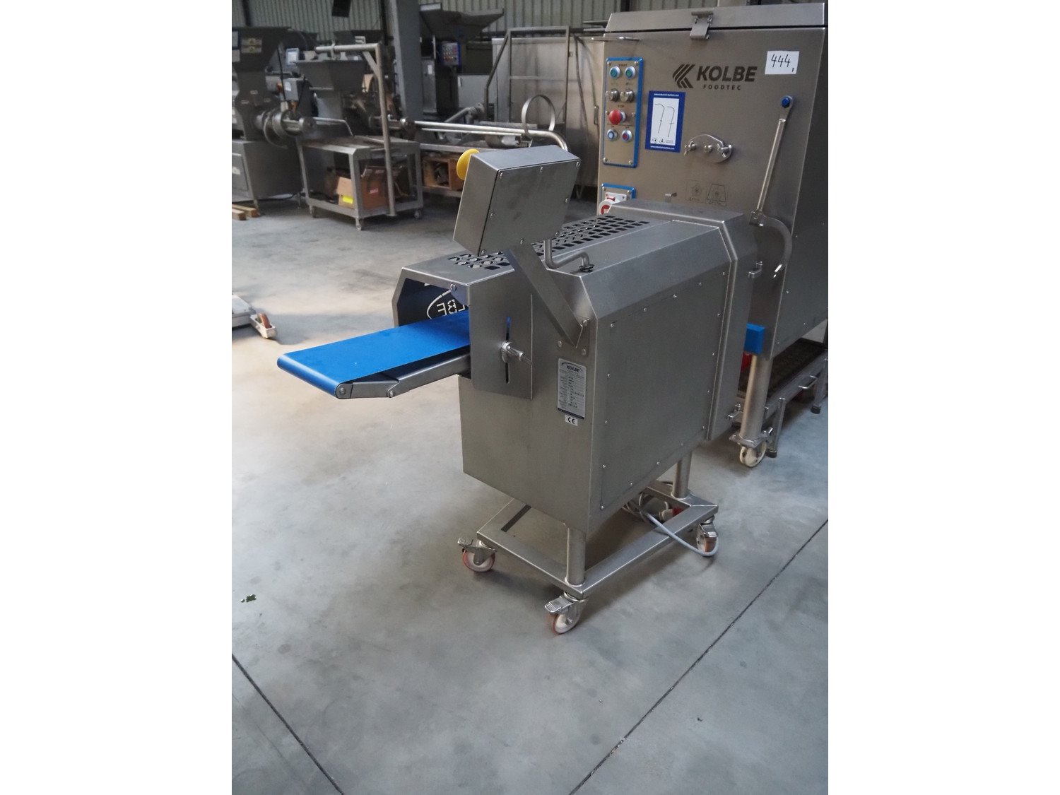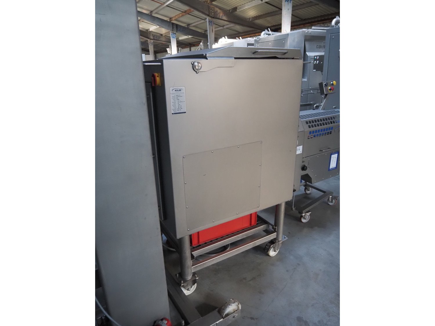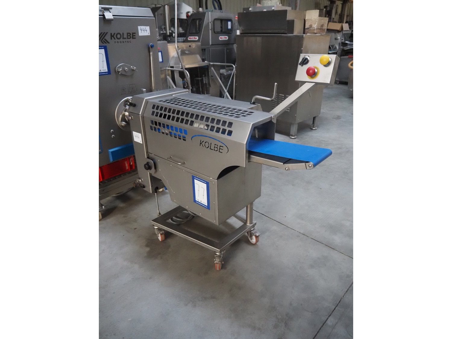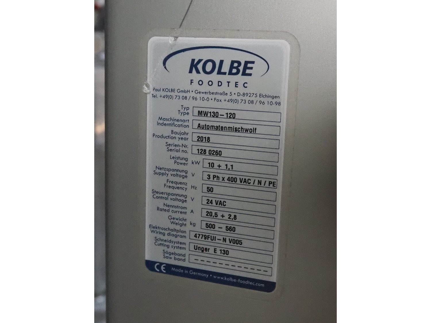 Kolbe grinding- and portioning line, consisting of: Servotech mobile lifter for 200 liter meat bins, type: PST 200, machine number: 58, year of construction: 2018, 400 V, 3 Ph, 2.1 A, 0.75 kW, weight: 300 kg, elevating height: 1900 mm, total dimensions: 1400 mm x 1700 mm x 3050 mm; Kolbe mobile mixer-grinder type: MW130-120, serial number: 128 0260, year of construction: 2018, 400 V, 3 Ph, 50 Hz, 20.5 + 2.8 A, 10 + 1.1 kW, weight: 500-560 kg, diameter plate: 175 mm, total dimensions: 1300 mm x 920 mm x 1640 mm; Kolbe mobile portioner, type: PM 150, serial number: 75 0475, year of construction: 2018, 230/400 V, 3 Ph, 50 Hz, 0.87 A, 0.25 kW, weight: 139-141 kg, plastic belt, belt width: 200 mm, total dimensions: 1450 mm x 630 mm x 1350 mm; Crate with various plates.