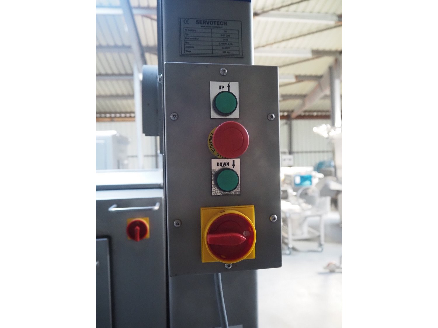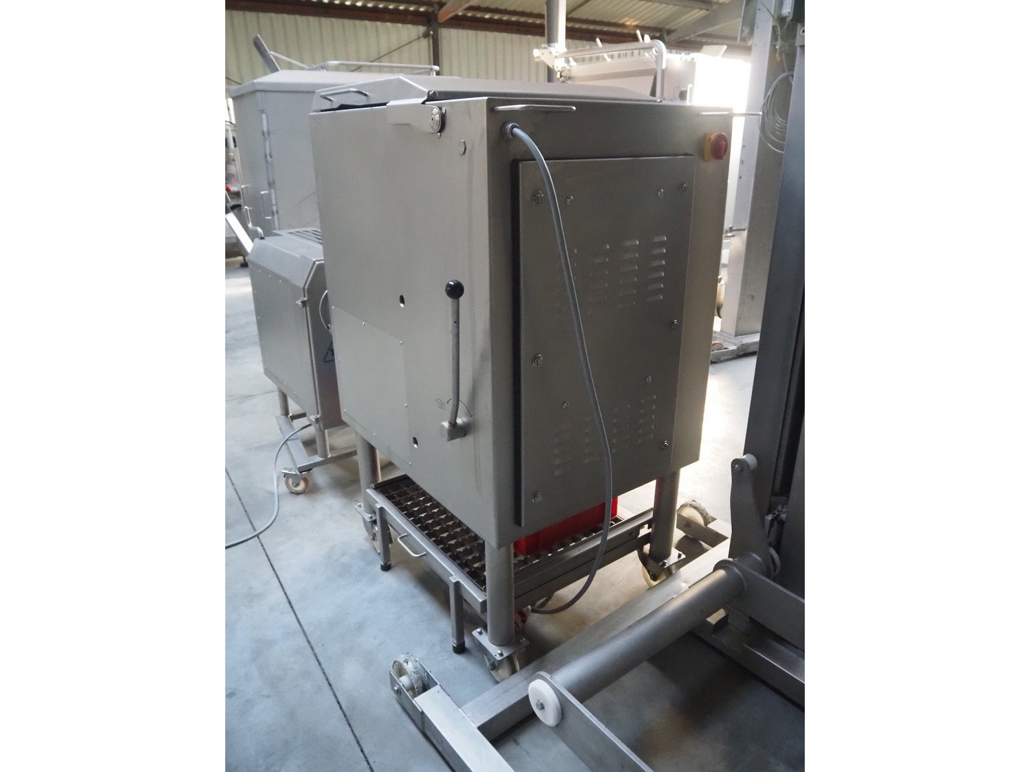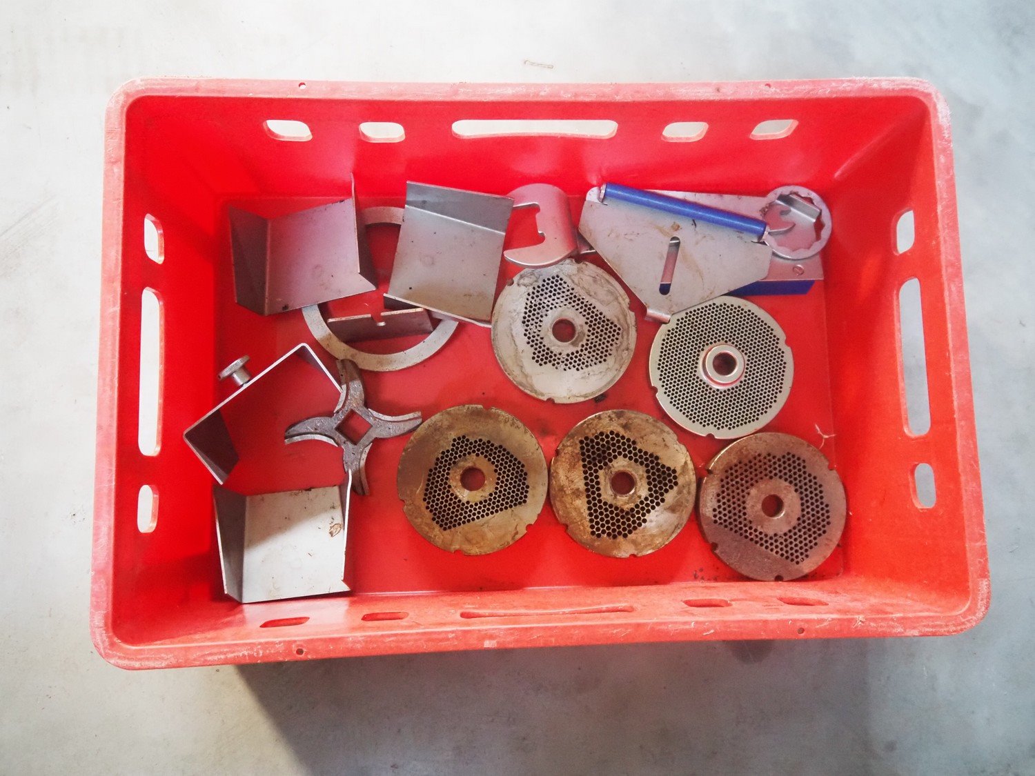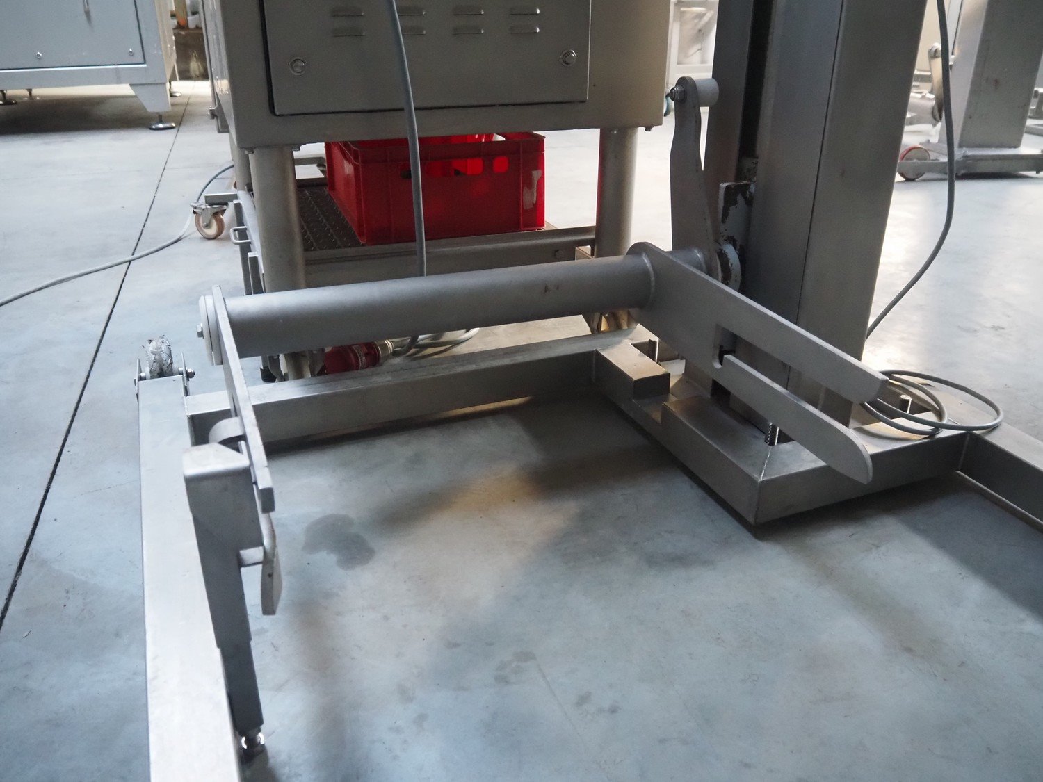 Kolbe grinding- and portioning line, consisting of: Servotech mobile lifter for 200 liter meat bins, type: PST 200, machine number: 58, year of construction: 2018, 400 V, 3 Ph, 2.1 A, 0.75 kW, weight: 300 kg, elevating height: 1900 mm, total dimensions: 1400 mm x 1700 mm x 3050 mm; Kolbe mobile mixer-grinder type: MW130-120, serial number: 128 0260, year of construction: 2018, 400 V, 3 Ph, 50 Hz, 20.5 + 2.8 A, 10 + 1.1 kW, weight: 500-560 kg, diameter plate: 175 mm, total dimensions: 1300 mm x 920 mm x 1640 mm; Kolbe mobile portioner, type: PM 150, serial number: 75 0475, year of construction: 2018, 230/400 V, 3 Ph, 50 Hz, 0.87 A, 0.25 kW, weight: 139-141 kg, plastic belt, belt width: 200 mm, total dimensions: 1450 mm x 630 mm x 1350 mm; Crate with various plates.