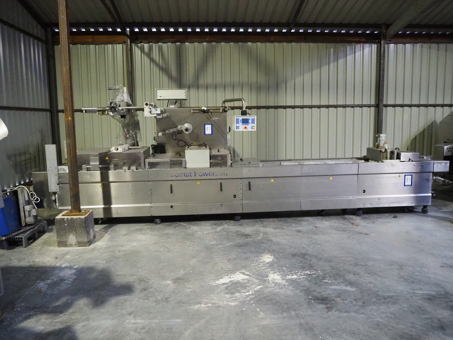 Tiromat thermoformer, type: Powerpack/680, number: 681/0245-98, dye: (4x) 250 mm x 115 mm, total dimensions: 7000 mm x 1300 mm x 2400 mm. Including outfeed belt, plastic belt, belt width: 600 mm, dimensions: 1500 mm x 800 mm x 600 mm. Without vacuum pump.