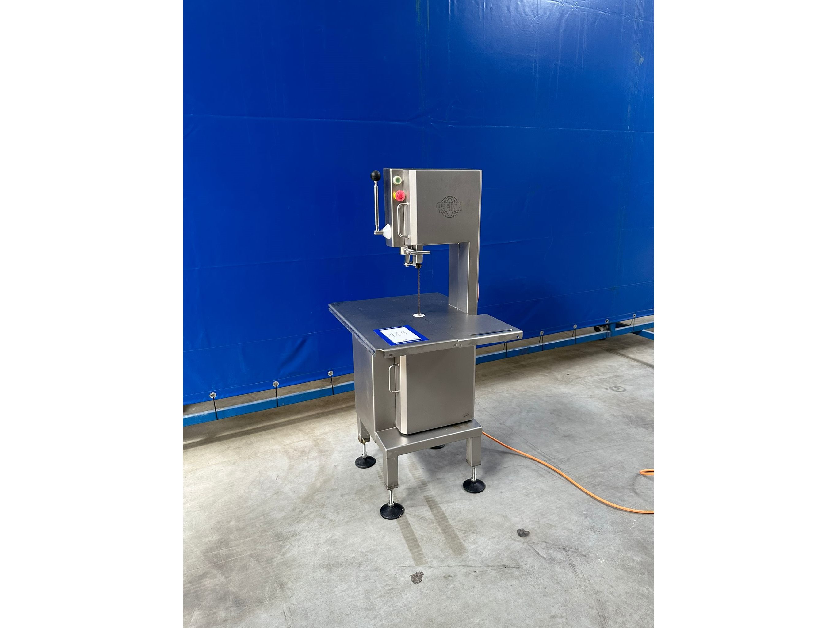 Reich bandsaw, table dimensions: 700 mm x 500 mm, total dimensions: 700 mm x 600 mm x 140 mm.