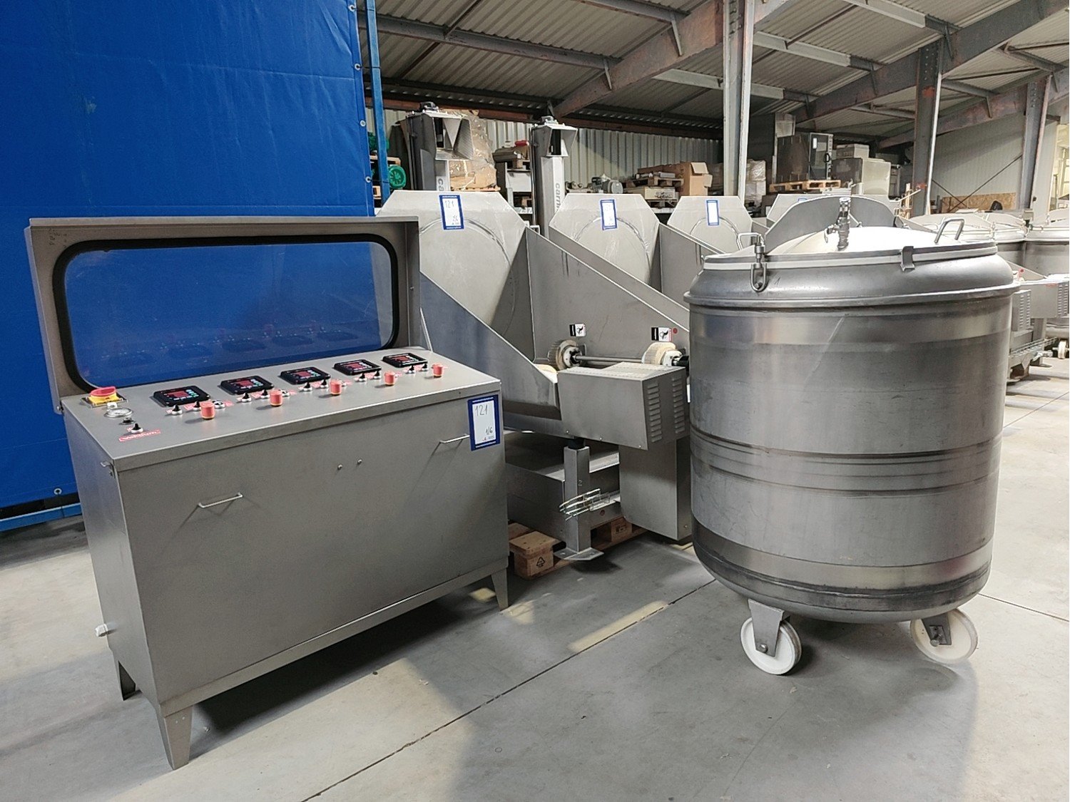 Inject Star vacuum tumblers, model: HS 5, capacity: 500 liter, weight of raw material : 250-350 kg, voltage : 400 V, 3 Ph, 50 Hz, turnover regulation: Mechanical, vacuum tumbler weight : 700 kg. Five removable barrels in the set.