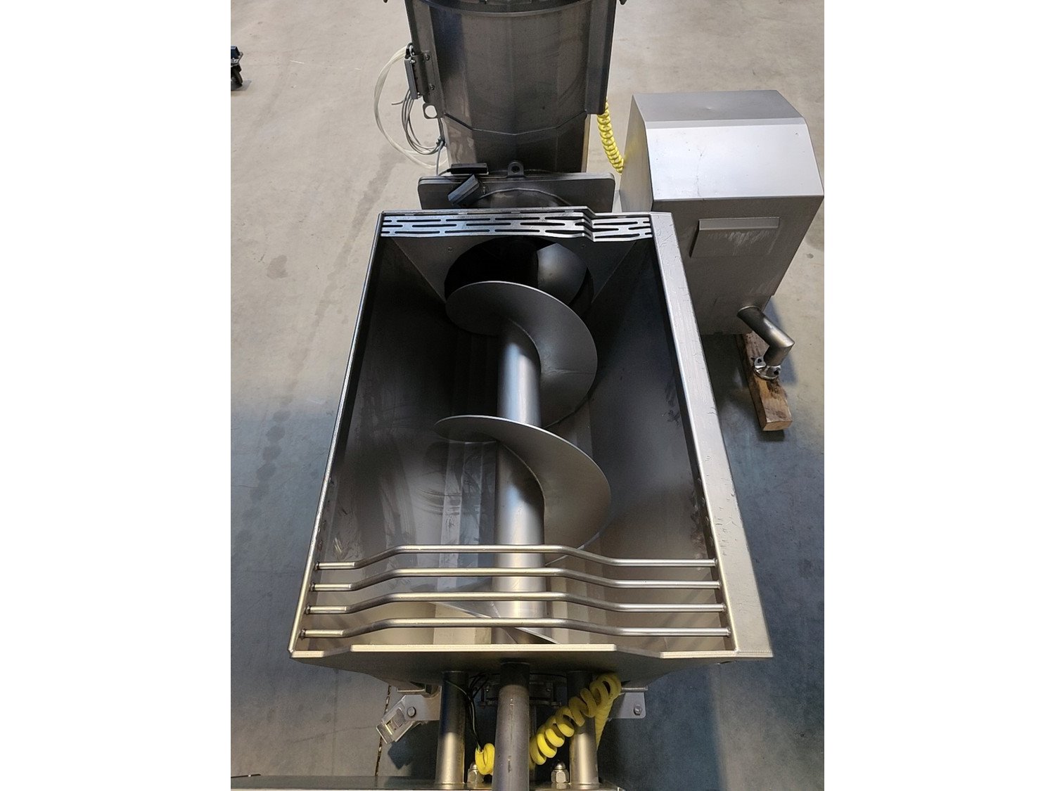Alco infeed bunker with elevating screw, weight: approx. 800 kg, elevating height: 1950 mm, total dimensions: 2300 x 2300 x 3400 mm.