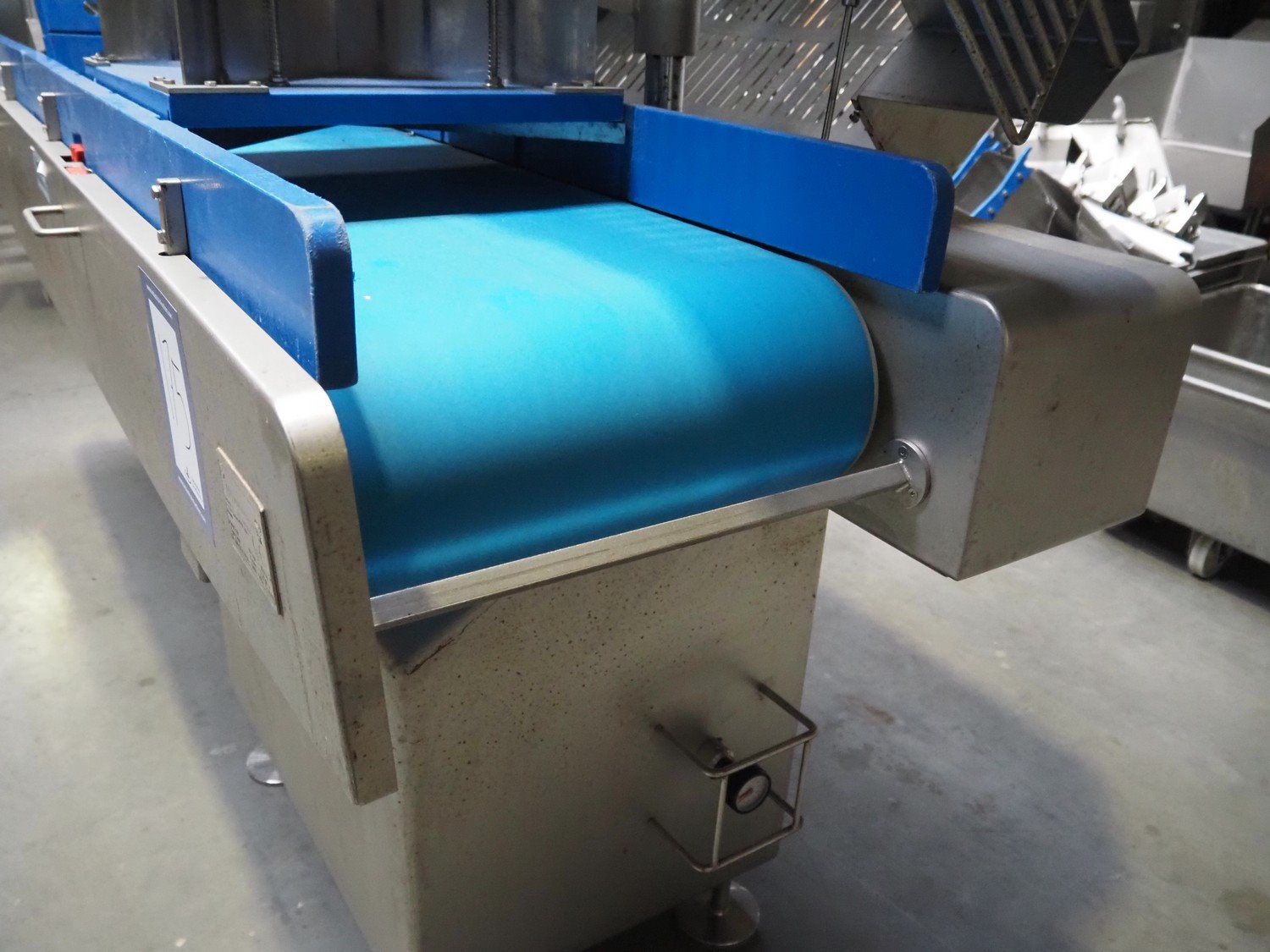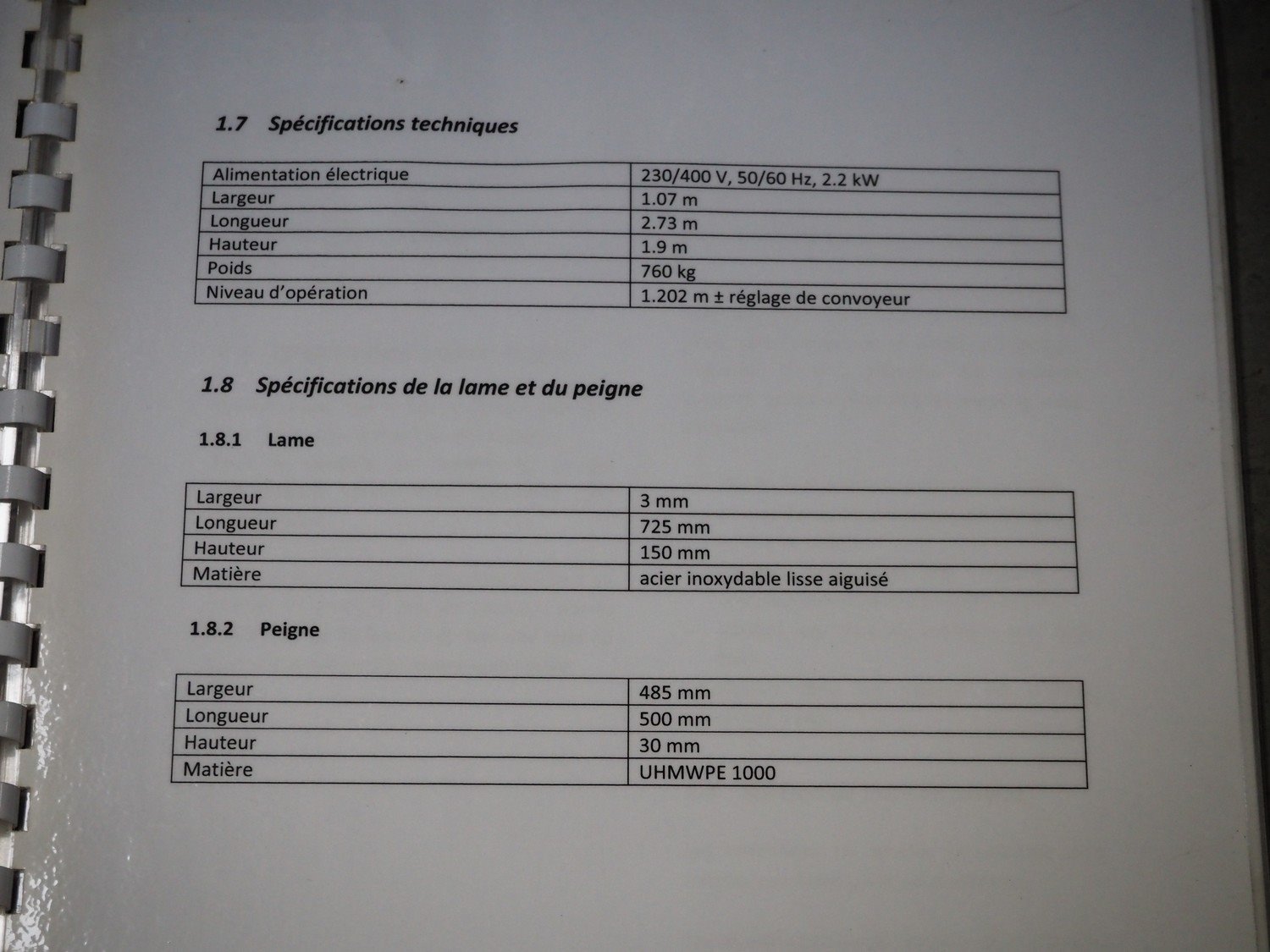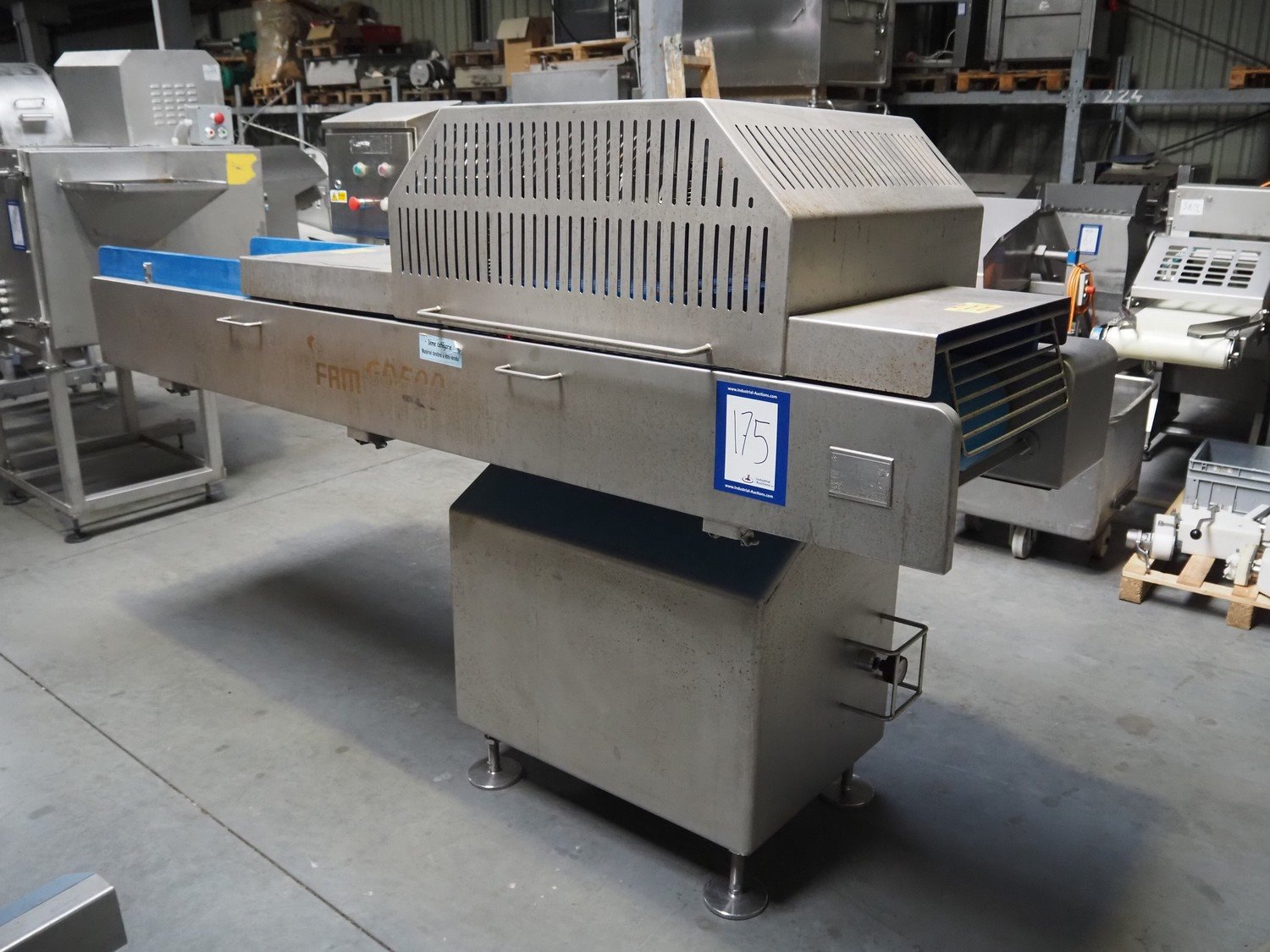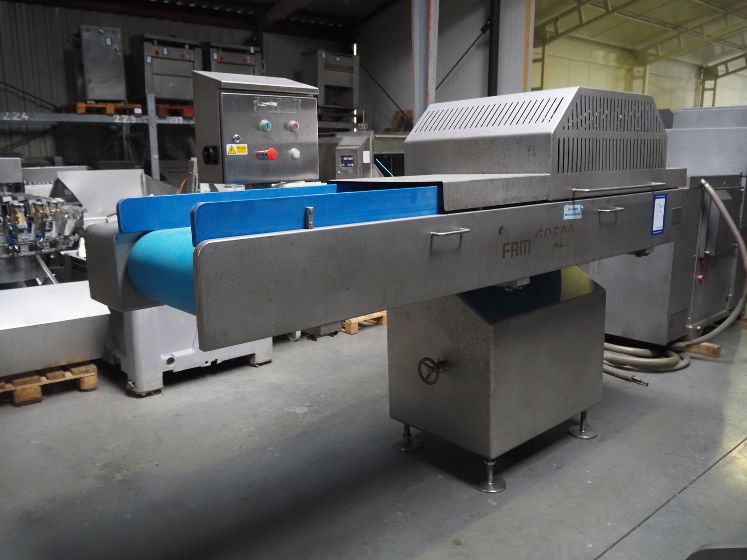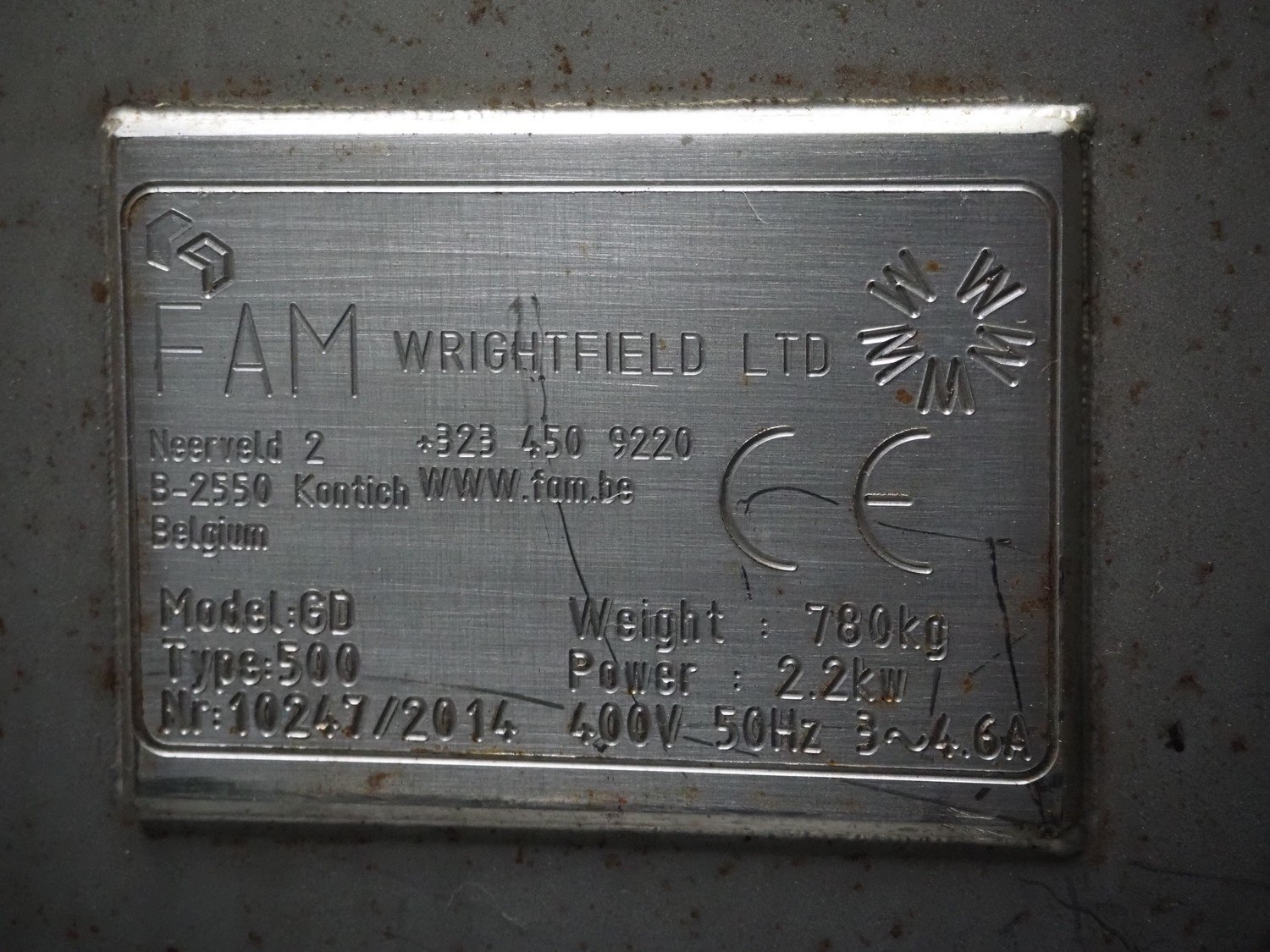 FAM guillotine slicer/dicer, model: GD, type: 500, number: 10247/2014, 400 V, 3 Ph, 50 Hz, 4.6 A, 2.2 kW, weight: 780 kg, plastic belt, belt width: 490 mm, X-knife, knife dimensions: 445 mm x 445 mm, total dimensions: 2750 mm x 1000 mm x 1760 mm.