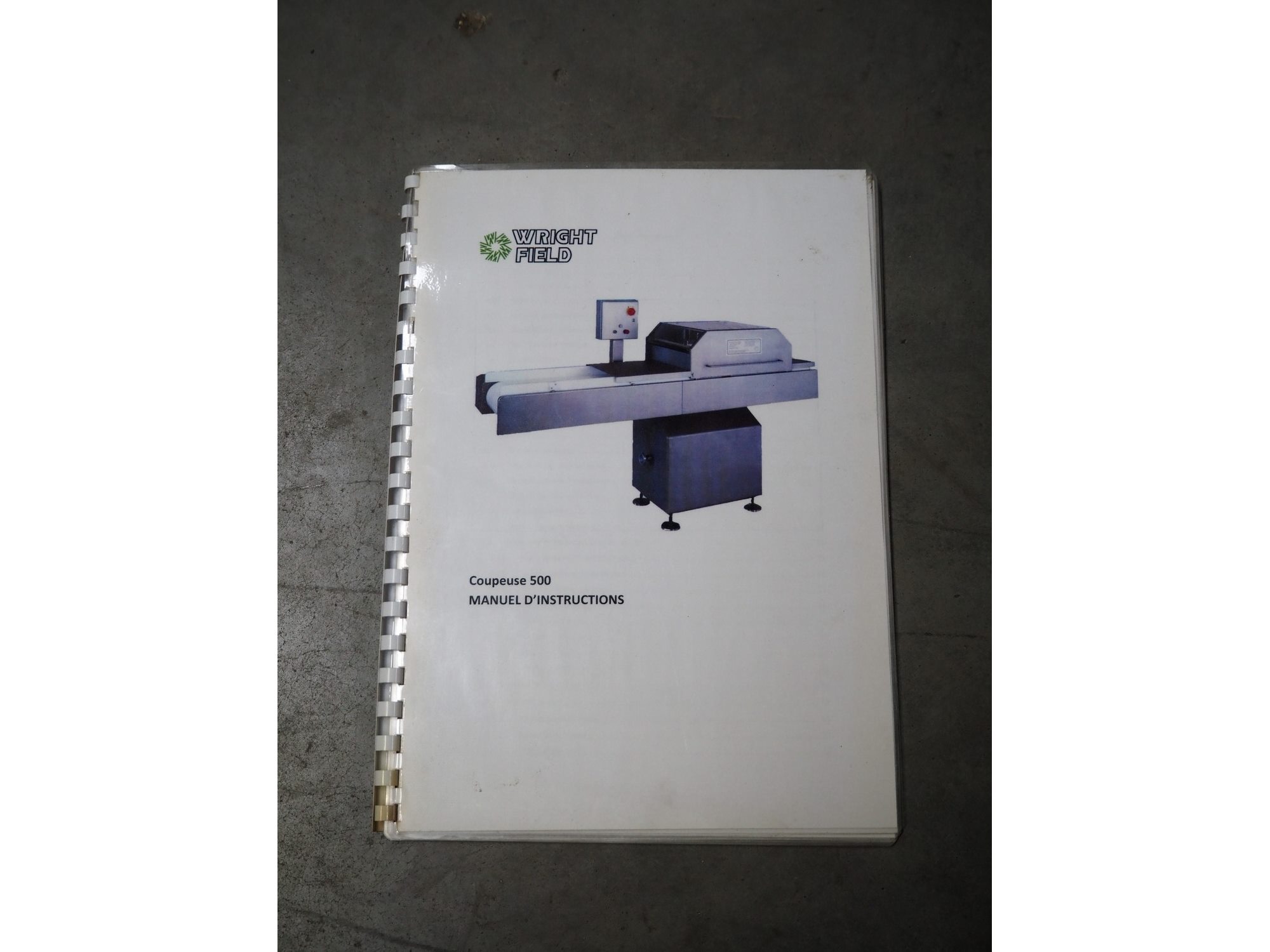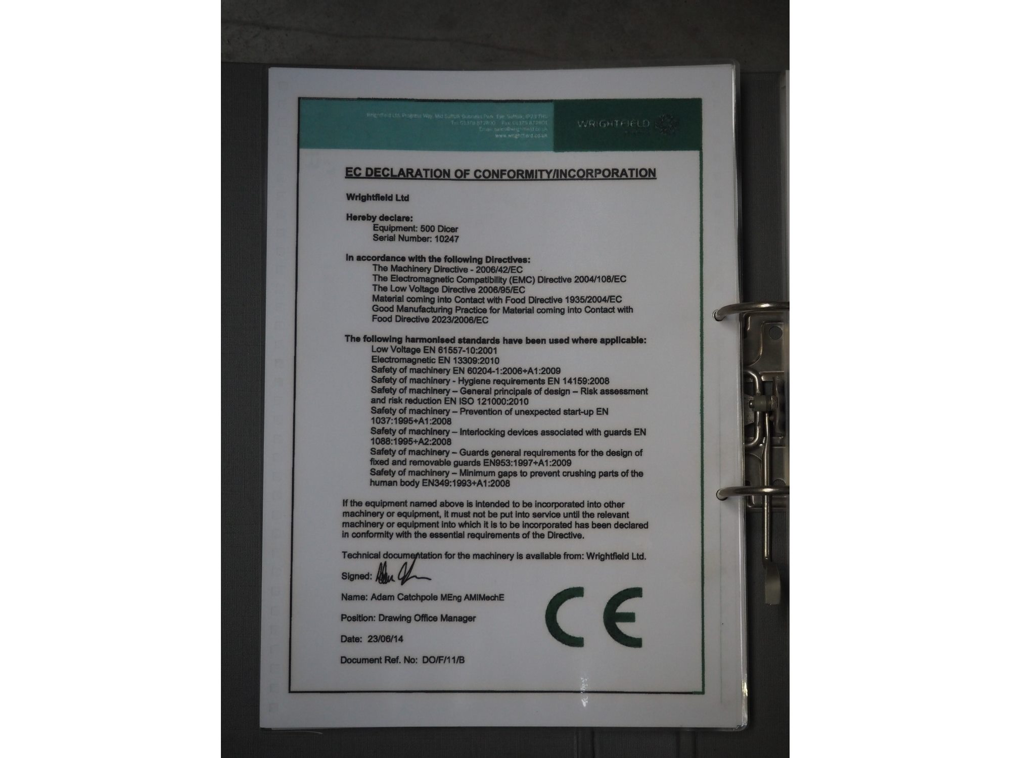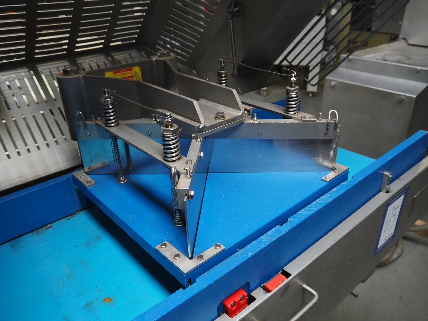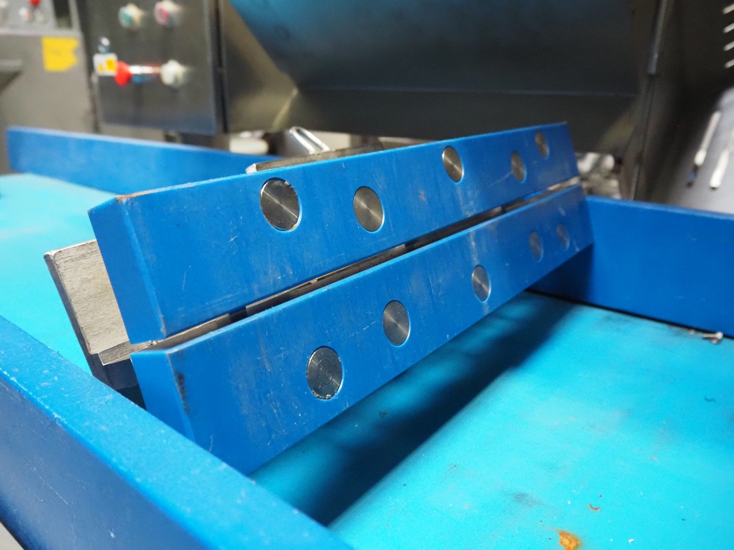 FAM guillotine slicer/dicer, model: GD, type: 500, number: 10247/2014, 400 V, 3 Ph, 50 Hz, 4.6 A, 2.2 kW, weight: 780 kg, plastic belt, belt width: 490 mm, X-knife, knife dimensions: 445 mm x 445 mm, total dimensions: 2750 mm x 1000 mm x 1760 mm.