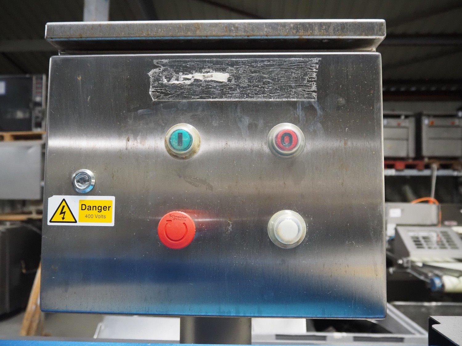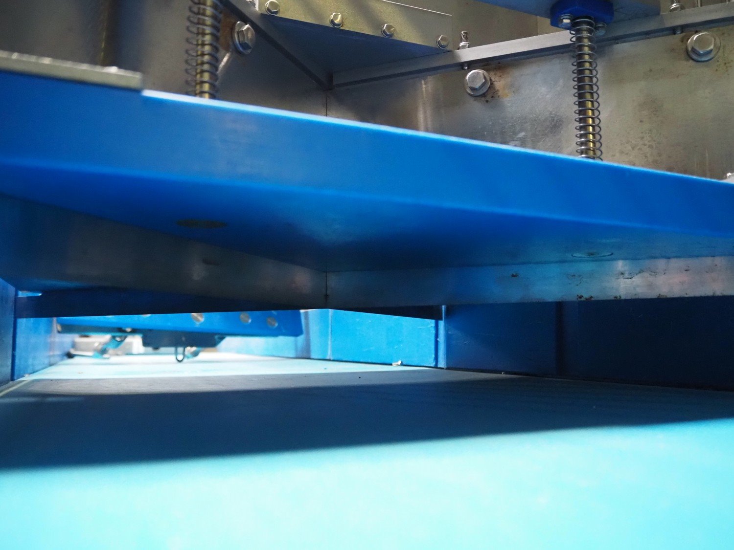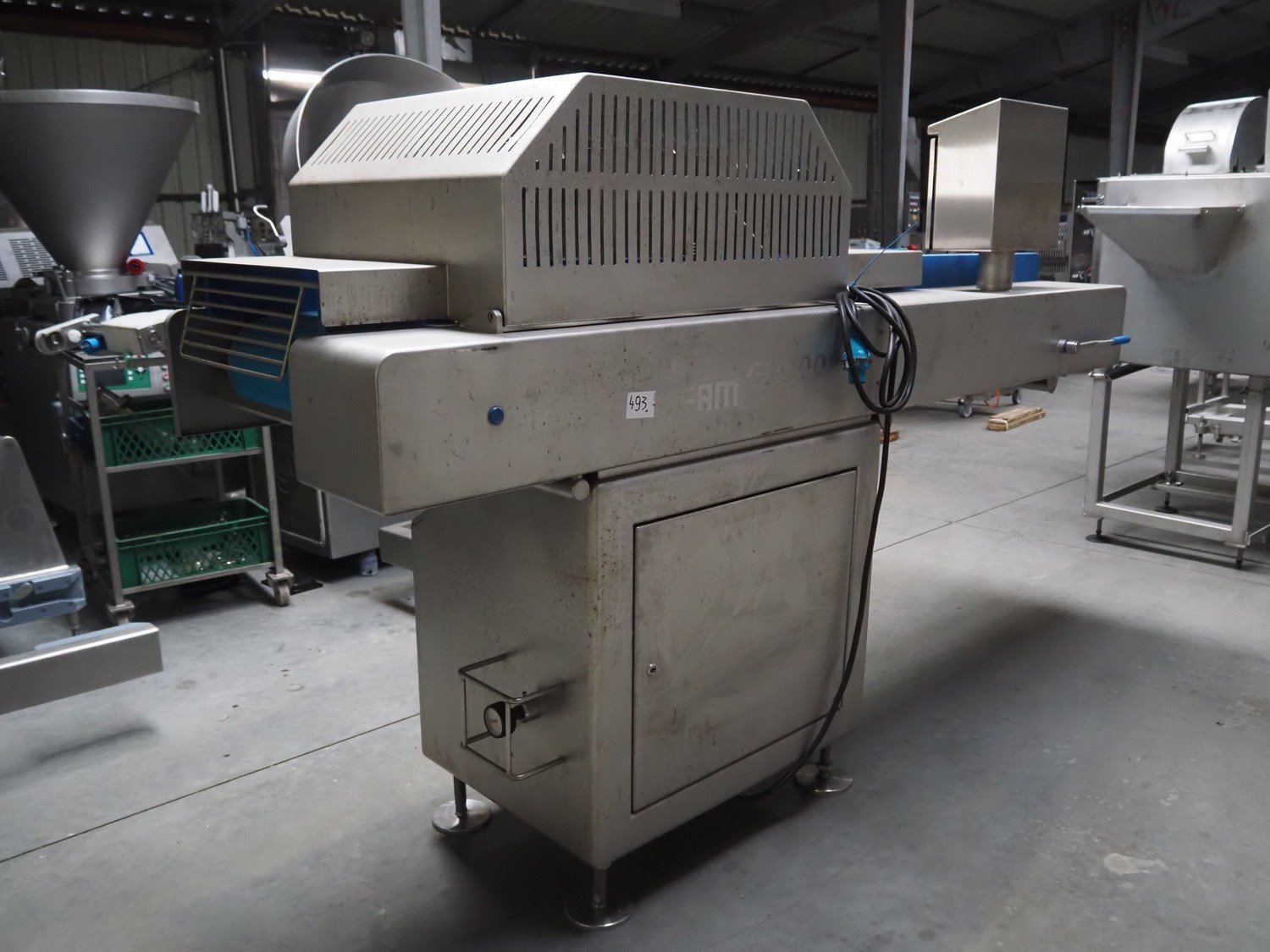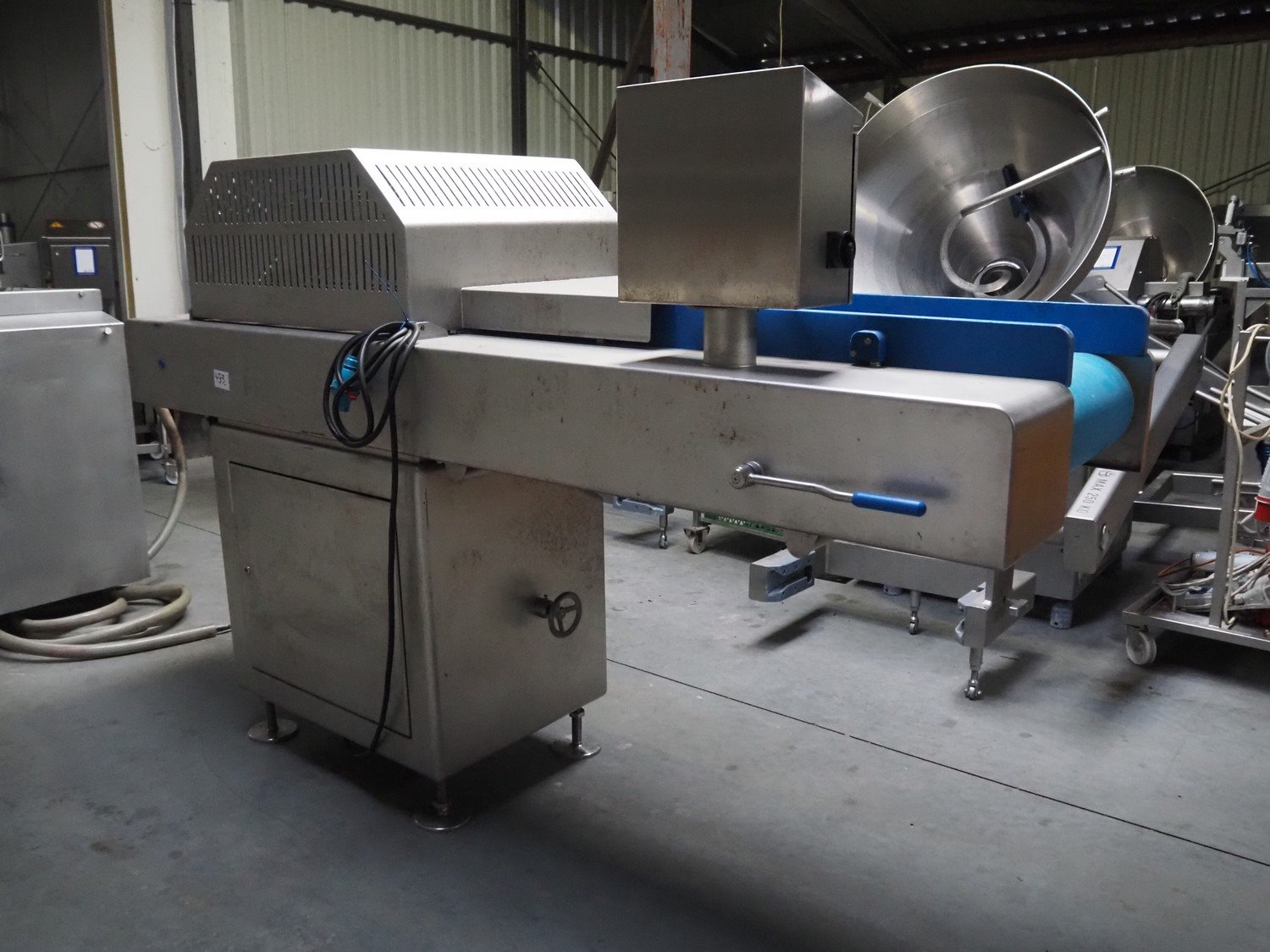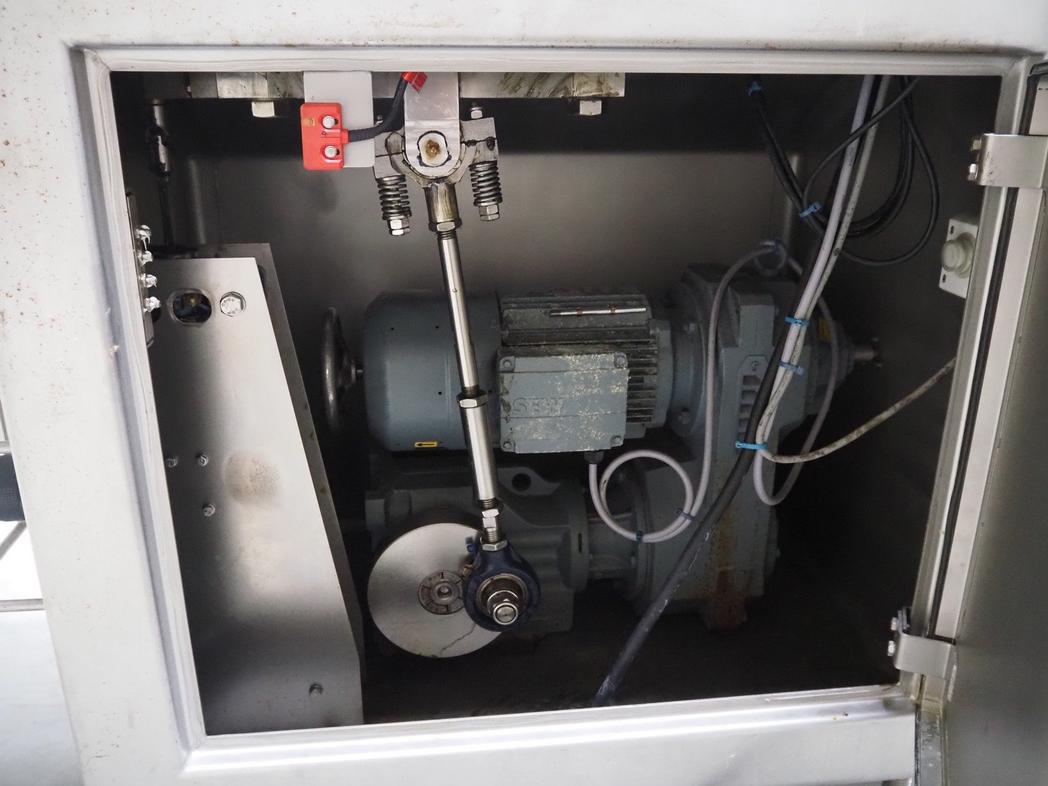 FAM guillotine slicer/dicer, model: GD, type: 500, number: 10247/2014, 400 V, 3 Ph, 50 Hz, 4.6 A, 2.2 kW, weight: 780 kg, plastic belt, belt width: 490 mm, X-knife, knife dimensions: 445 mm x 445 mm, total dimensions: 2750 mm x 1000 mm x 1760 mm.