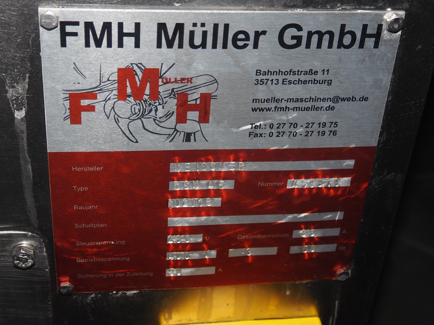 Meissner bowl cutter, type: RSM45, number: 458918, year of construction: 2018, 230/400 V, 3 Ph, 50 Hz, 39/50 A, s/s bowl and knives, capacity: 45 liter, dimensions: 1110 mm x 1300 mm x 1250 mm.