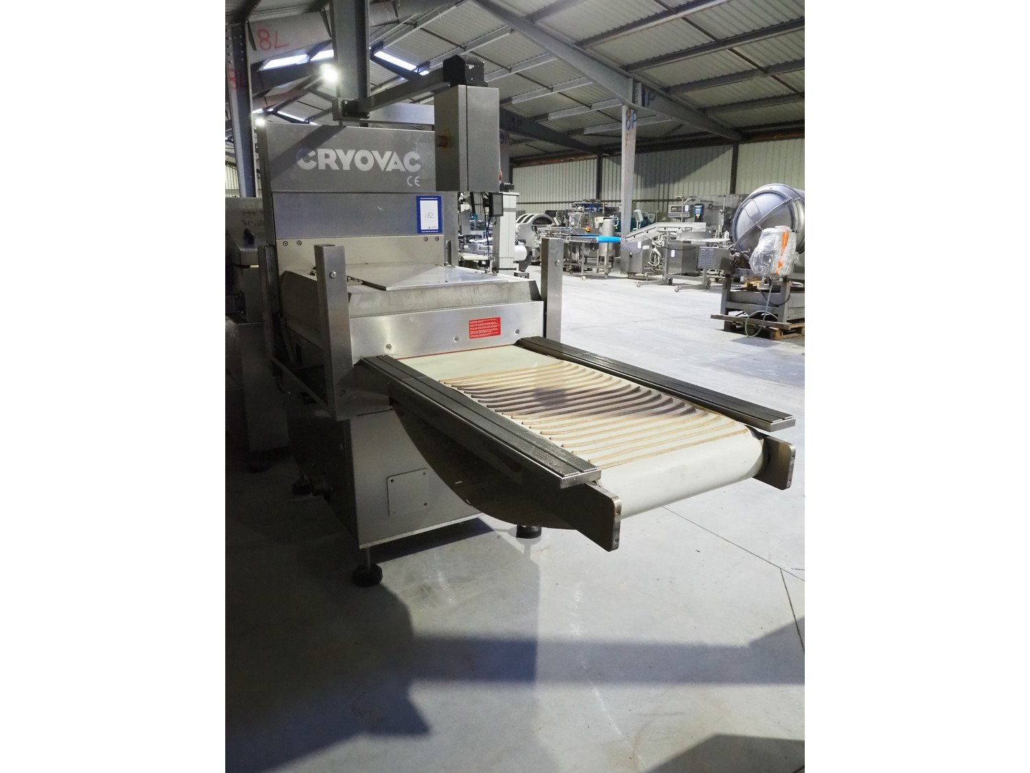 Cryovac belt vacuum machine, model: VS 85, serial number: A03600404, year of construction: 1998, 400 V, 3 Ph, 50 Hz, 20 A, 7 kW, plastic belt, belt width: 535 mm, total dimensions: 2600 mm x 1100 mm x 2050 mm.