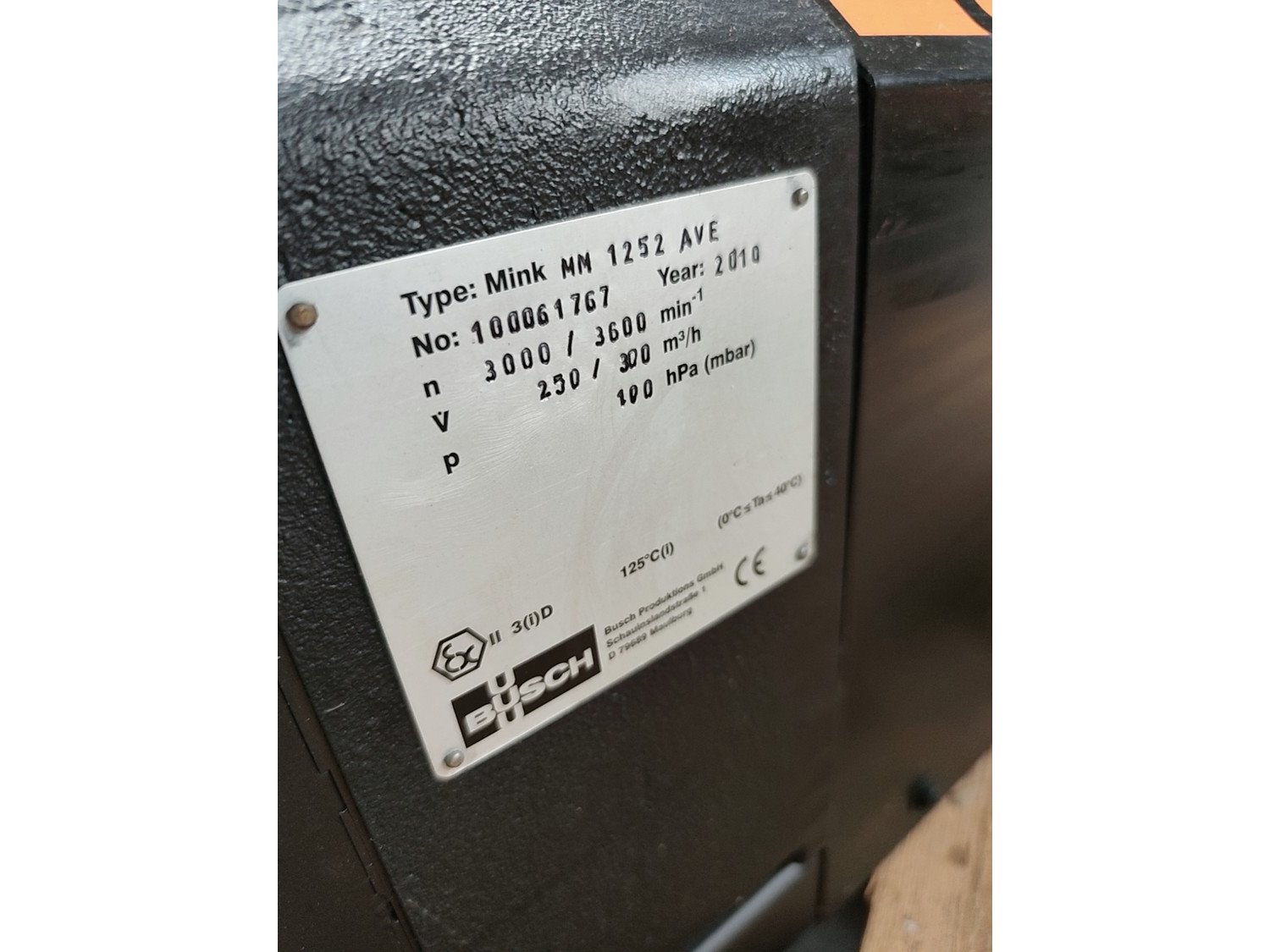 Busch vacuum Pump, type: Mink MM 1252 AVE, serial number: 100061767, year of construction: 2010, 3000/3600 min-1, capacity: 250/300 m3/h, 100hPa (mbar), dimensions: 1200 mm x 520 mm x 850 mm.