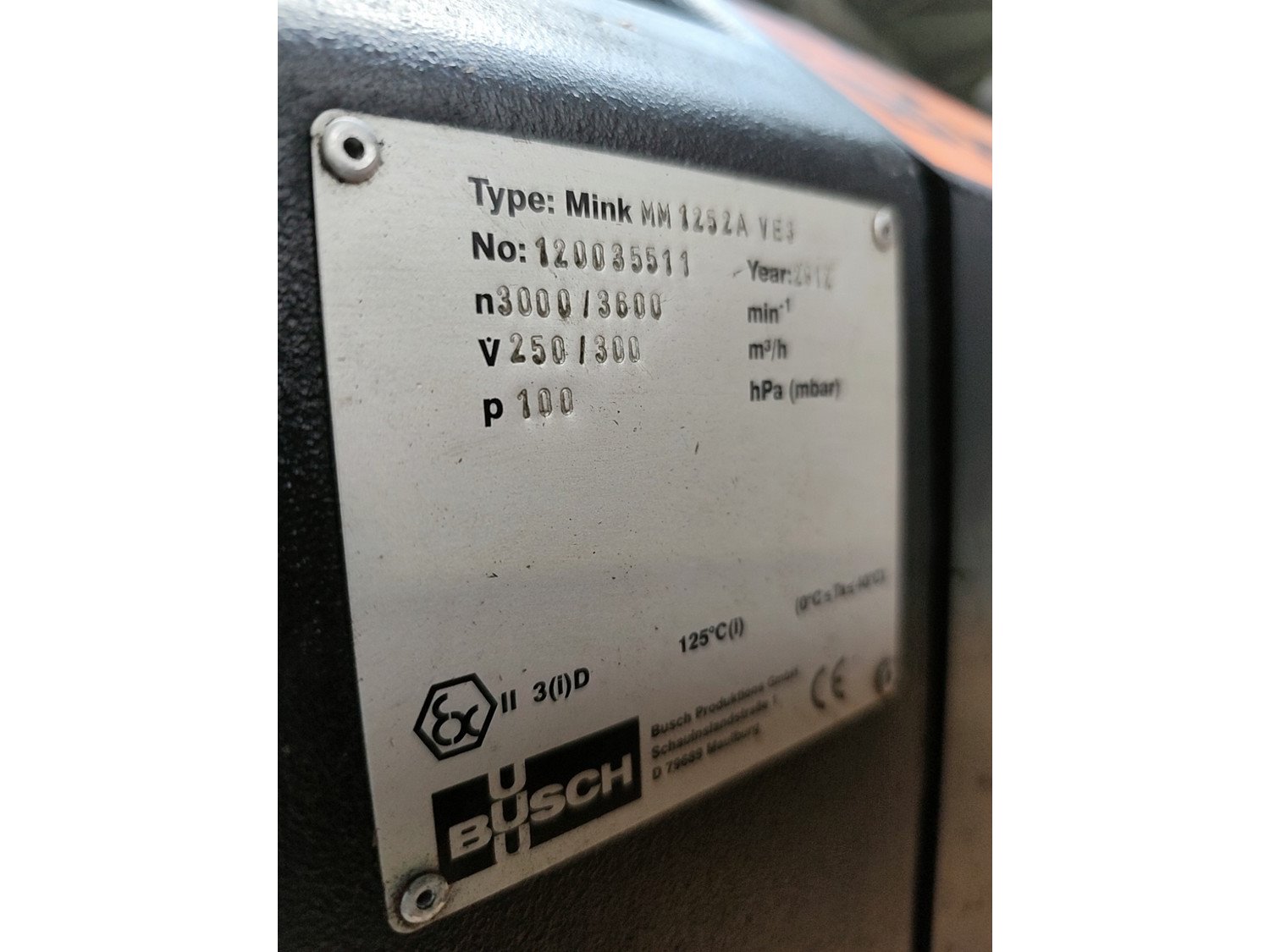 Busch vacuum Pump, type: Mink MM 1252A VE3, serial number: 110035511, year of construction: 2012, 3000/3600 min-1, capacity: 250/300 m3/h, 100hPa (mbar), dimensions: 1200 mm x 520 mm x 850 mm.