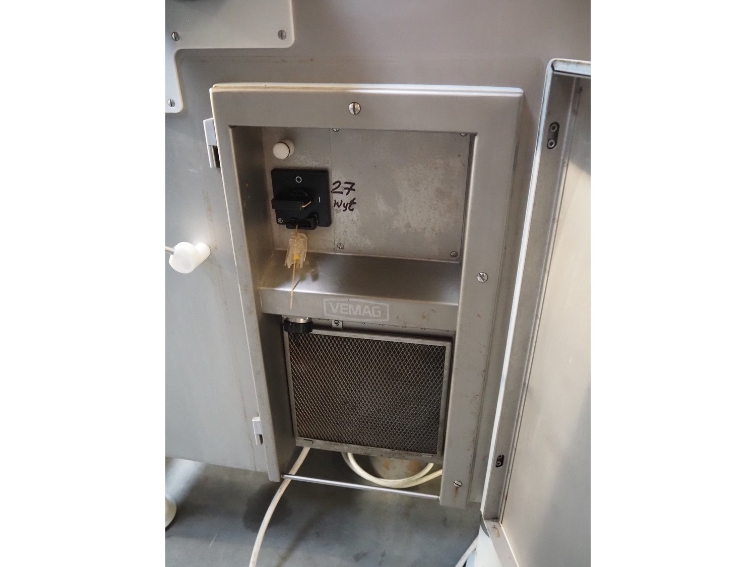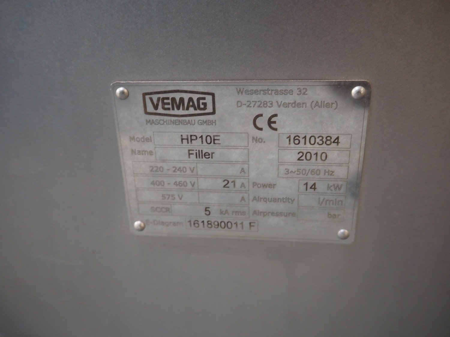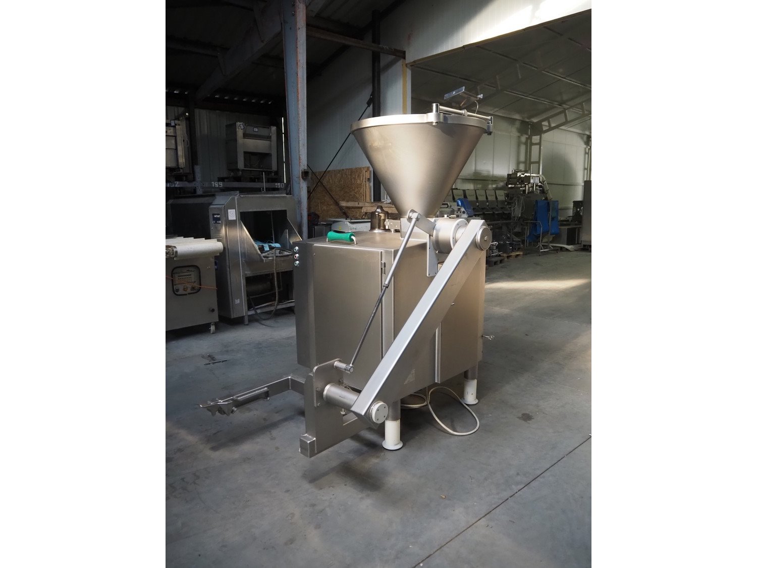 Vemag Maschinenbau GmbH vacuum filling machine with lifter for 200 liter meat bins, type: HP10E, number: 1610384, year of construction: 2010, 400-460 V, 3 Ph, 50/60 Hz, 21 A, 14 kW, dimensions: 2100 mm x 1500 mm x 2400 mm.