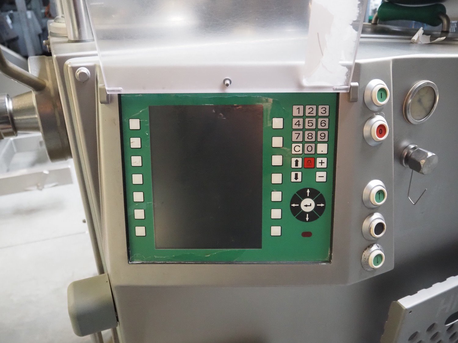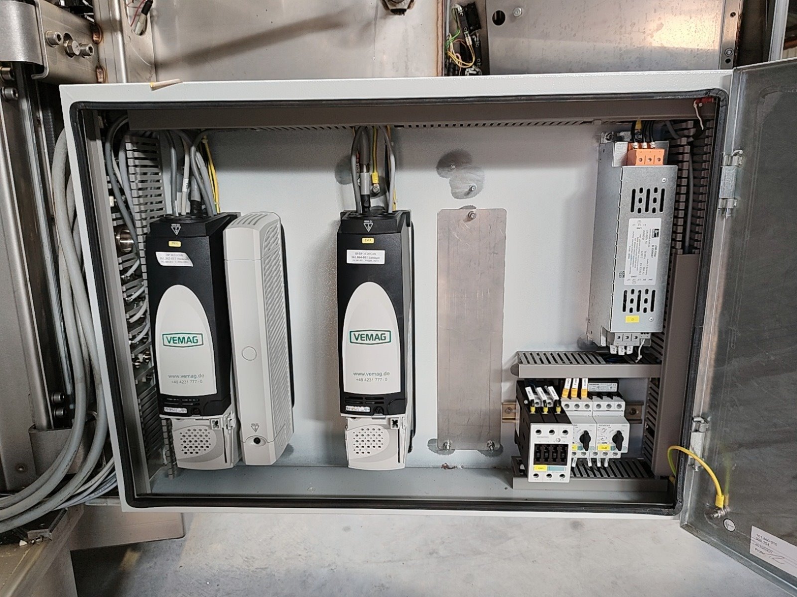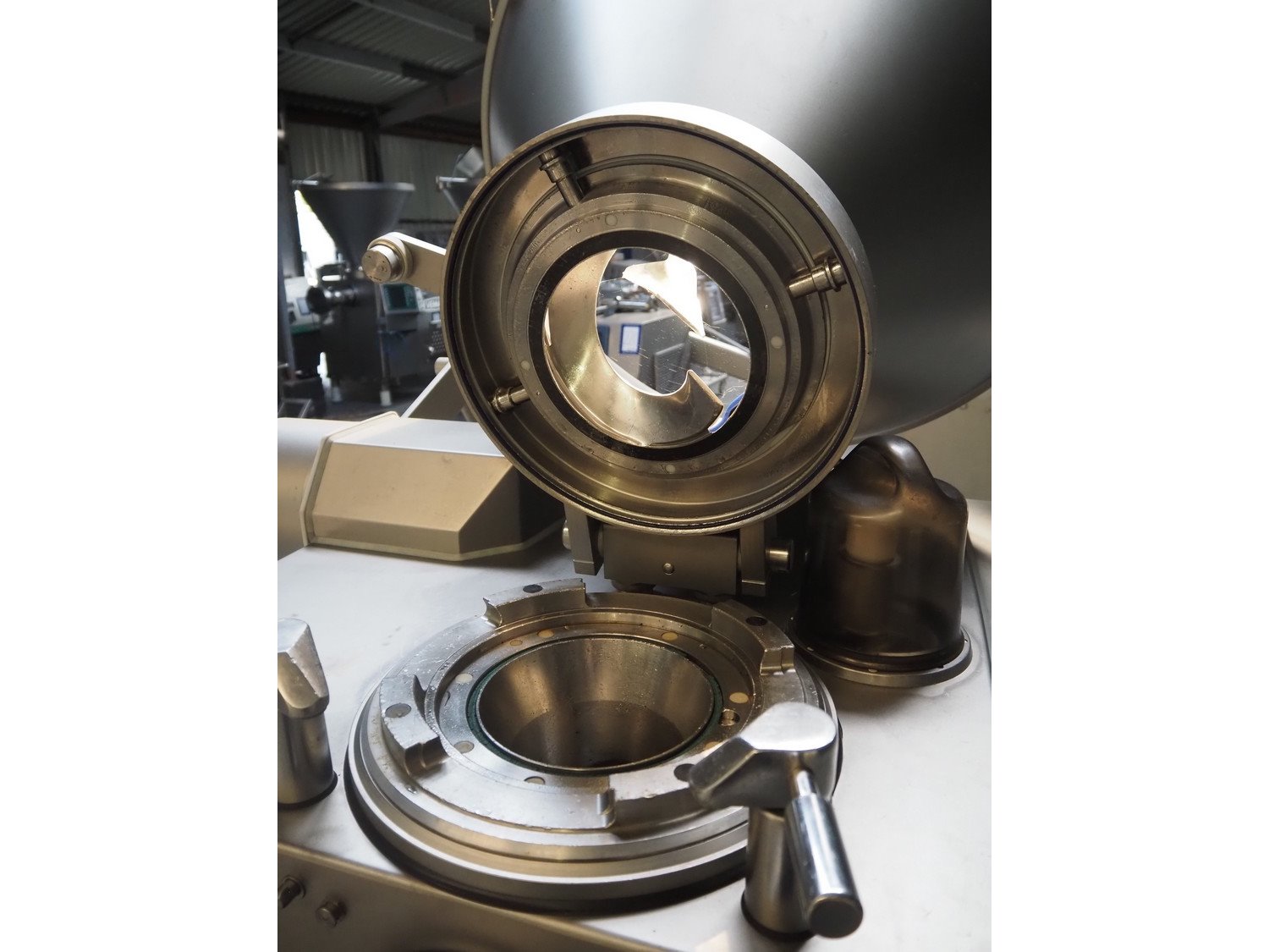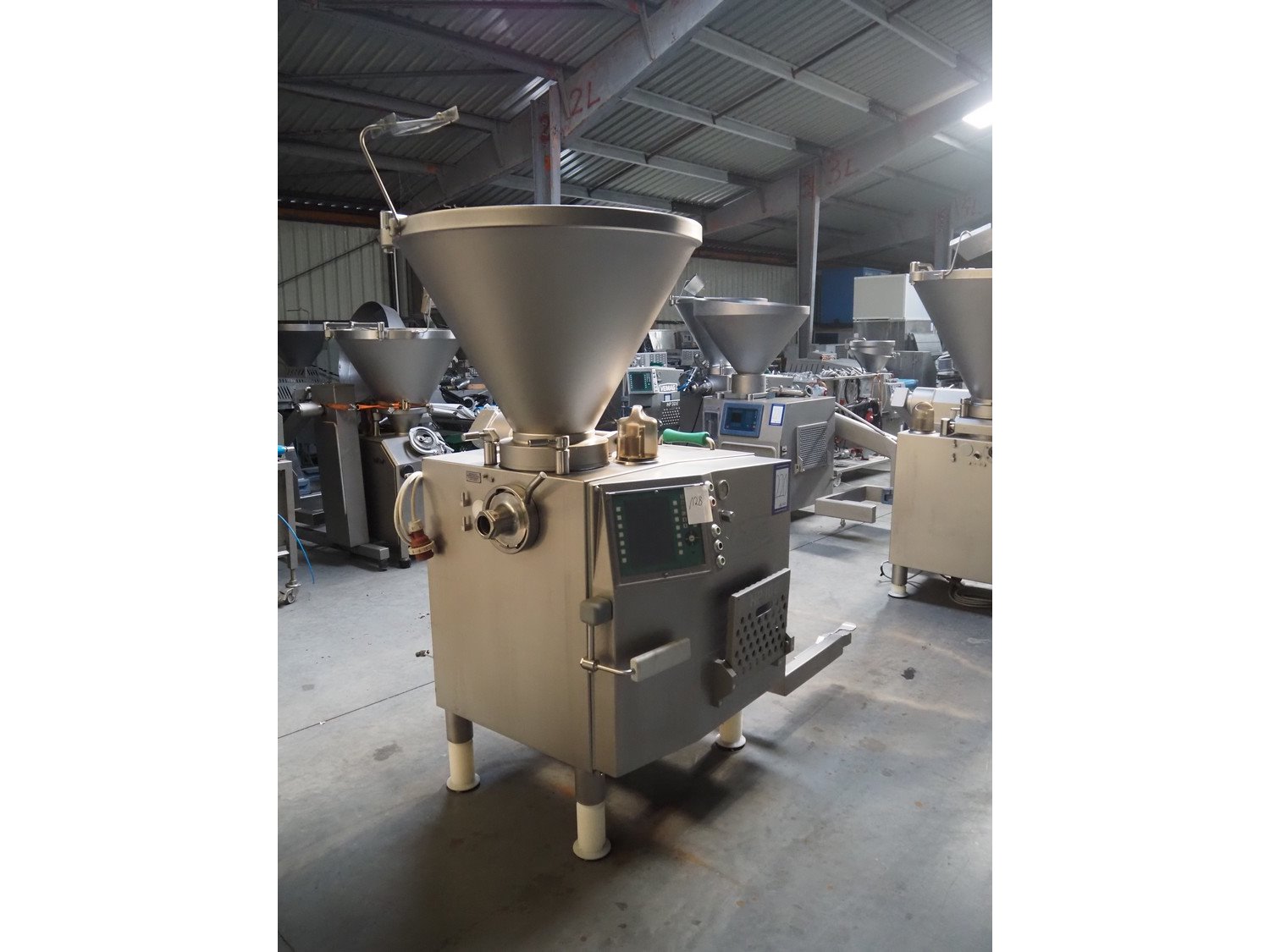 Vemag Maschinenbau GmbH vacuum filling machine with lifter for 200 liter meat bins, type: HP10E, number: 1610384, year of construction: 2010, 400-460 V, 3 Ph, 50/60 Hz, 21 A, 14 kW, dimensions: 2100 mm x 1500 mm x 2400 mm.