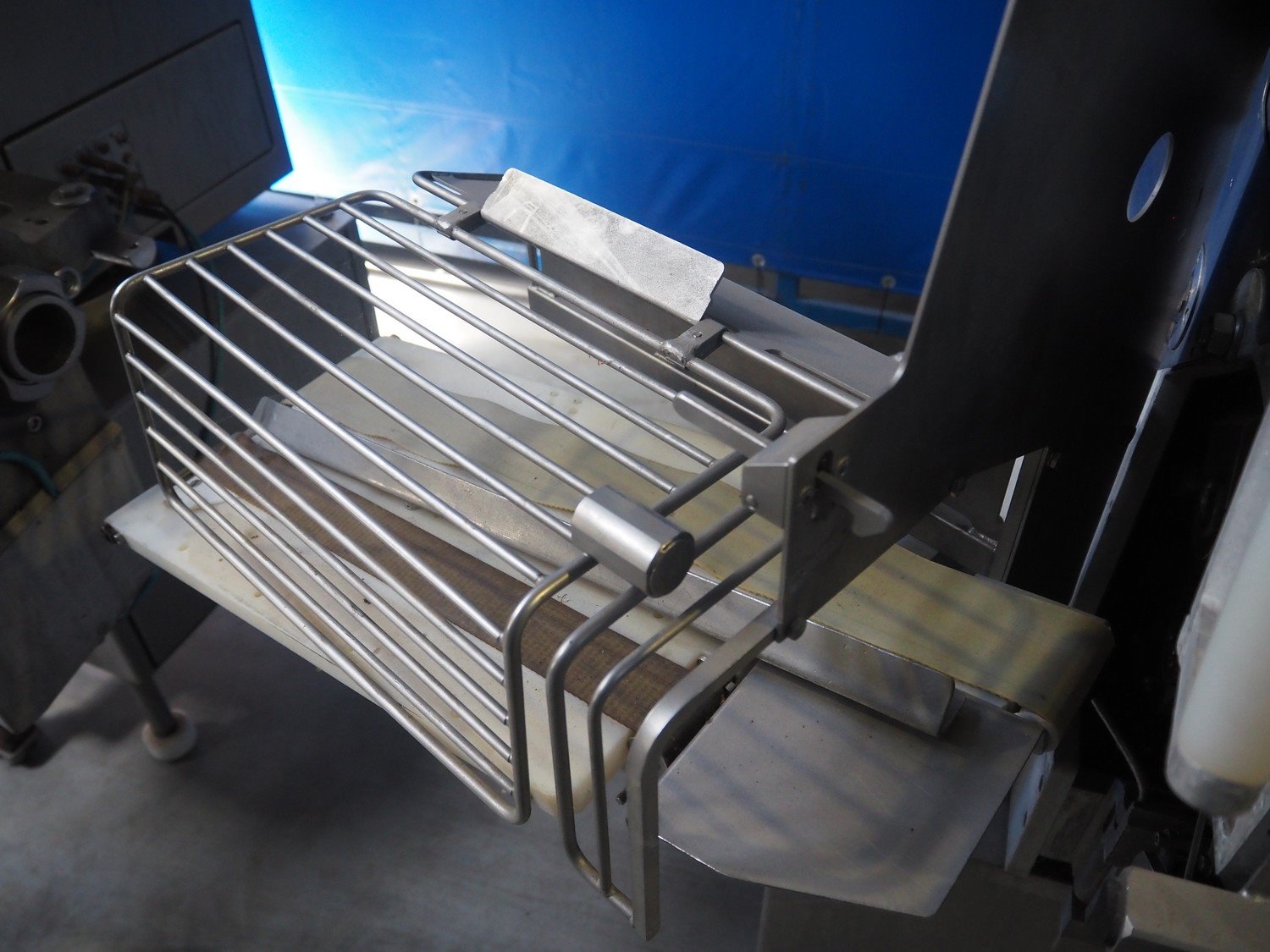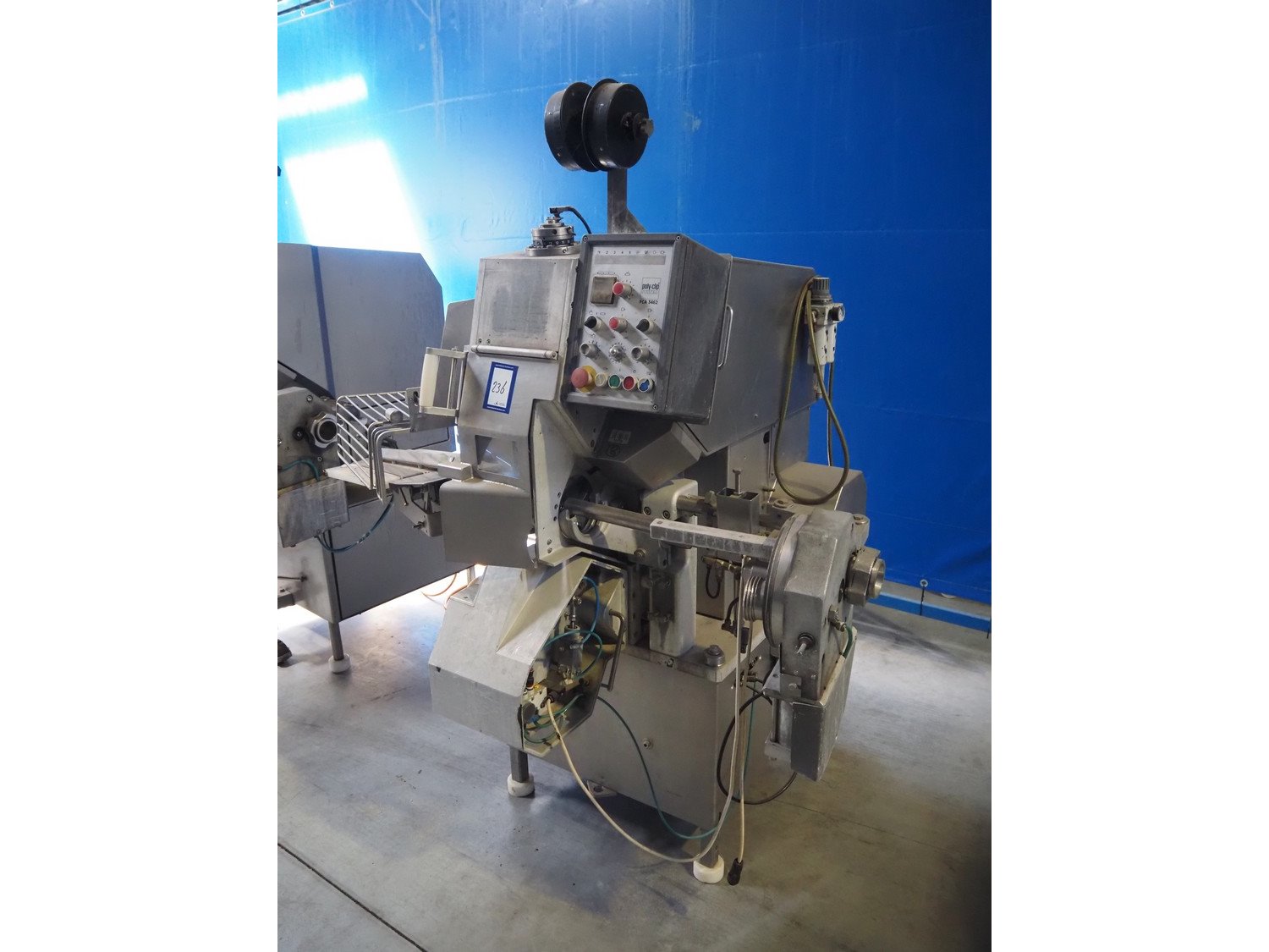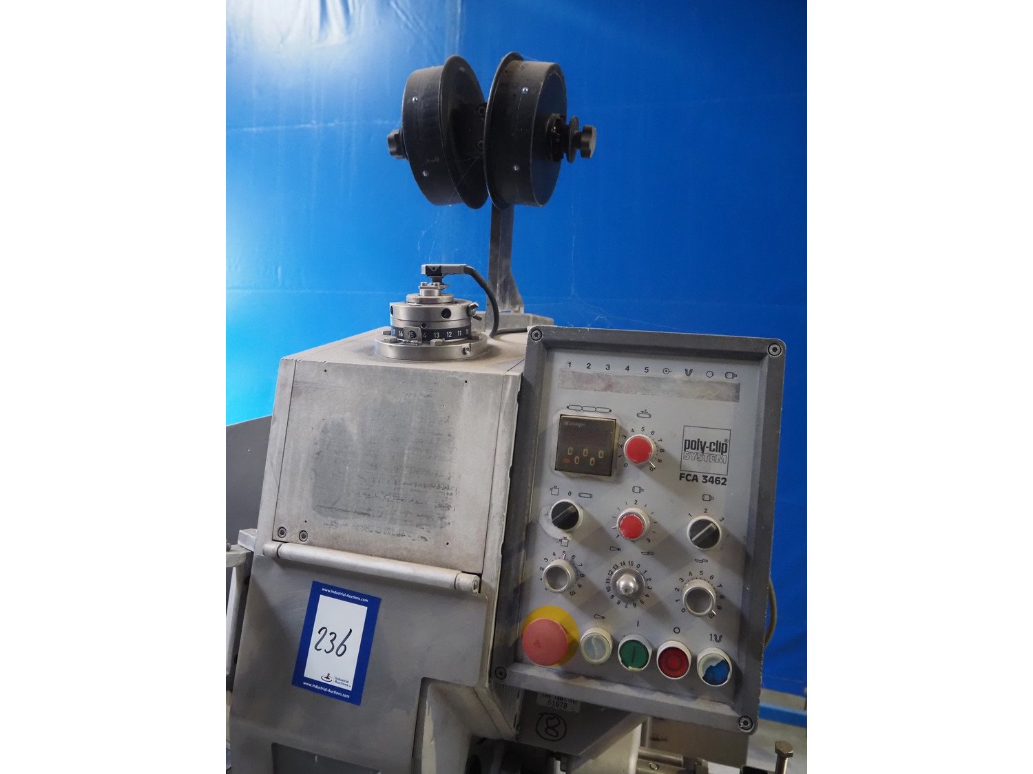 Poly-clip System GmbH & Co. KG automatic double clipper, type: FCA 3462, plastic belt, belt width: 50 mm and 75 mm, dimensions: 1300 mm x 1100 mm x 2000 mm.