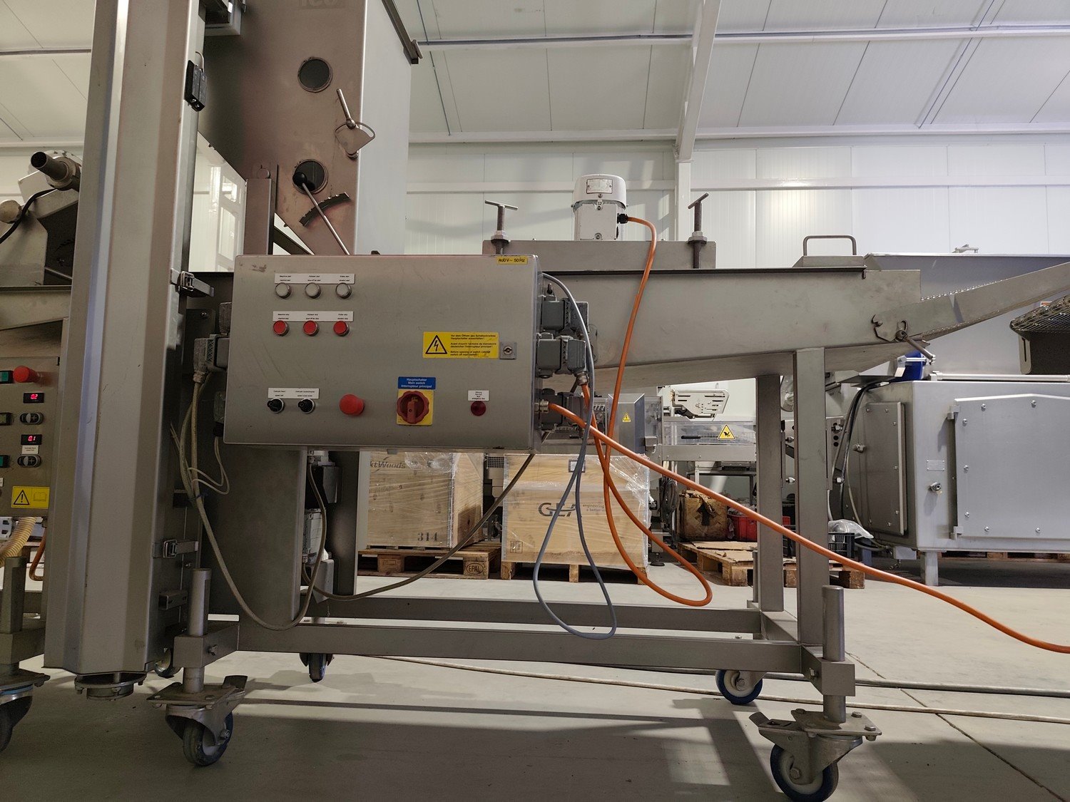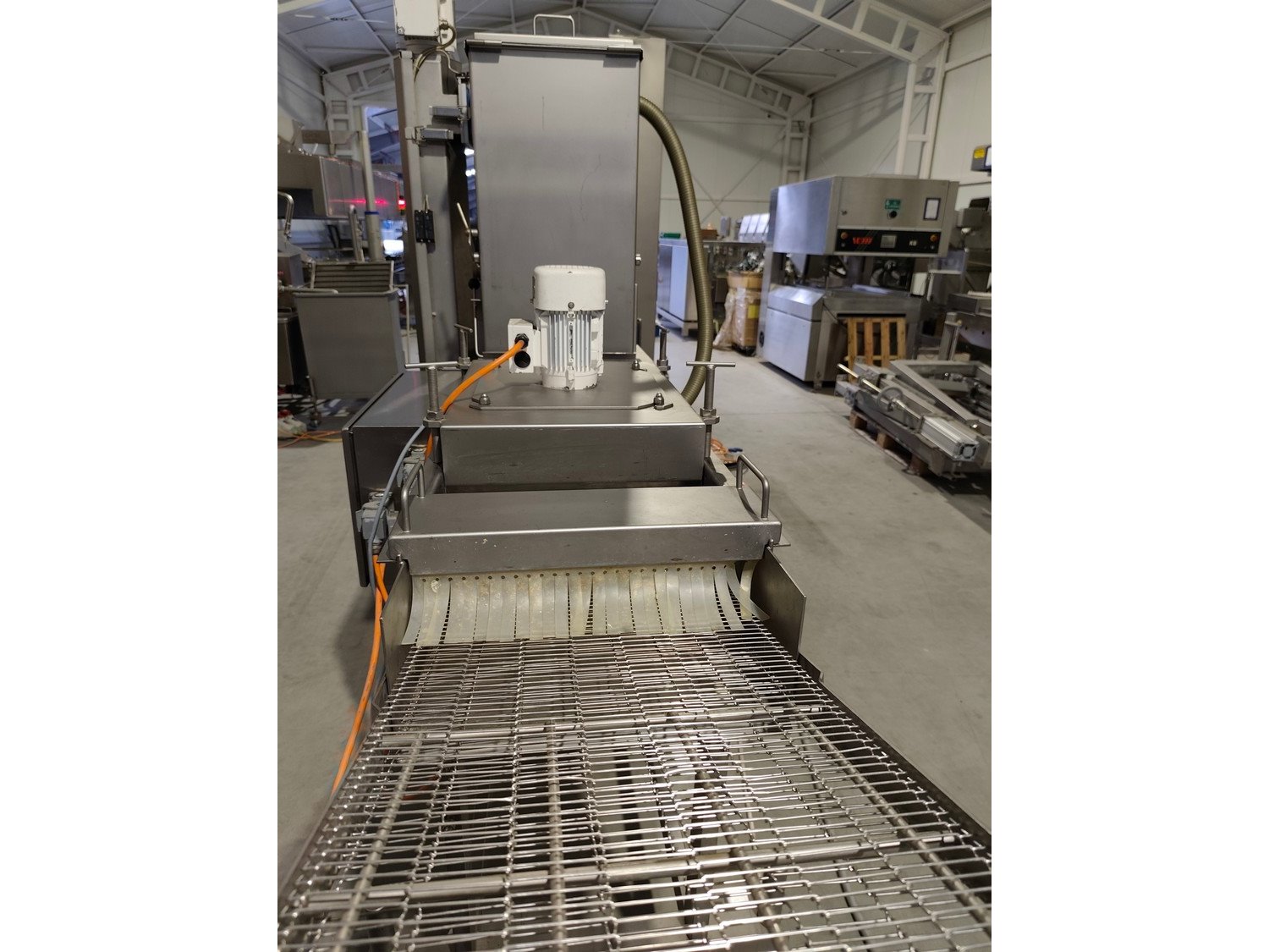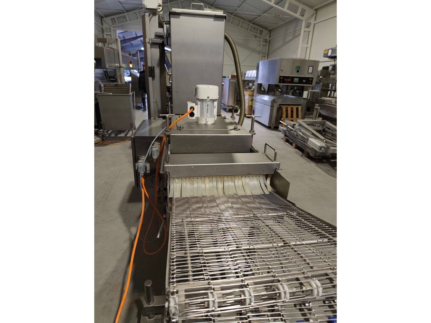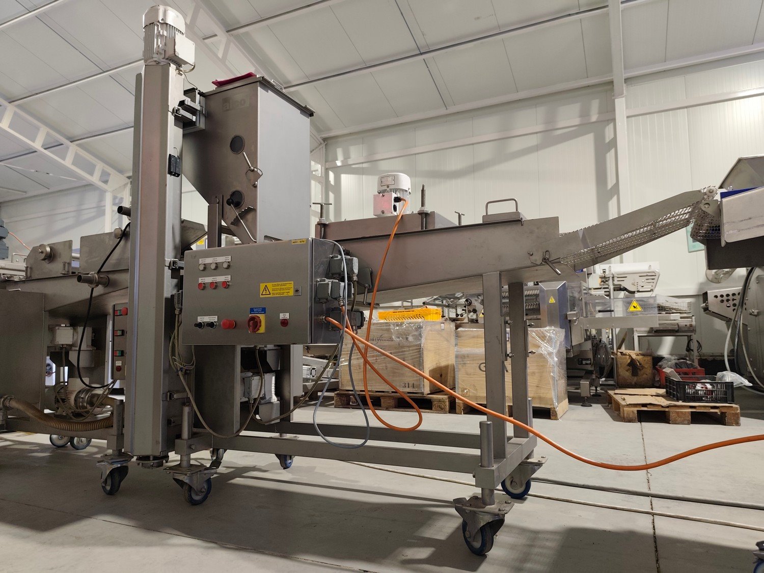 Alco-food-machines GmbH & Co. KG mobile breading machine, s/s mesh belt, belt width: 400 mm, total dimensions: 2250 mm x 800 mm x 2200 mm.