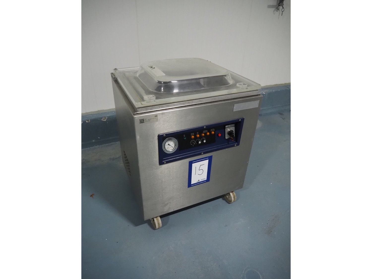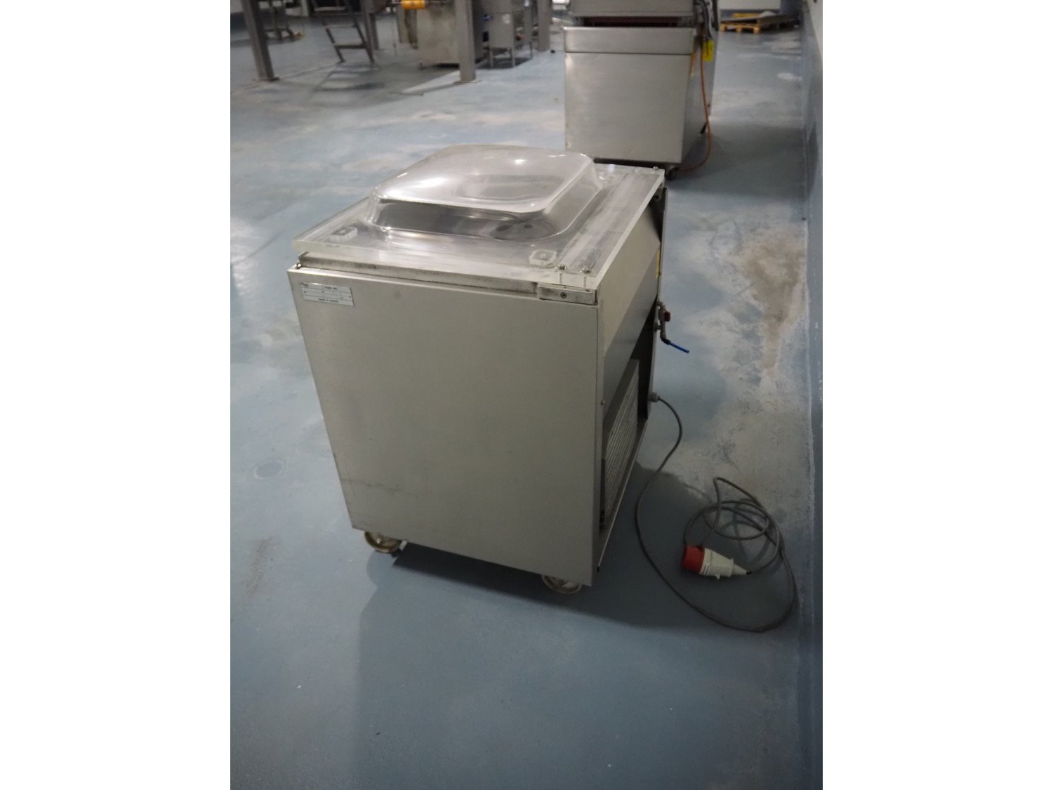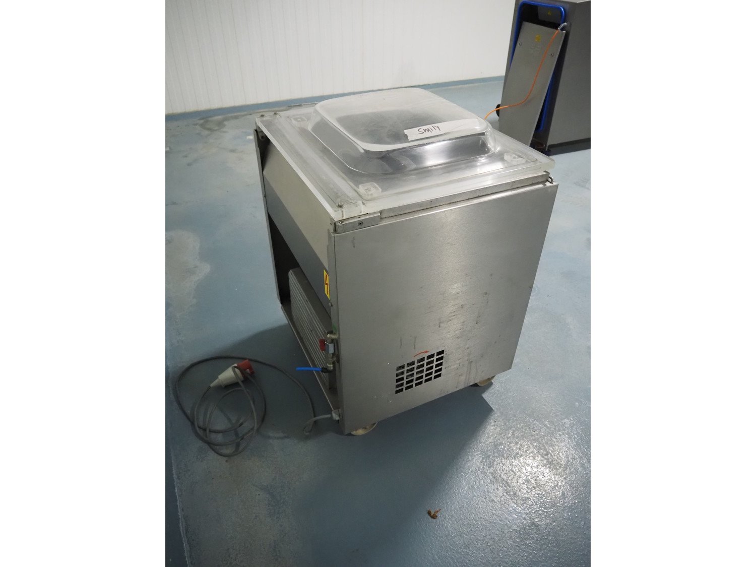 Supervac mobile vacuum machine, type: GK18311, factory number: 920128, 380 V, 50 Hz, 3.5 A, 1.1 kW, seal width: 440 mm, chamber: 540 mm x 460 mm, Rietschle vacuum pump, type: VCA 40 (01), capacity: 40 m³ per hour, total dimensions: 700 mm x 600 mm x 950 mm.