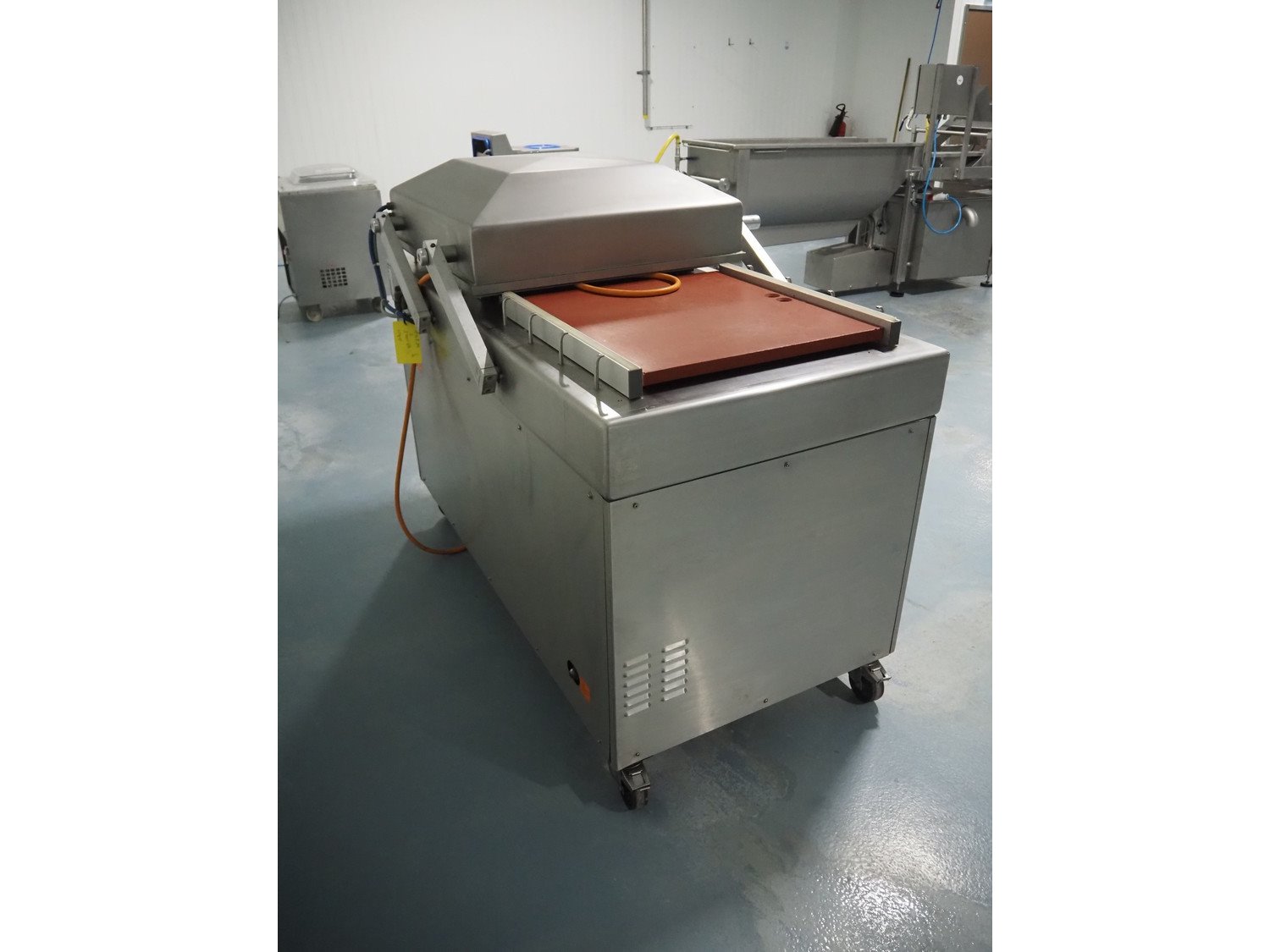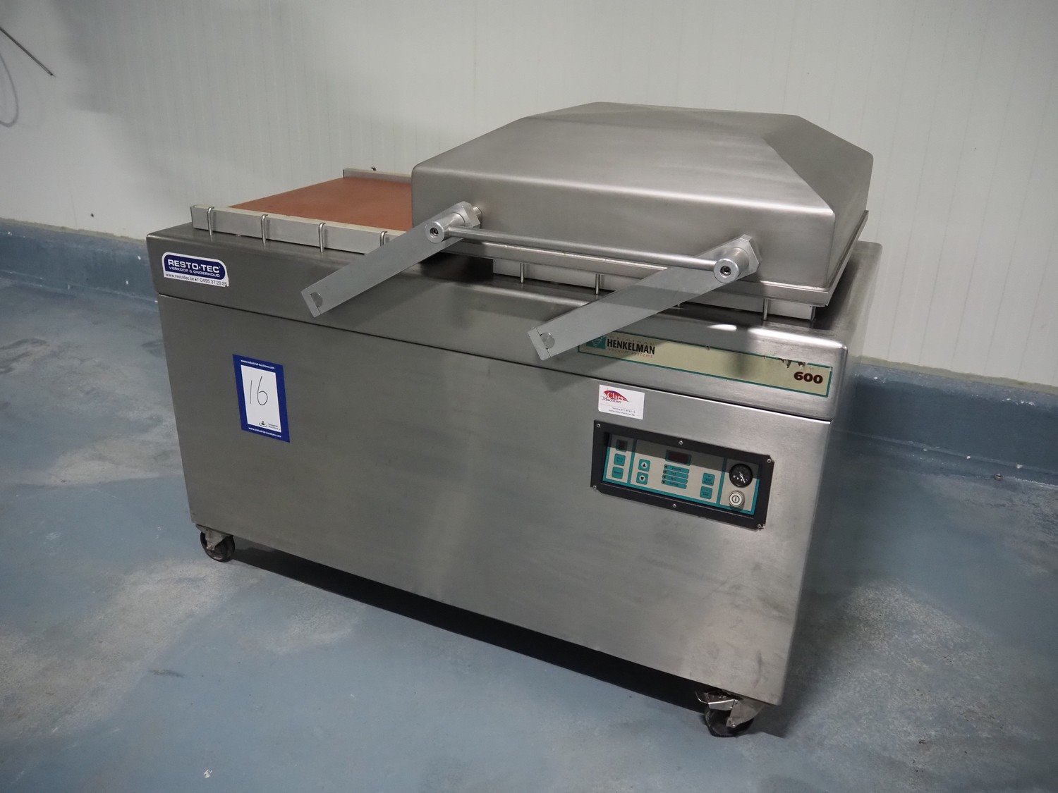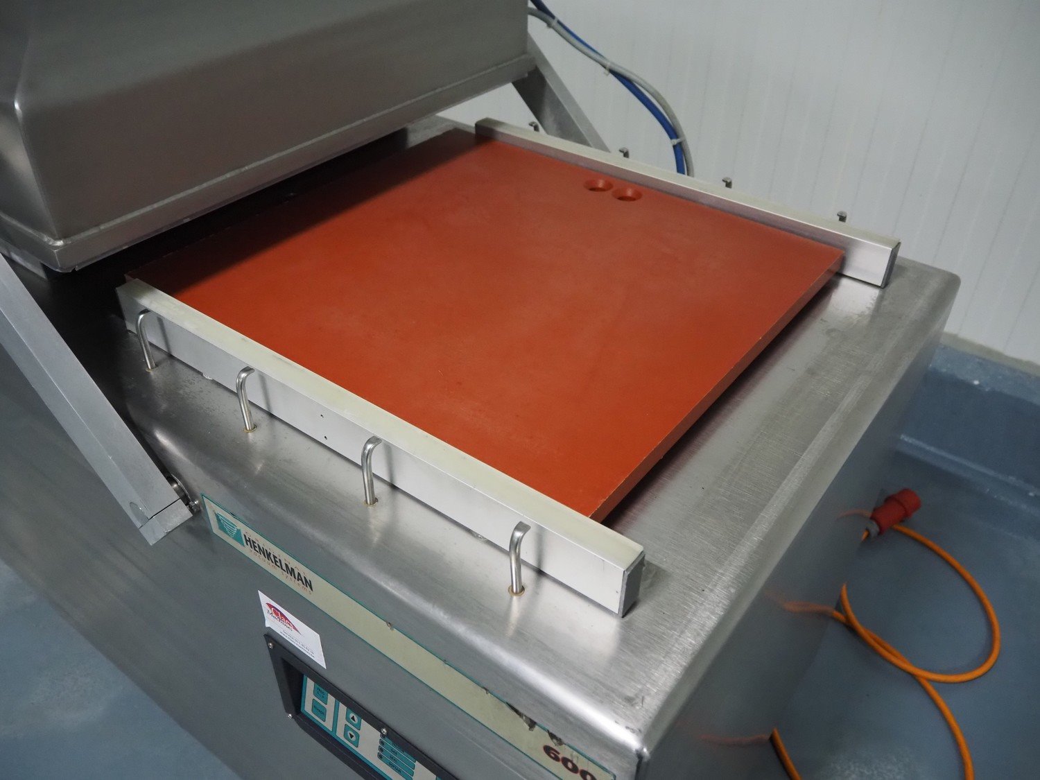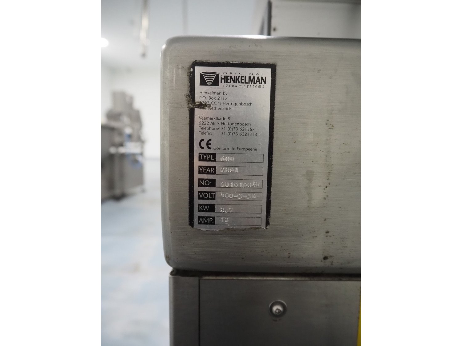 Henkelman mobile double chamber vacuum machine, type: 600, number: 60101004, year of construction: 2001, 400 V, 3 Ph, 50 Hz, 12 A, 2.7 kW, seal width: (4x) 600 mm, chamber: (2x) 630 mm x 570 mm, total dimensions: 1550 mm x 950 mm x 1200 mm.