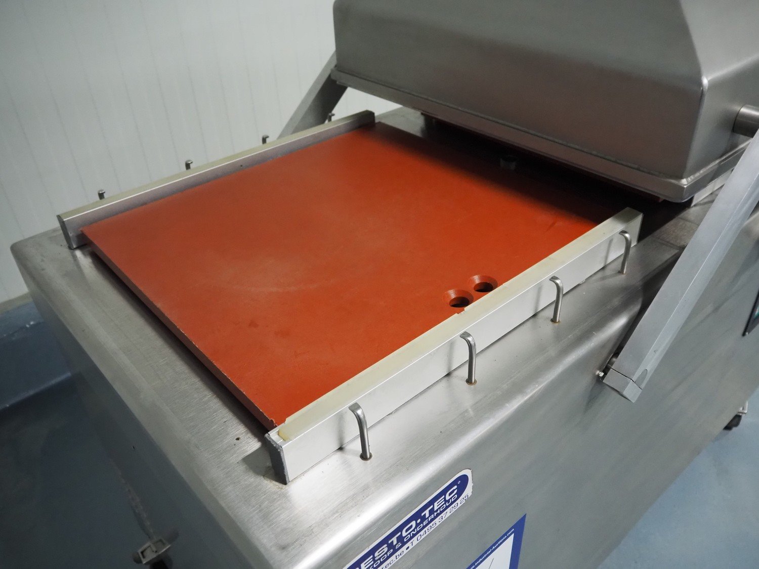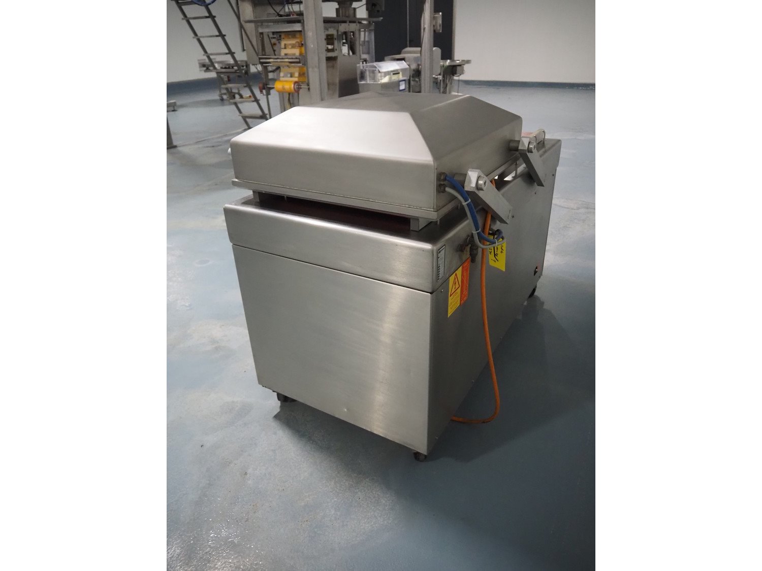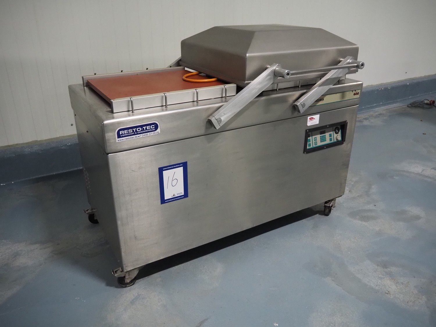Henkelman mobile double chamber vacuum machine, type: 600, number: 60101004, year of construction: 2001, 400 V, 3 Ph, 50 Hz, 12 A, 2.7 kW, seal width: (4x) 600 mm, chamber: (2x) 630 mm x 570 mm, total dimensions: 1550 mm x 950 mm x 1200 mm.
