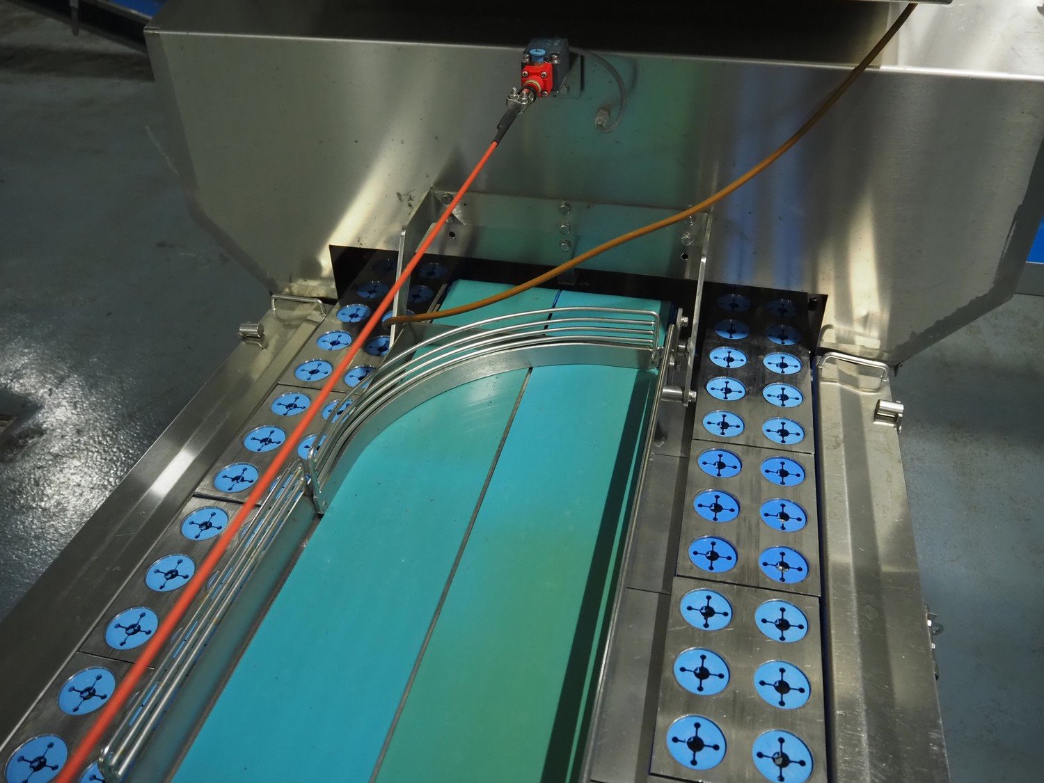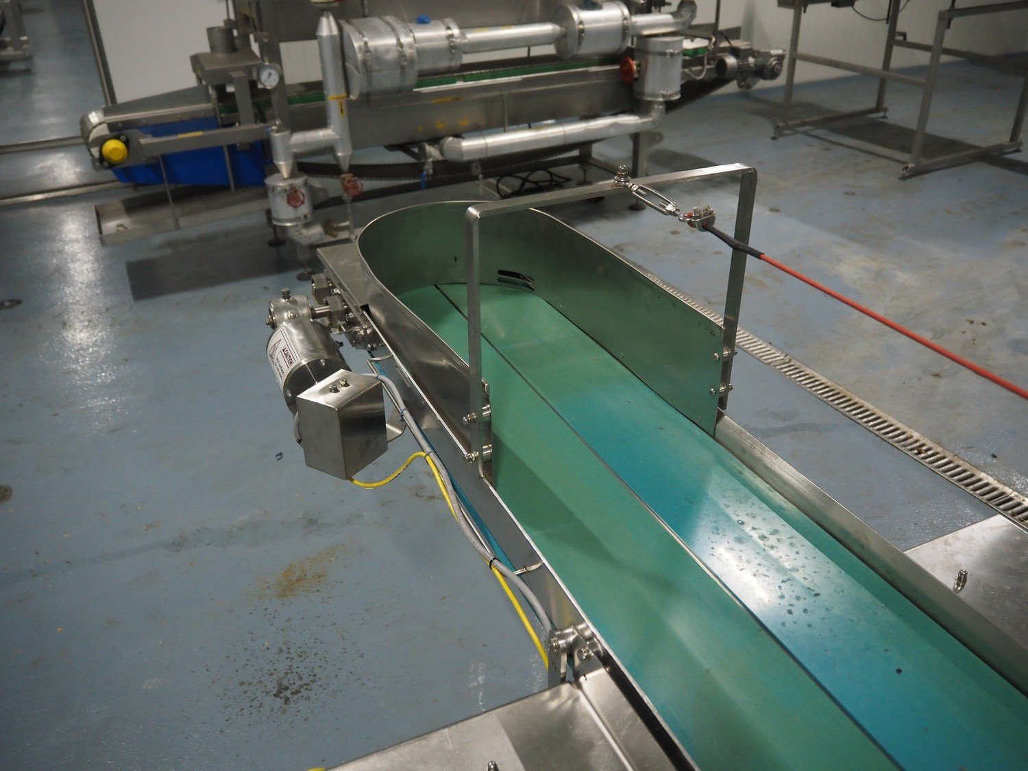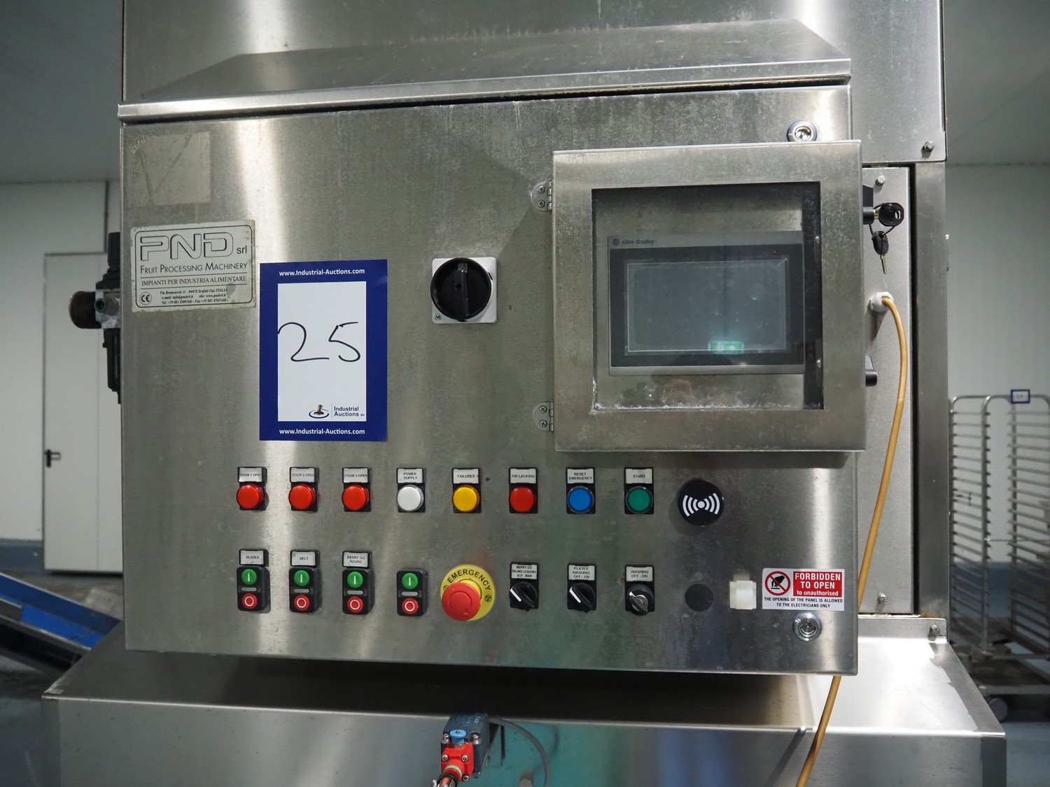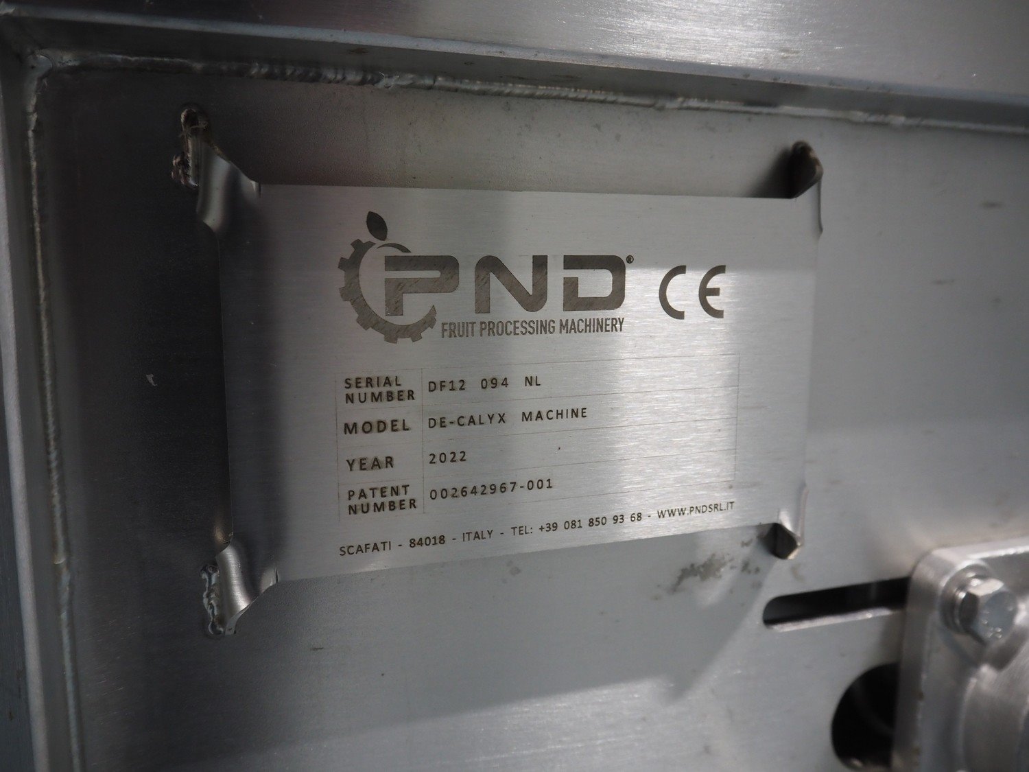 PND Fruit Processing Machinery strawberry de-crowning machine, model: DF12 094 NL, number: 002642967-001, plastic infeed belt, belt width: (2x) 150 mm, clearance: Ø 50 mm, plastic outfeed belt, belt width: 305 mm, total dimensions: 5500 mm x 1900 mm x 2450 mm.