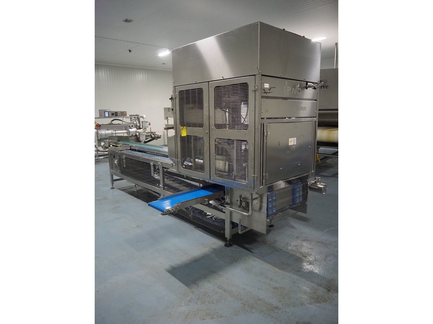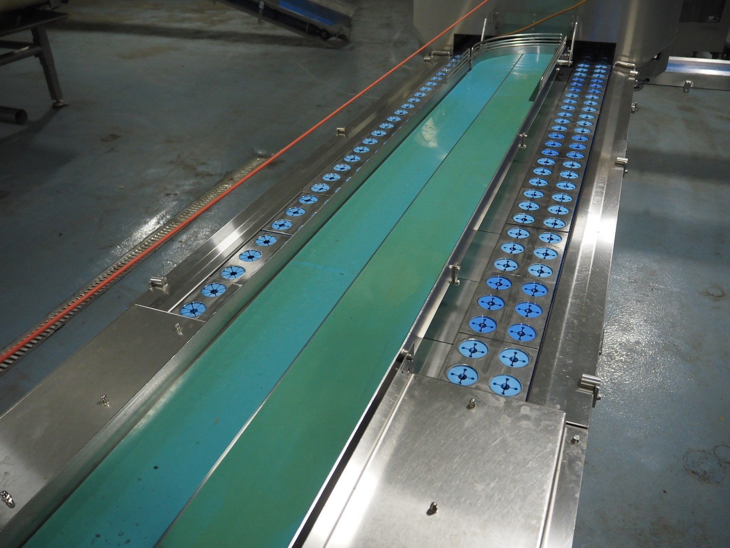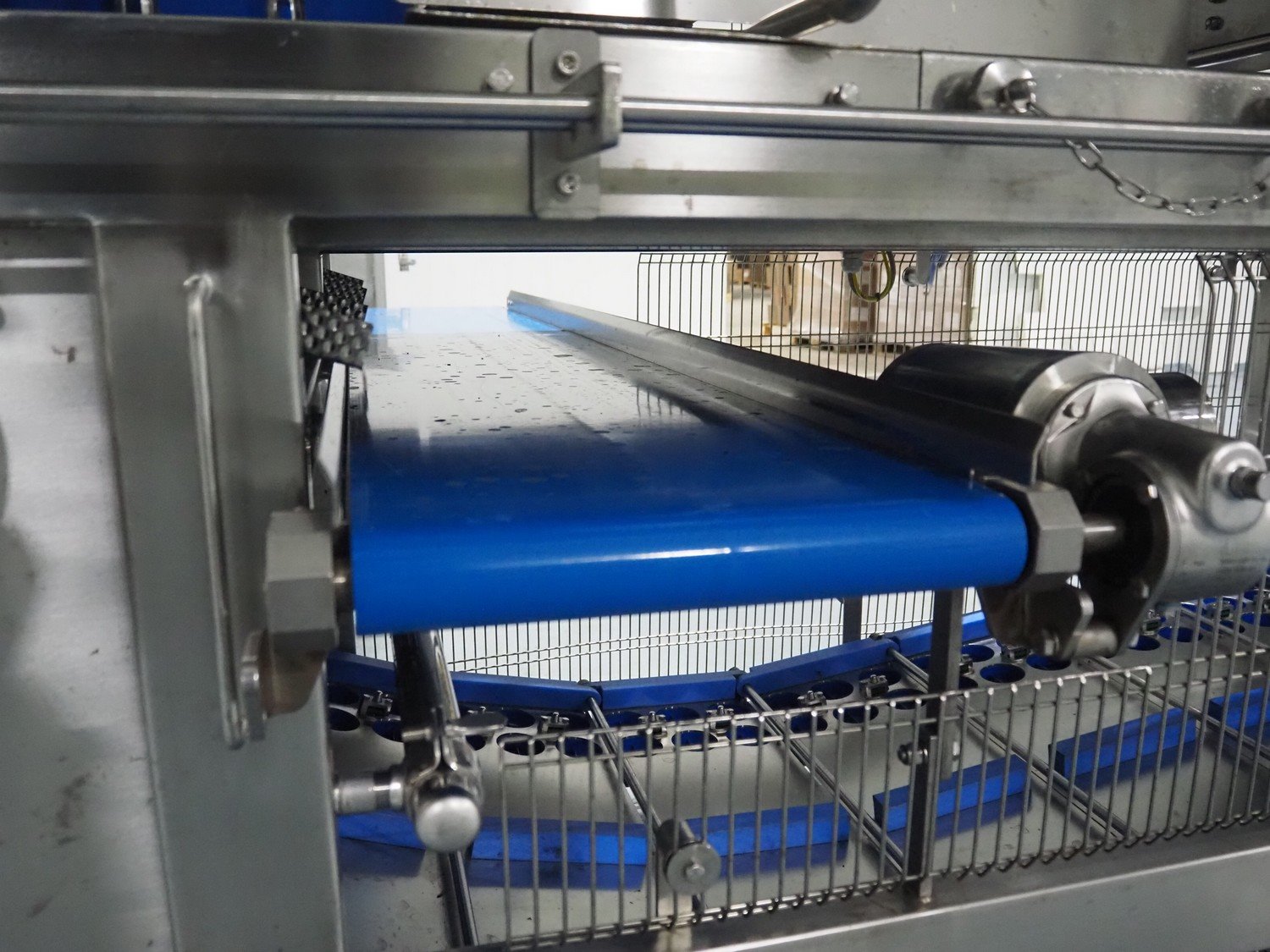 PND Fruit Processing Machinery strawberry de-crowning machine, model: DF12 094 NL, number: 002642967-001, plastic infeed belt, belt width: (2x) 150 mm, clearance: Ø 50 mm, plastic outfeed belt, belt width: 305 mm, total dimensions: 5500 mm x 1900 mm x 2450 mm.