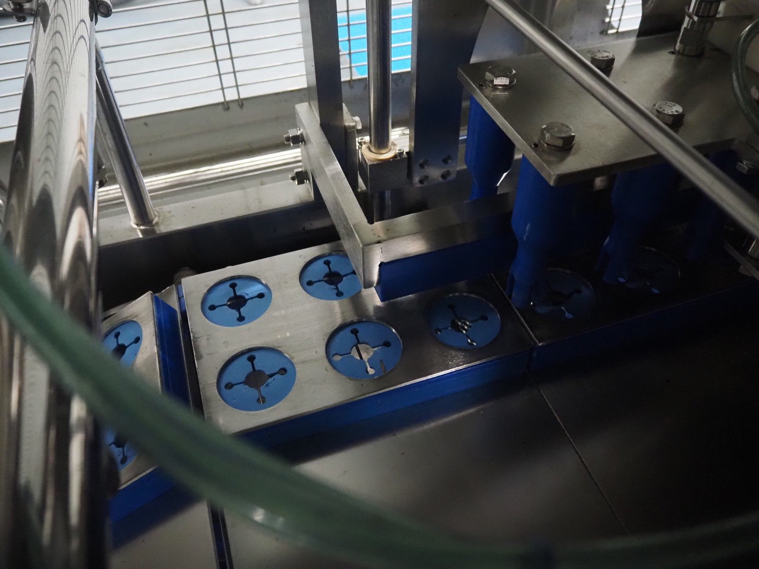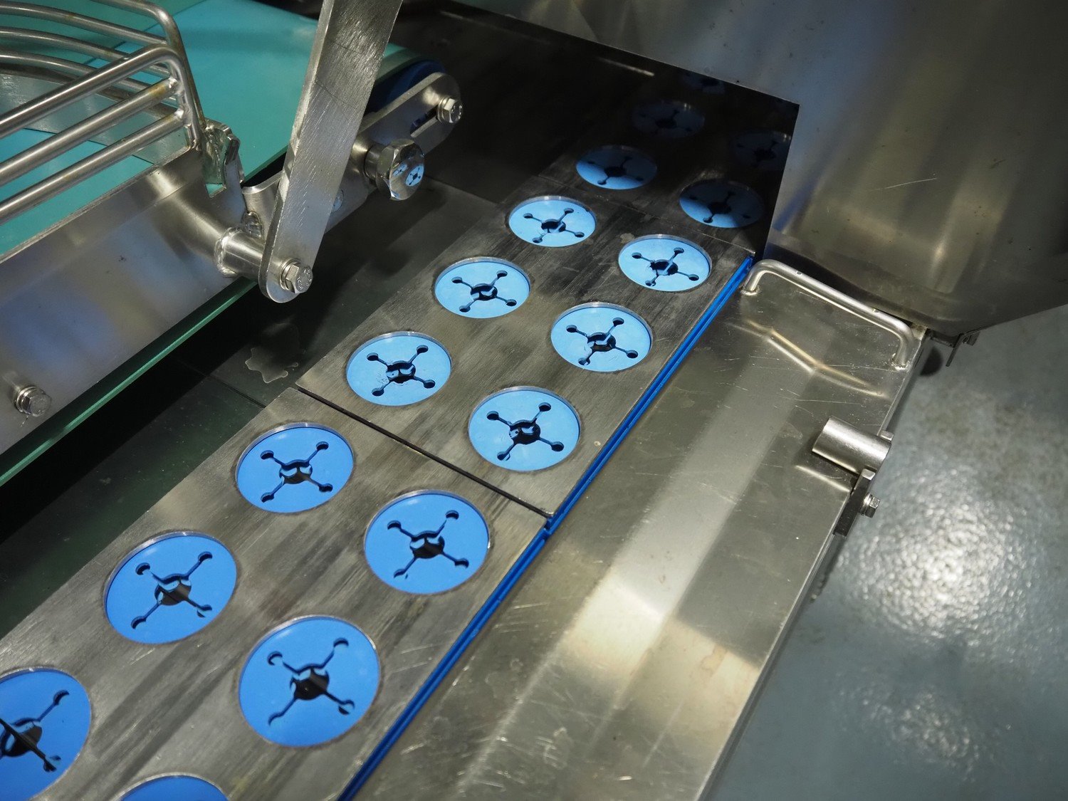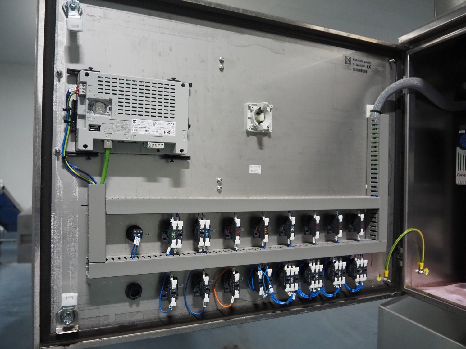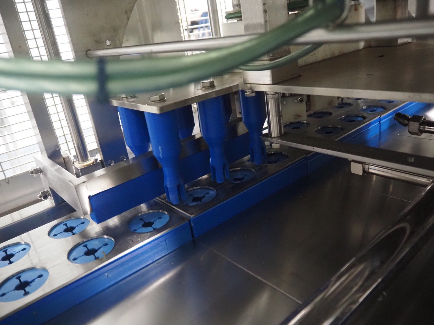 PND Fruit Processing Machinery strawberry de-crowning machine, model: DF12 094 NL, number: 002642967-001, plastic infeed belt, belt width: (2x) 150 mm, clearance: Ø 50 mm, plastic outfeed belt, belt width: 305 mm, total dimensions: 5500 mm x 1900 mm x 2450 mm.