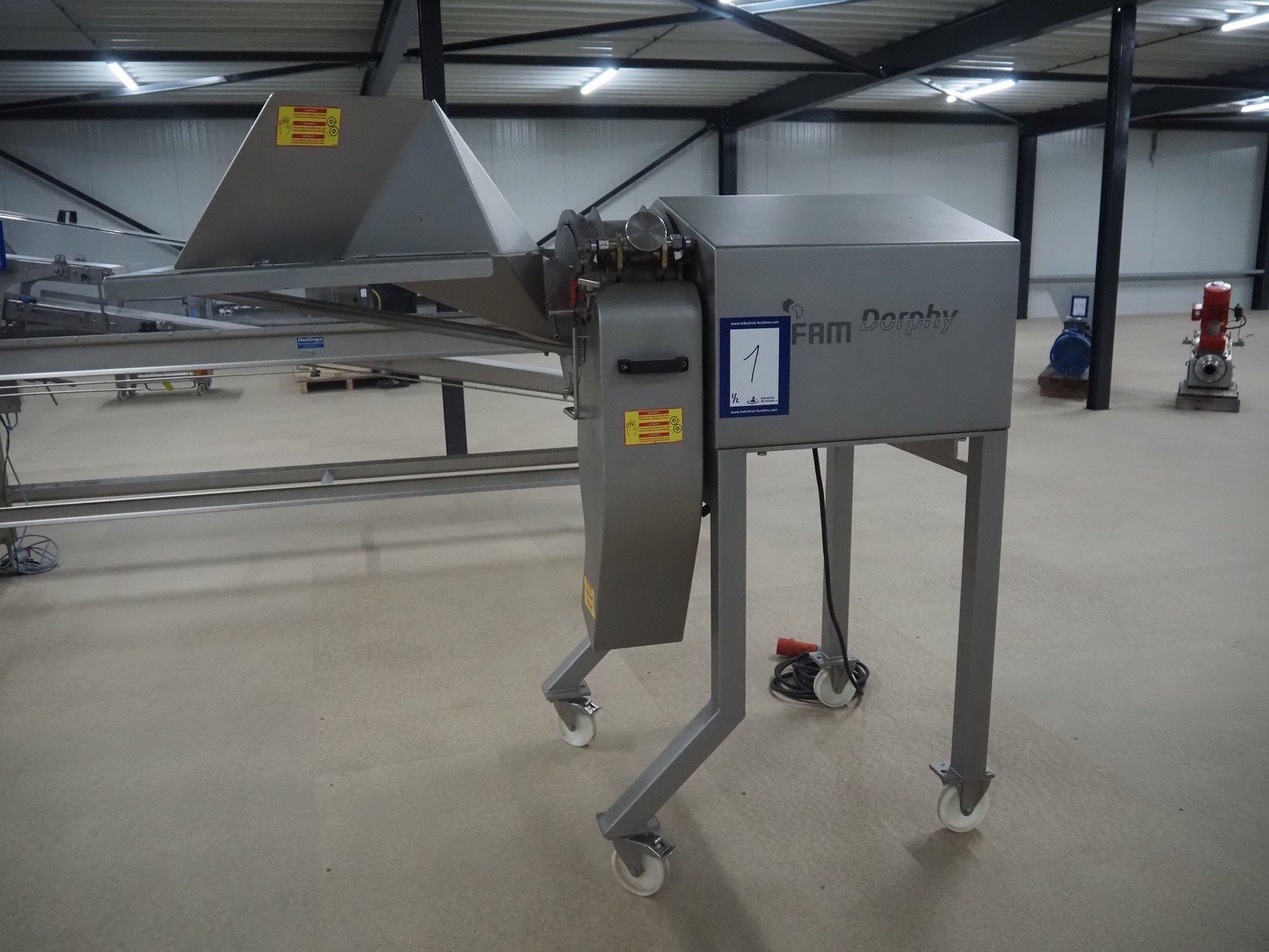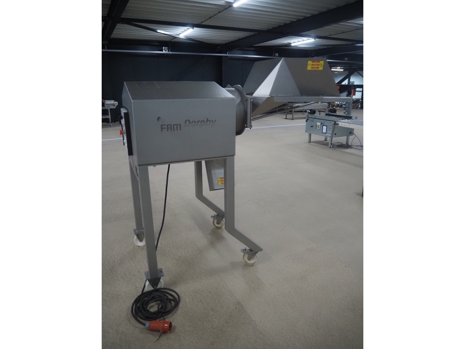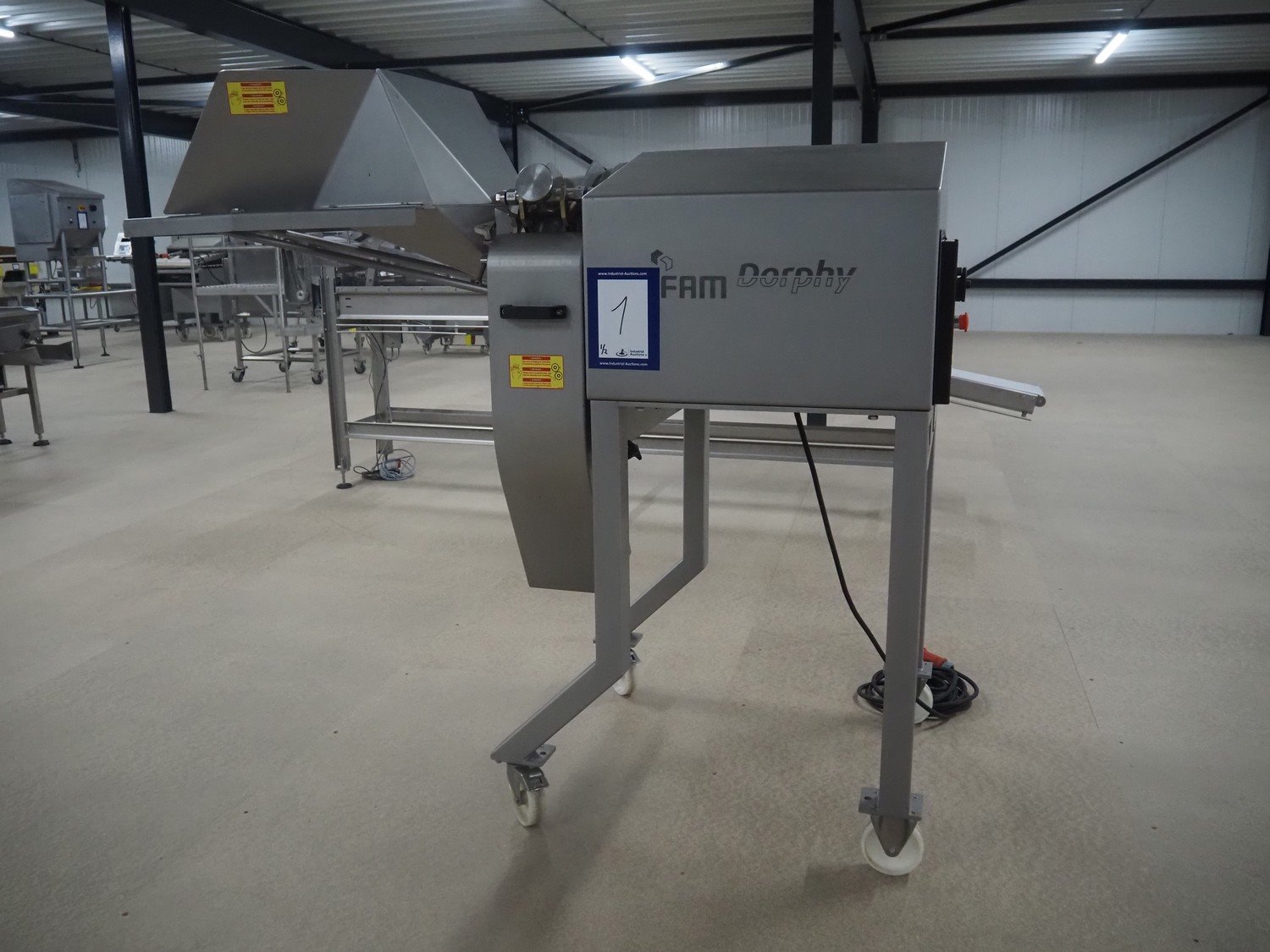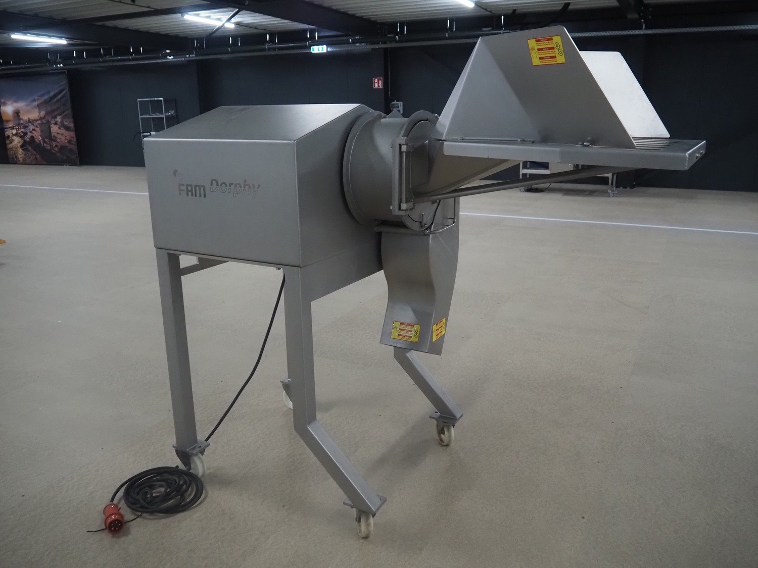FAM mobile vegetable dicer, type: Dorphy, number: 12162, year of construction: 2020, 400 V, 3 Ph, 50 Hz, 4 A, 1.5 kW, working width: 120 mm, distance between knives: 15 mm, total dimensions: 1770 mm x 800 mm x 1650 mm. Including toolbox.
