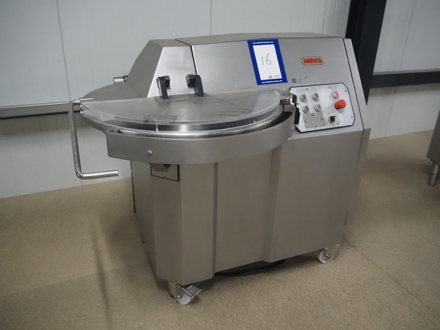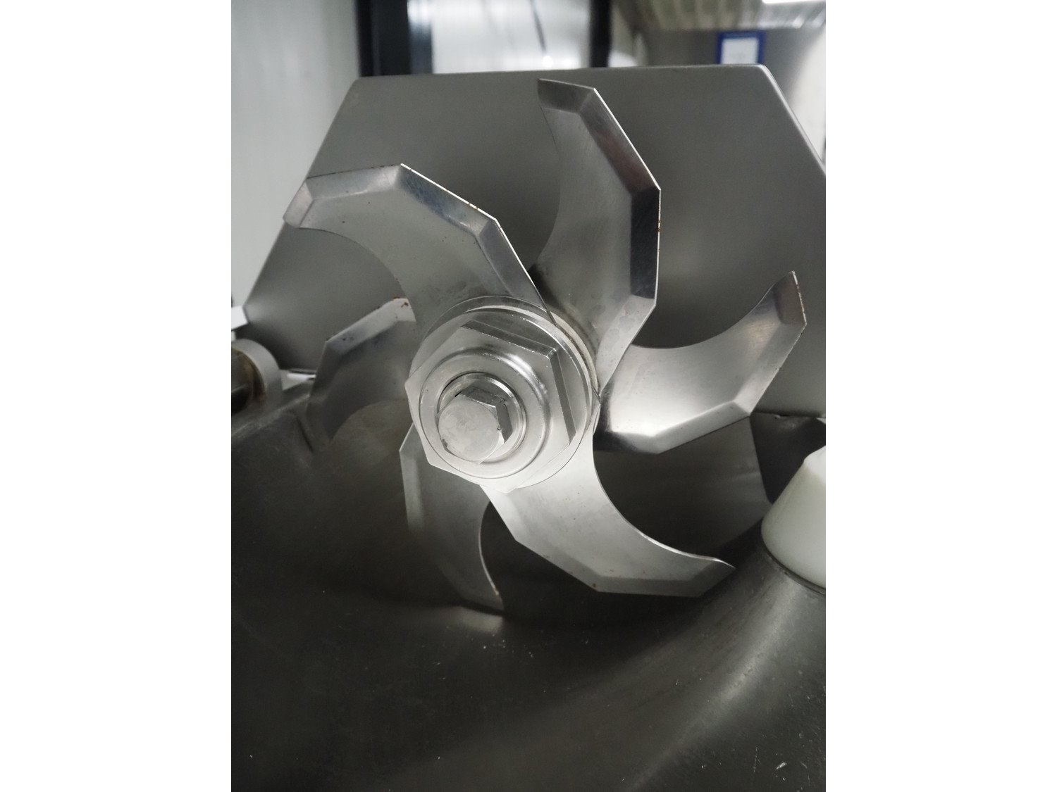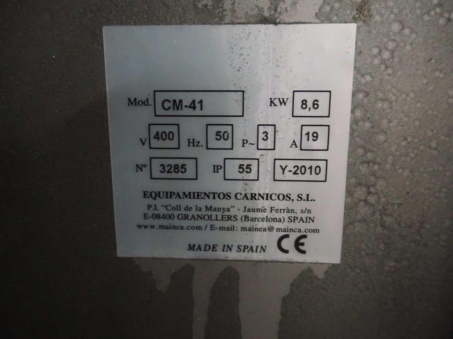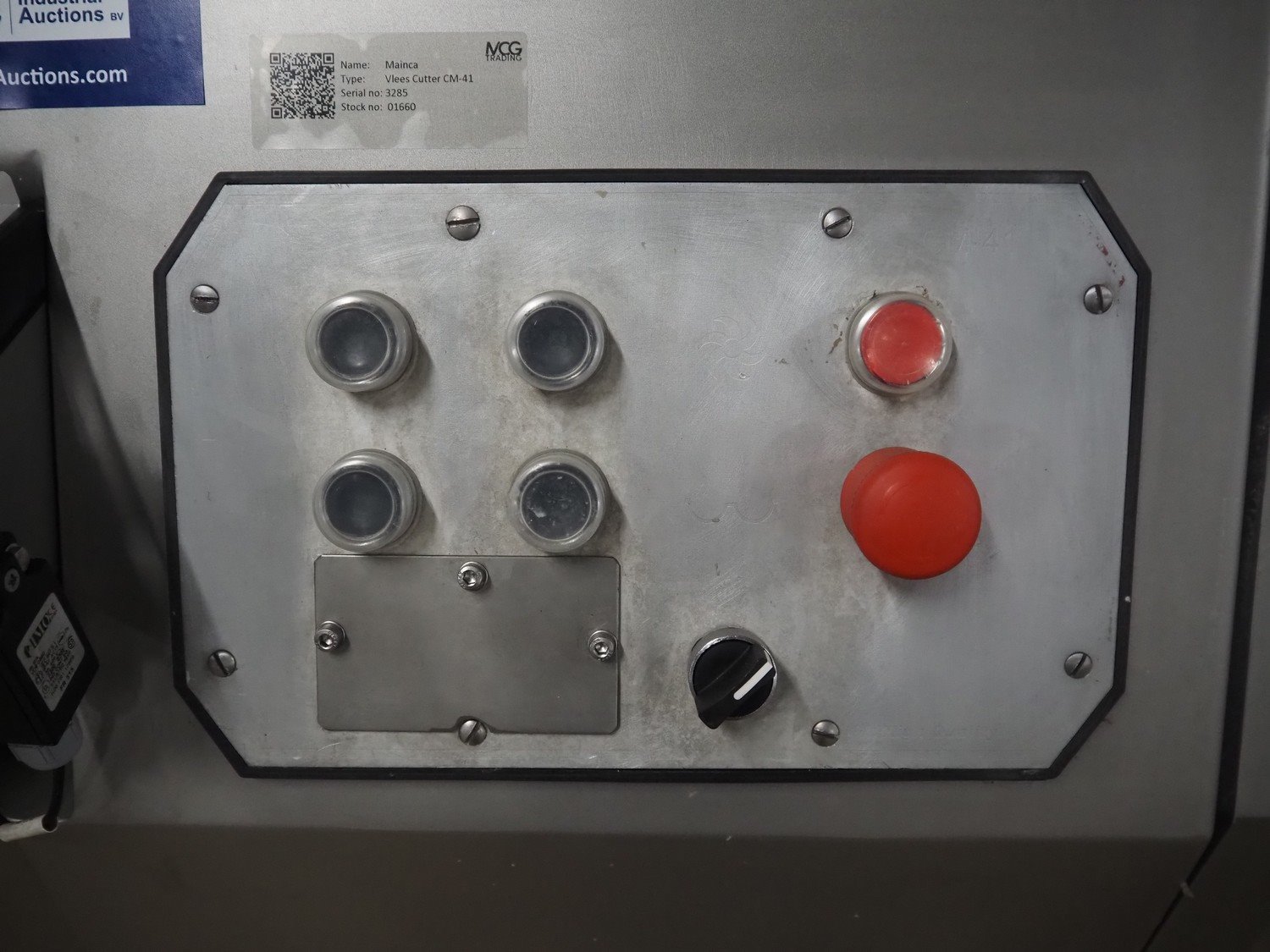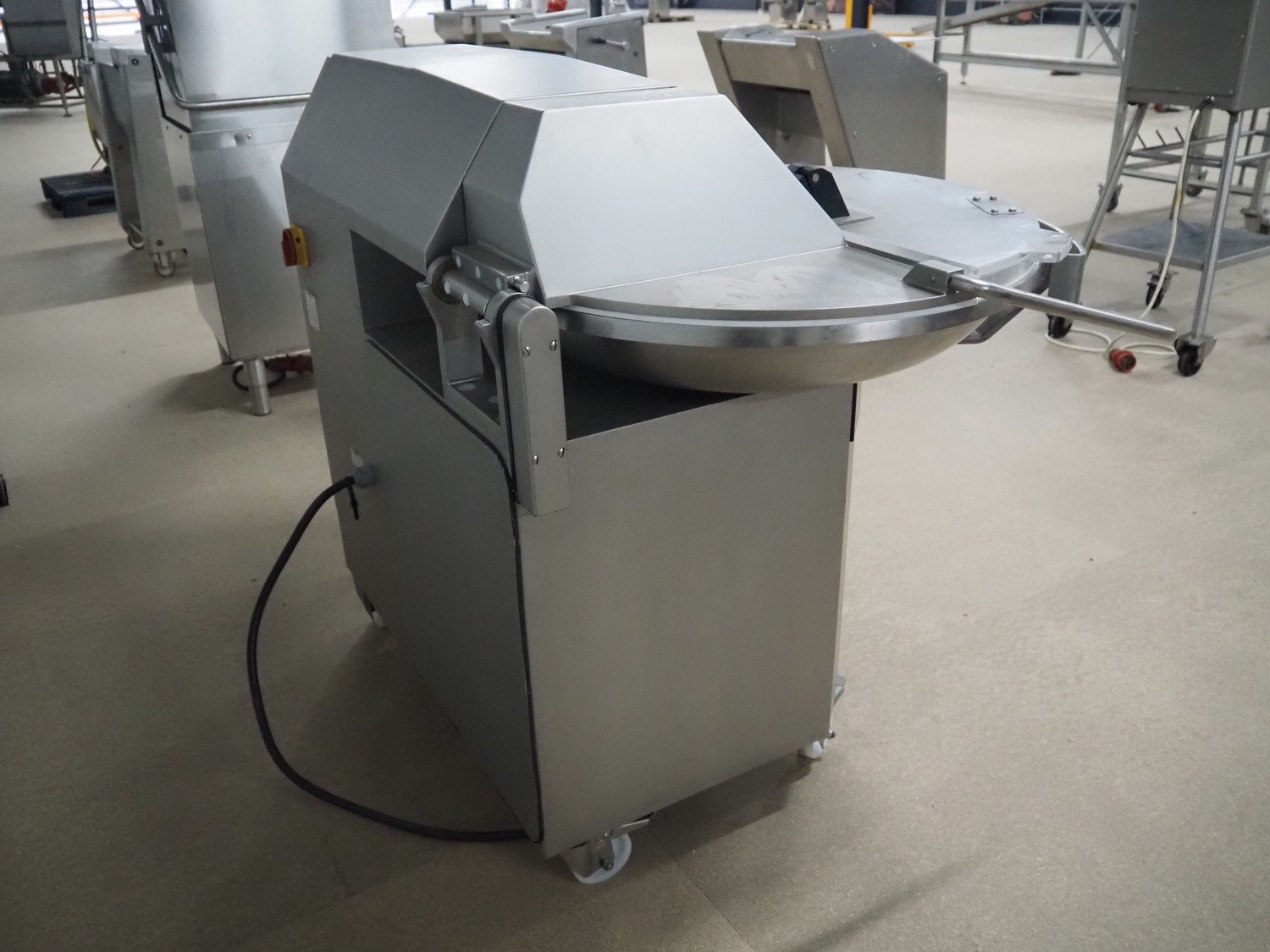 Mainca mobile cutter, model: CM-41, number: 3285, year of construction: 2010, 400 V, 3 Ph, 50 Hz, 19 A, 8.6 kW, s/s bowl, volume bowl: 40 liter, s/s knives, 2 speeds, dimensions: 1300 mm x 900 mm x 1100 mm. Including extra knife set.