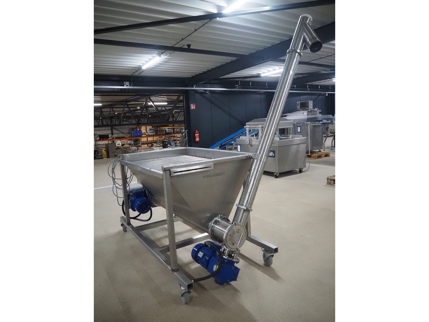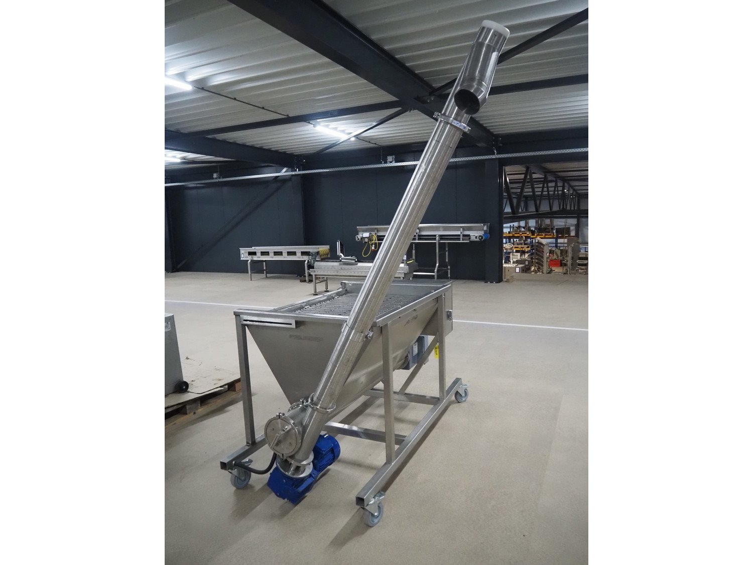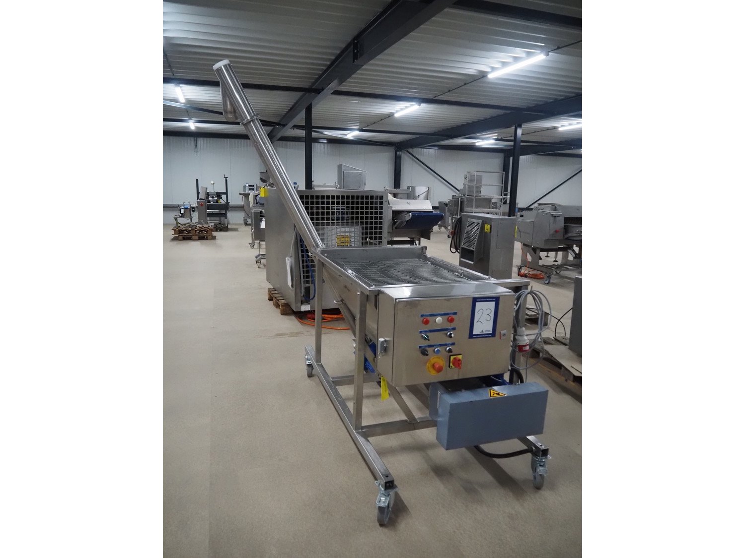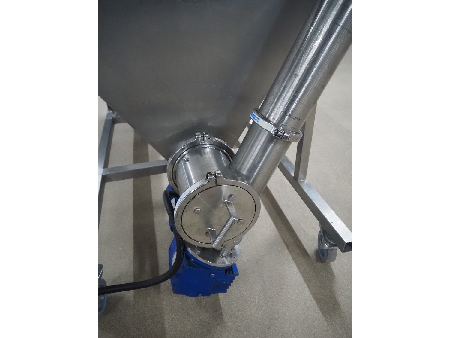 Guttridge mobile infeed bunker with outfeed screw, number: 322445, year of construction: 08/07, clearance: 1200 mm x 800 mm x 800 mm, elevating height: 1900 mm, total dimensions: 1800 mm x 1600 mm x 2300 mm.