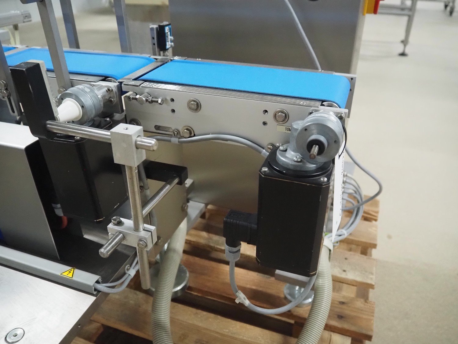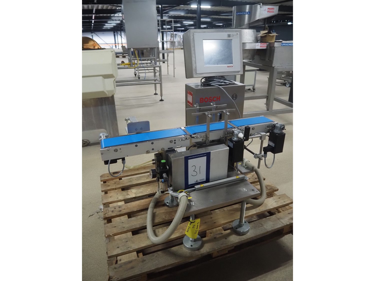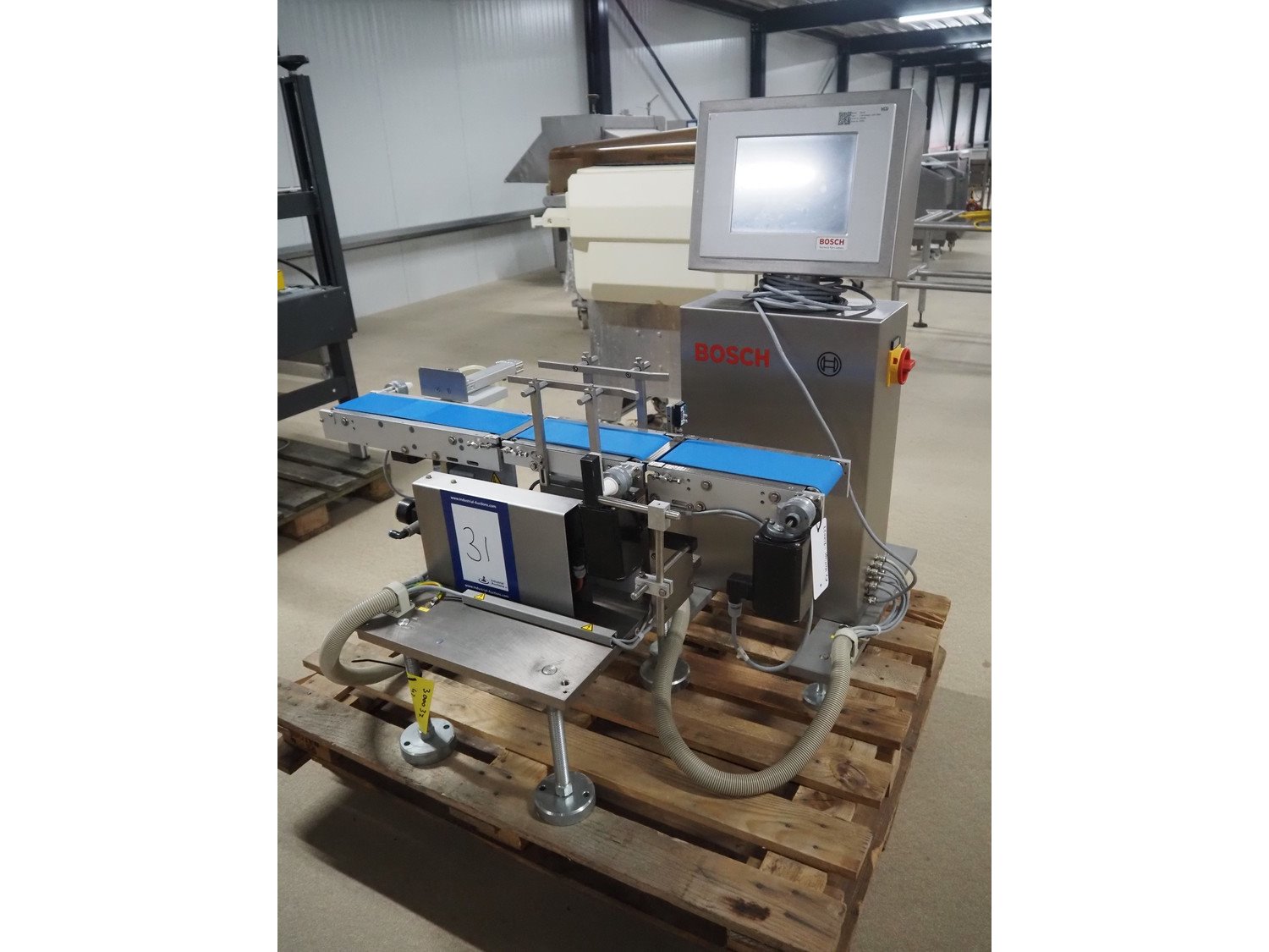 Bosch checkweigher with rejector, type: KWE 5000, number: 809486, year of construction: 2006, 230 V, 1 Ph, 50/60 Hz, 16/3 A, maximum capacity: 2000 g, minimum capacity: 20 g, plastic belts, belt width: 100 mm, total dimensions: 1050 mm x 1050 mm x 1050 mm.