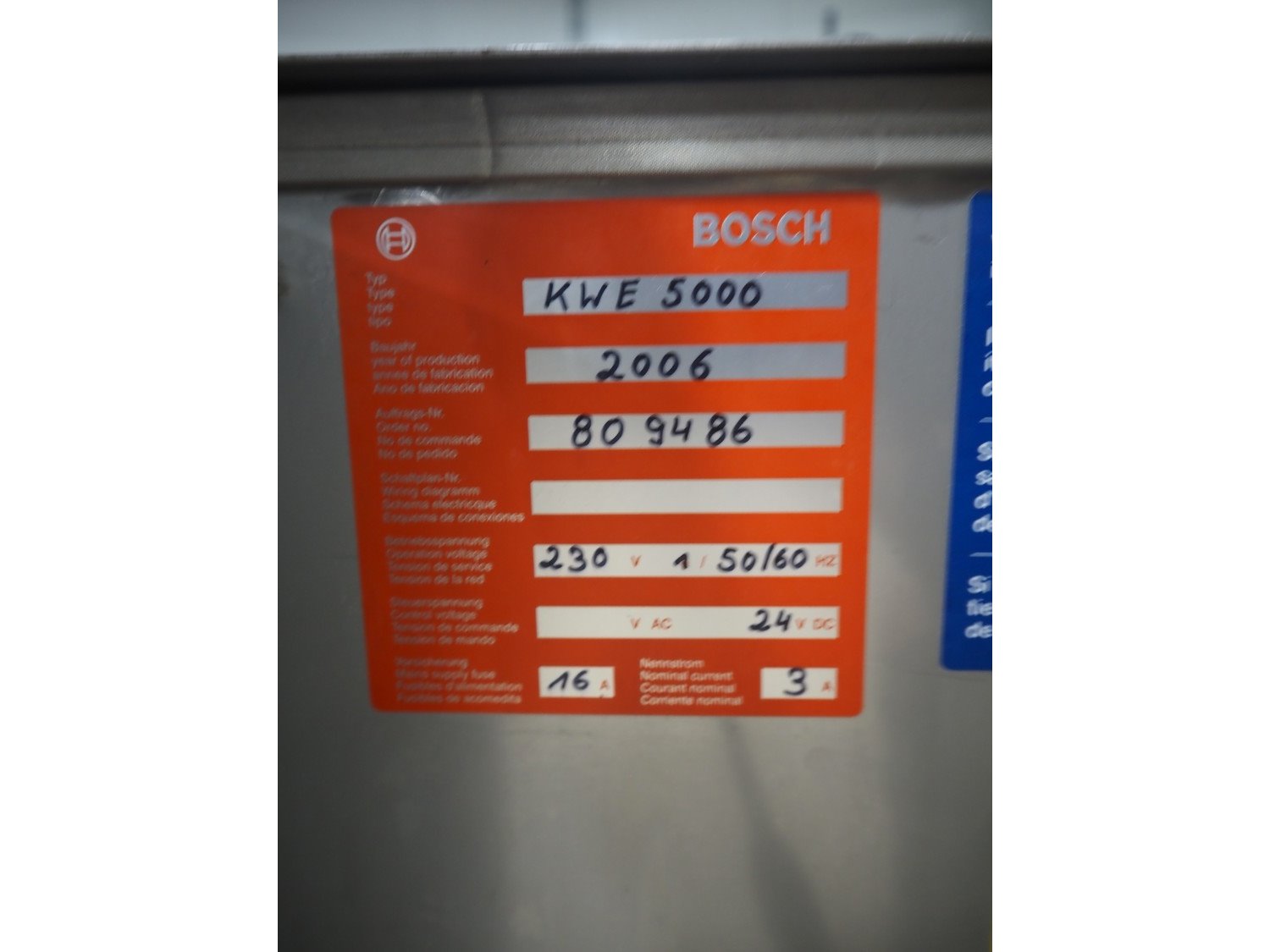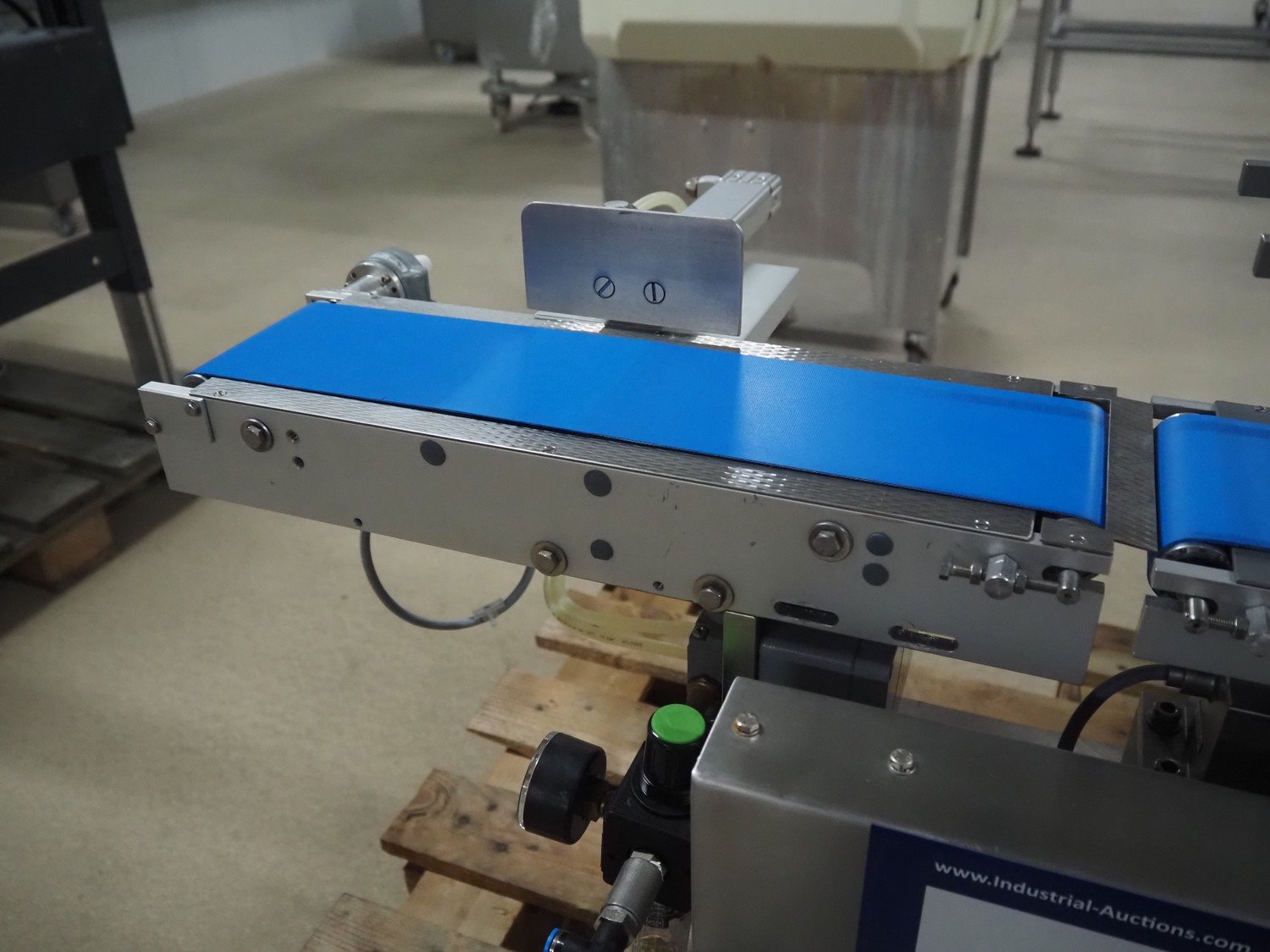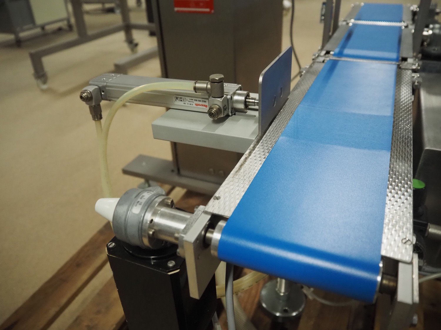 Bosch checkweigher with rejector, type: KWE 5000, number: 809486, year of construction: 2006, 230 V, 1 Ph, 50/60 Hz, 16/3 A, maximum capacity: 2000 g, minimum capacity: 20 g, plastic belts, belt width: 100 mm, total dimensions: 1050 mm x 1050 mm x 1050 mm.