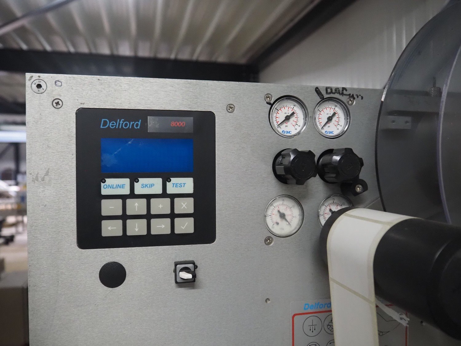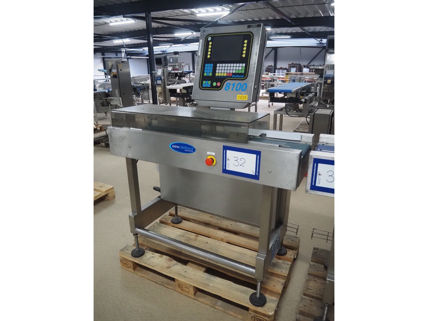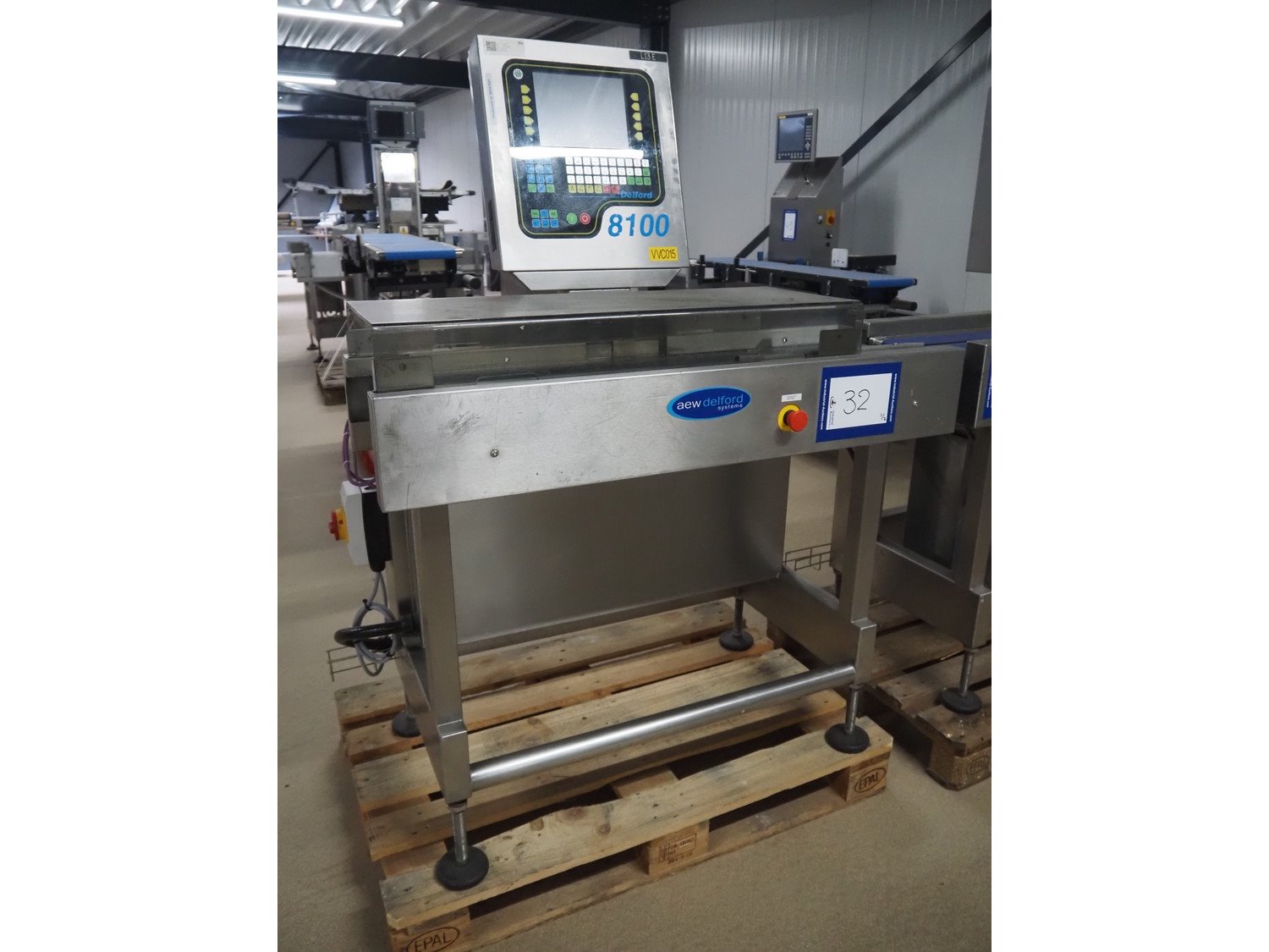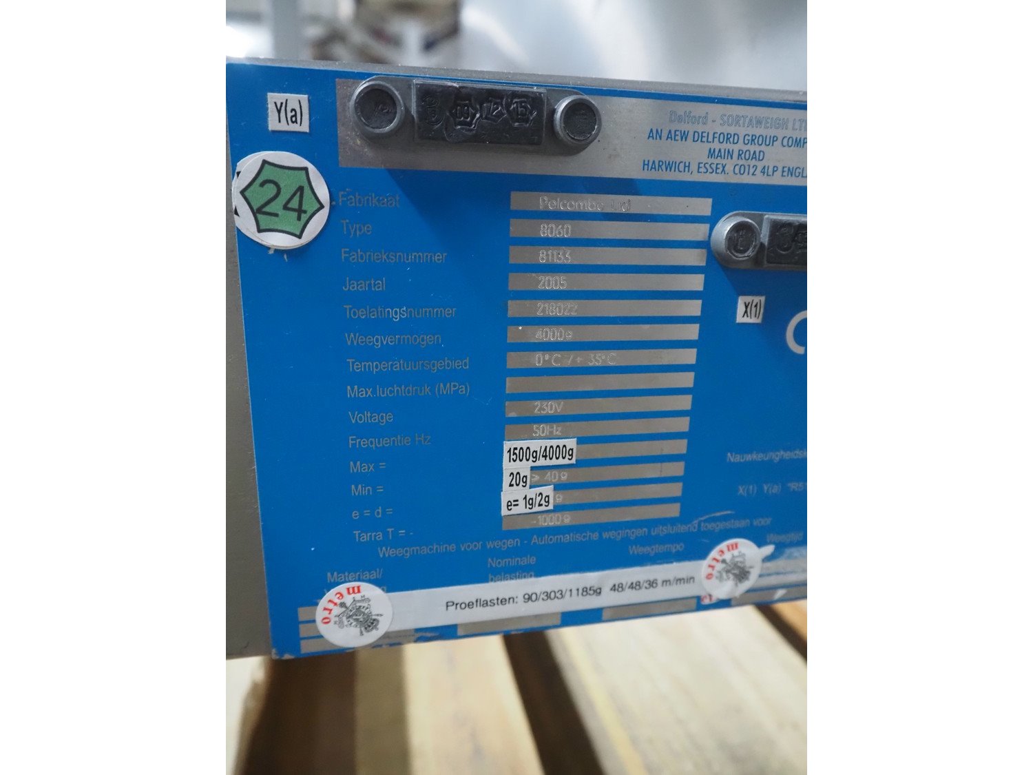 AEW Delford checkweigher with labelling machine, type checkweigher: 8060, fabrication number: 81133, year of construction: 2005, 230 V, 50 Hz, maximum weight: 1500-4000 gram, minimum weight: 20-40 gram, e =1-2 gram, T = -1000 gram, type labeller: 8000, plastic belt, belt width: (2x) 90 mm and 195 mm, dimensions checkweigher: 1500 mm x 700 mm x 1630 mm and dimensions labelling machine: 1200 mm x 700 mm x 1530 mm.