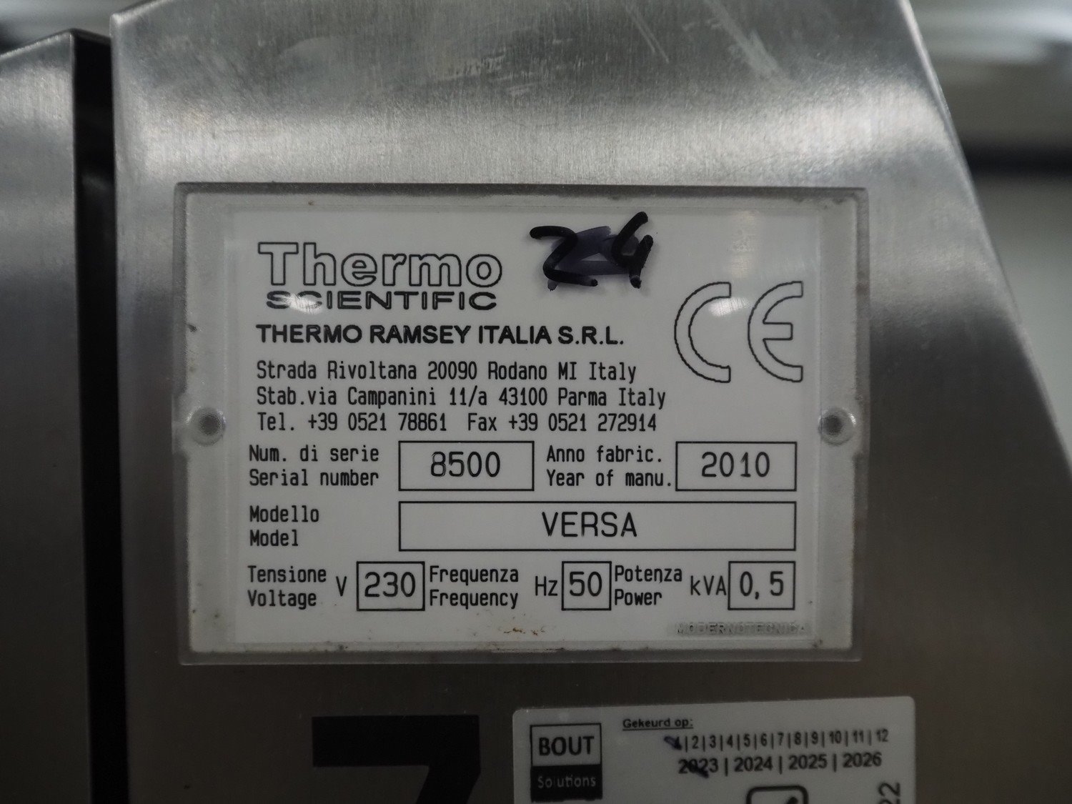 Thermo Scientific checkweigher with rejector, model: VersaWeigh, serial number: 8500, year of construction: 2010, 230 V, 50-60 Hz, minimum weight: 350 gram, maximum weight: 12000 gram, e=d= 5 gram, maximum speed: 1.2 m/s, plastic belt, belt width: 300 mm, total dimensions: 1250 mm x 1100 mm x 1550 mm.