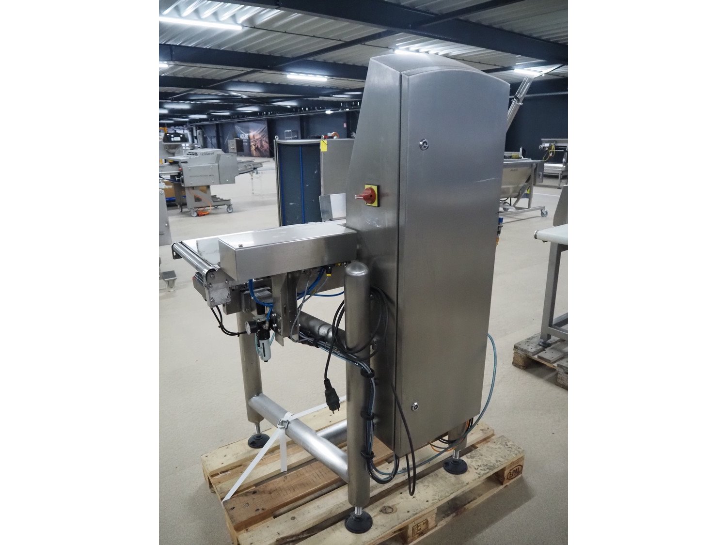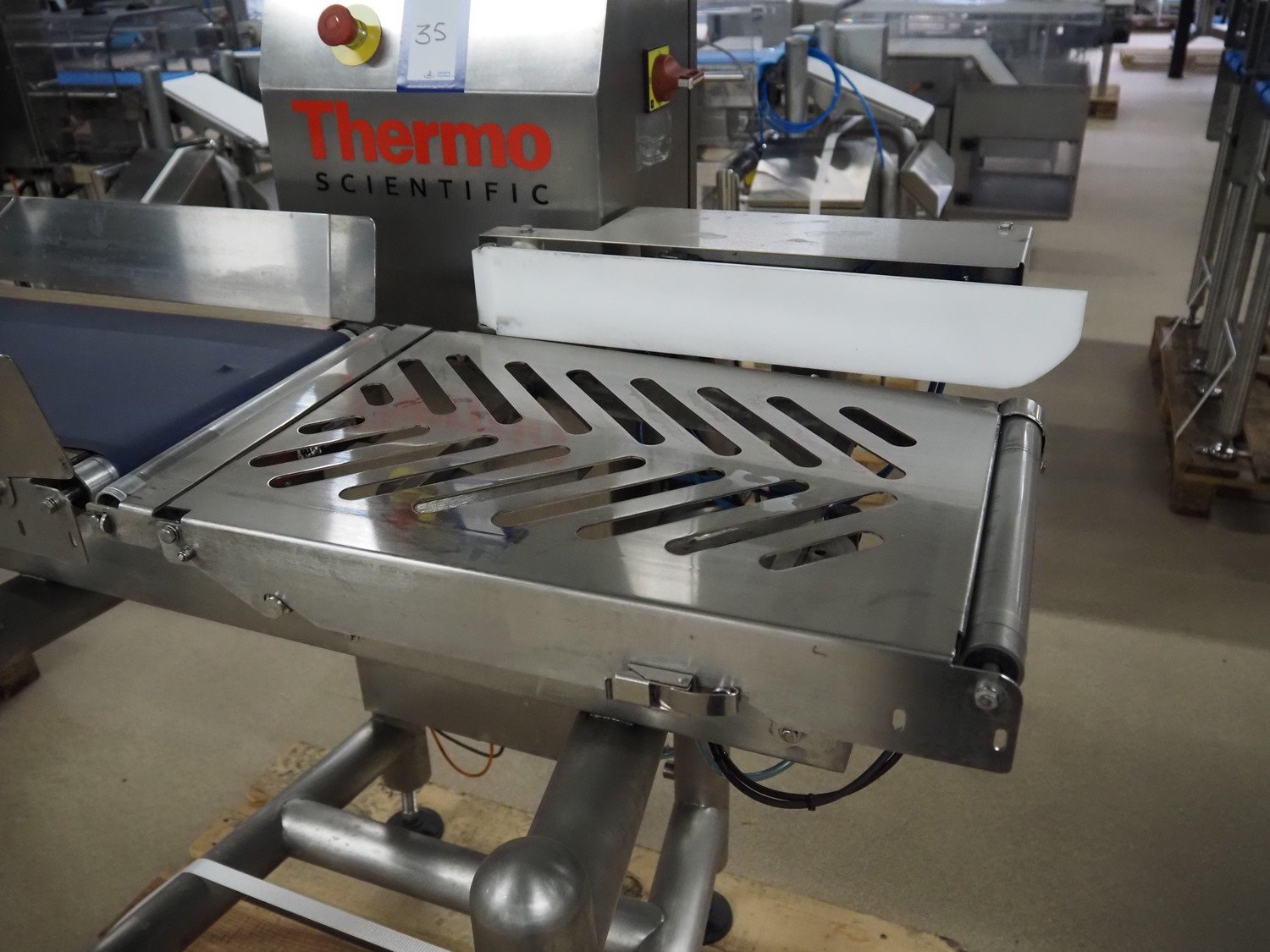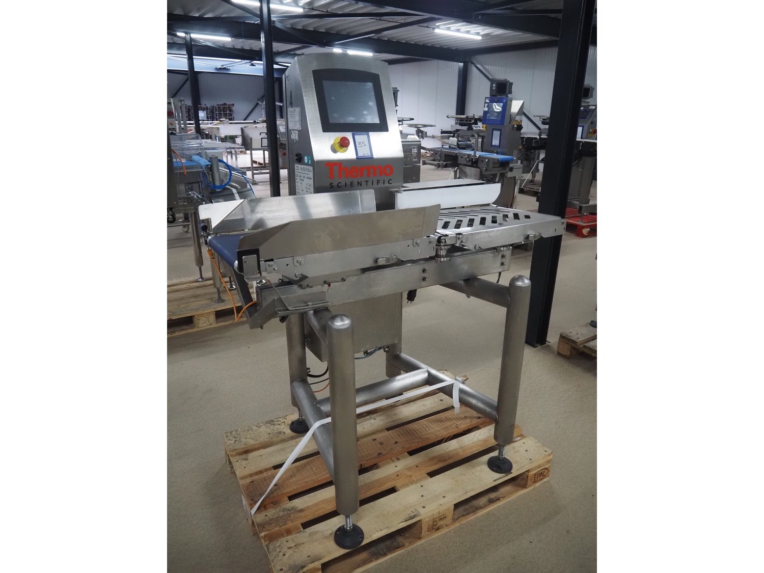 Thermo Scientific checkweigher, model: VersaWeigh, serial number: 7820, year of construction: 2008, 230 V, 50-60 Hz, minimum weight: 350 gram, maximum weight: 12000 gram, e=d= 5 gram, plastic belt, belt width: 290 mm, total dimensions: 1230 mm x 900 mm x 1550 mm. Technical condition unknown.