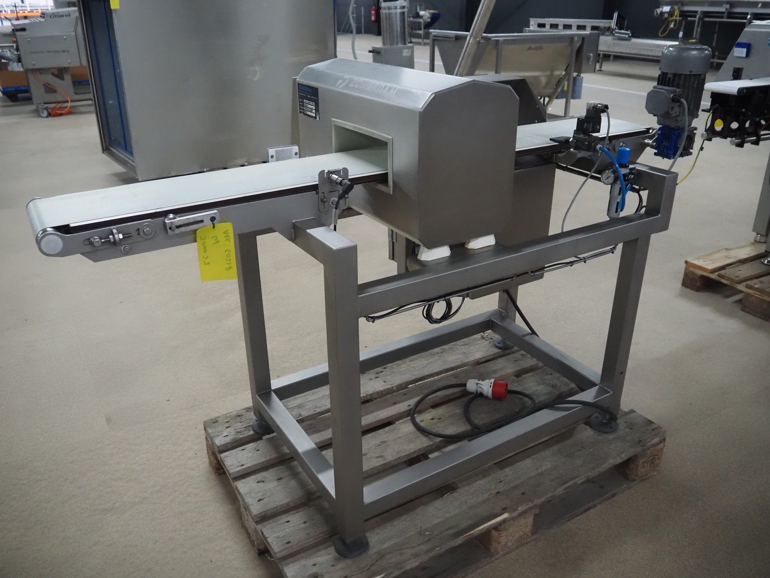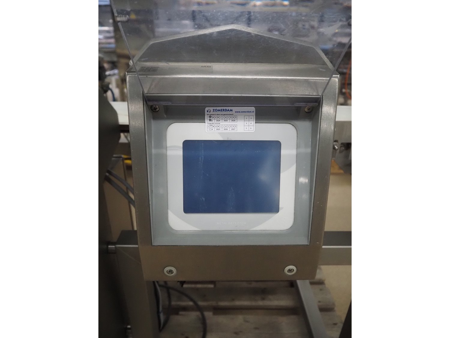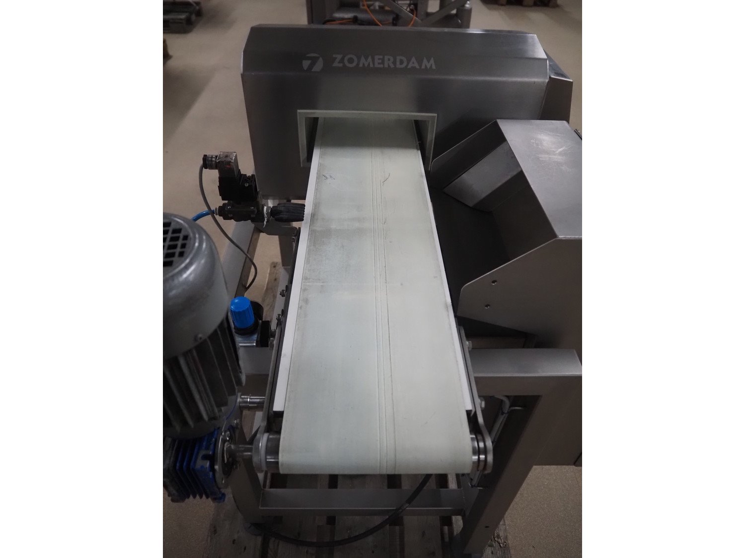 Zomerdam metal detector with rejector, serial number: 31224, 400 V, 2 A, 0.25 kW, year of construction: 2009, plastic belt, belt width: 200 mm, clearance: 250 mm x 70 mm, total dimensions: 1680 mm x 800 mm x 1050 mm.