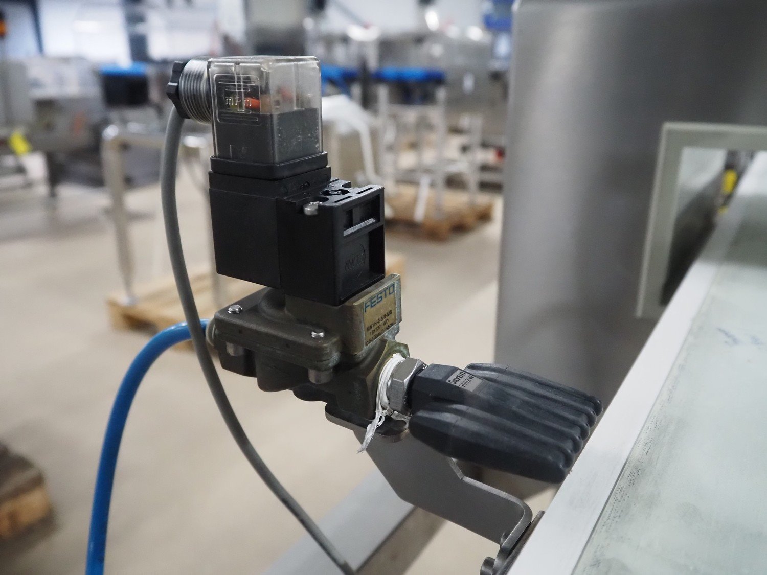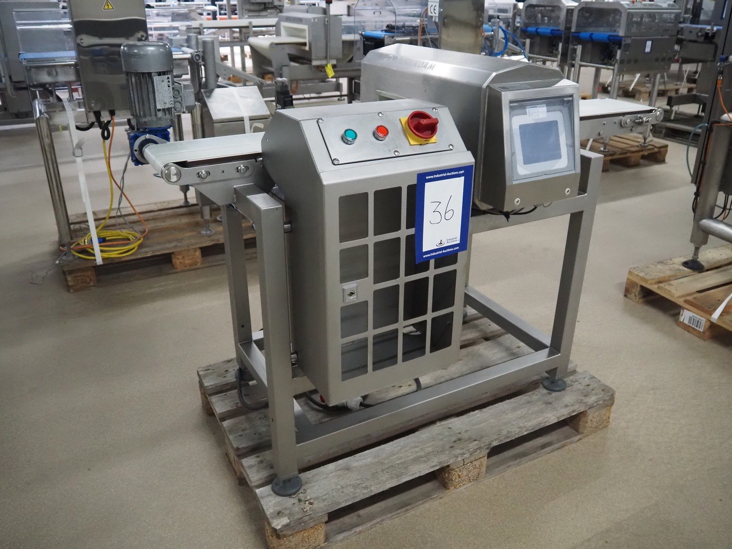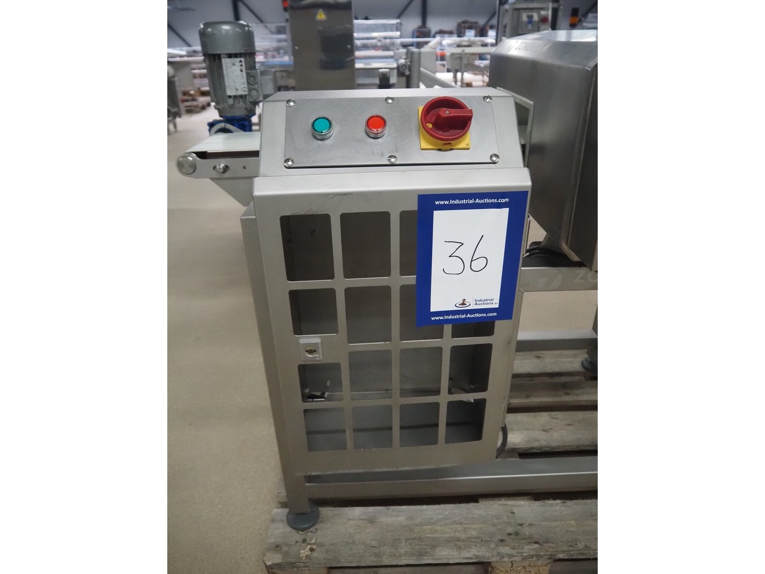 Zomerdam metal detector with rejector, serial number: 31224, 400 V, 2 A, 0.25 kW, year of construction: 2009, plastic belt, belt width: 200 mm, clearance: 250 mm x 70 mm, total dimensions: 1680 mm x 800 mm x 1050 mm.