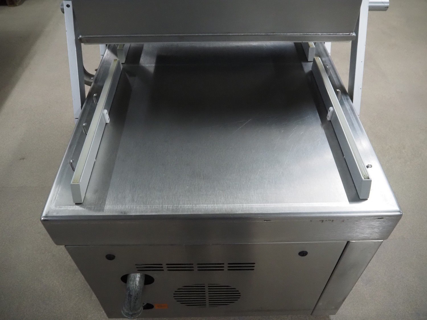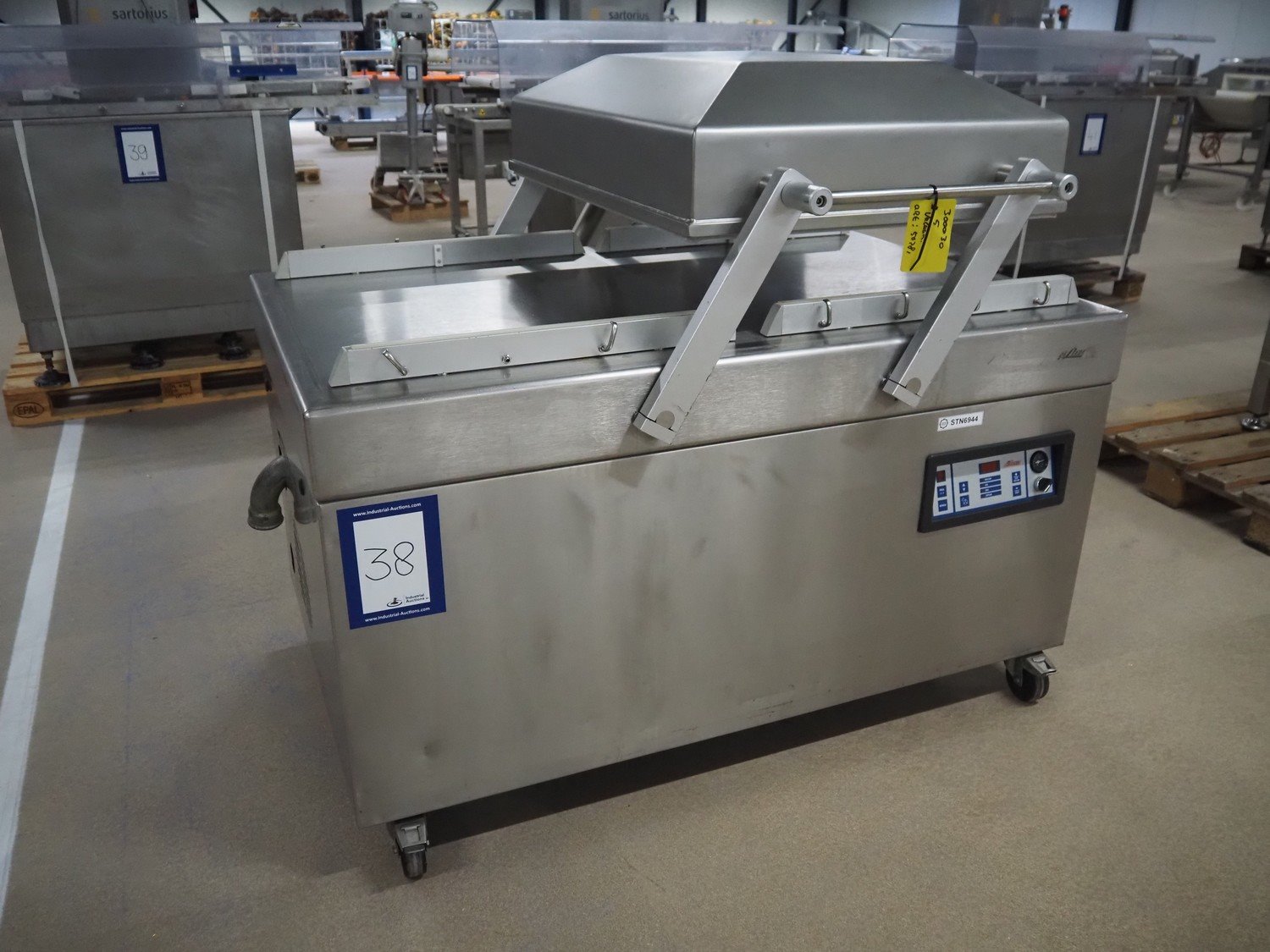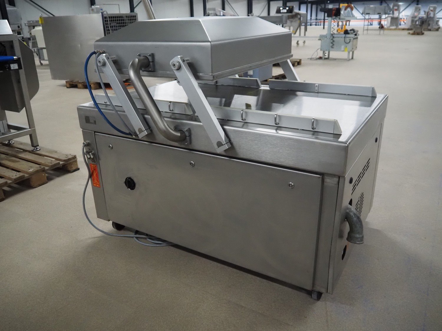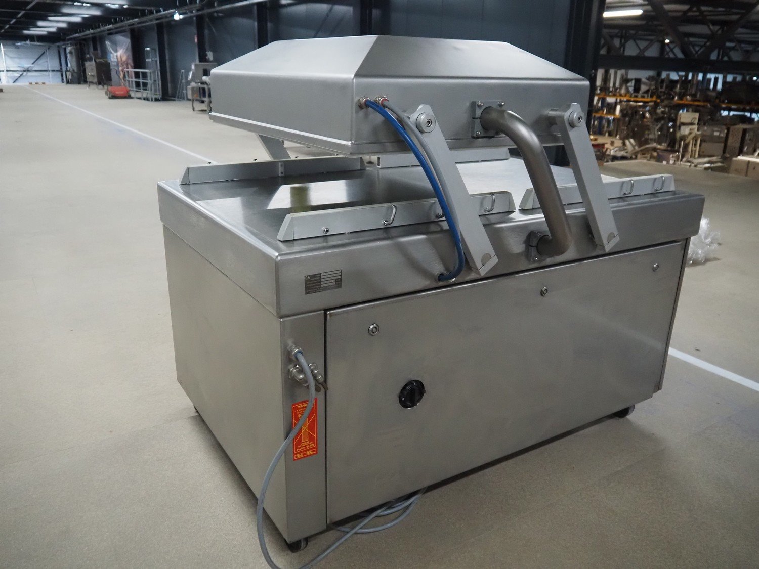 Lexovac mobile double chamber vacuum machine, type: 650, serial number: P400901005, year of construction: 2009, 400 V, 5.5 W, seal length: (4x) 620 mm, chamber: (2x) 650 mm x 750 mm, Busch vacuum pump, type: RA 0160 D 5Z1 QLXX, capacity: 160 m³ per hour, total dimensions: 1500 mm x 1200 mm x 1400 mm.