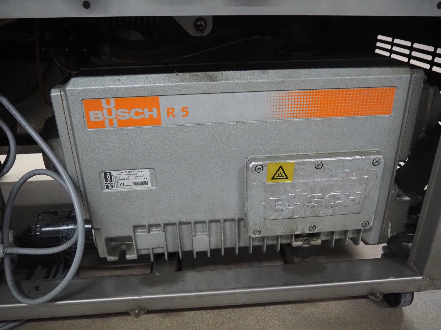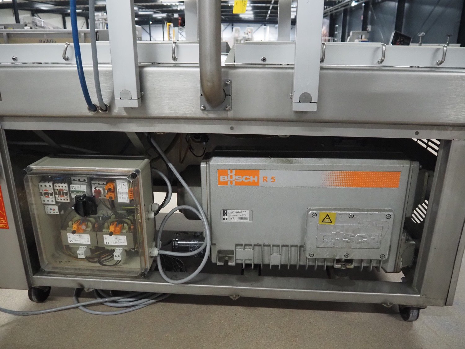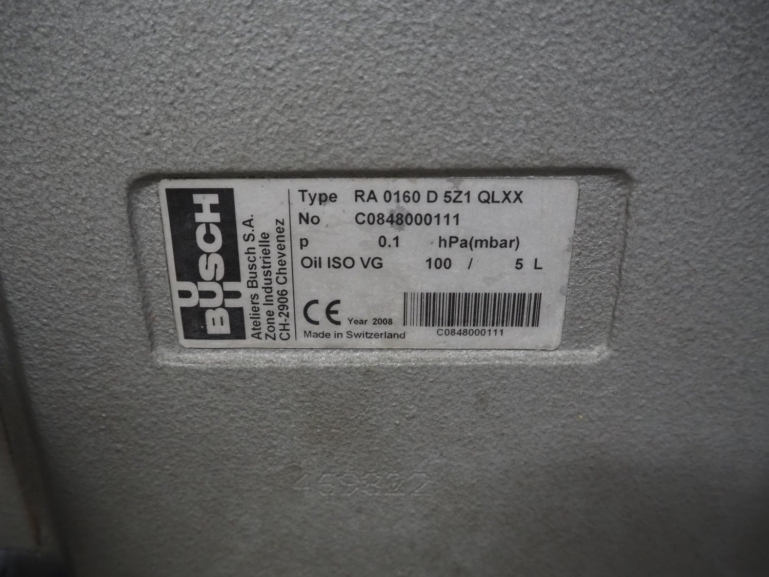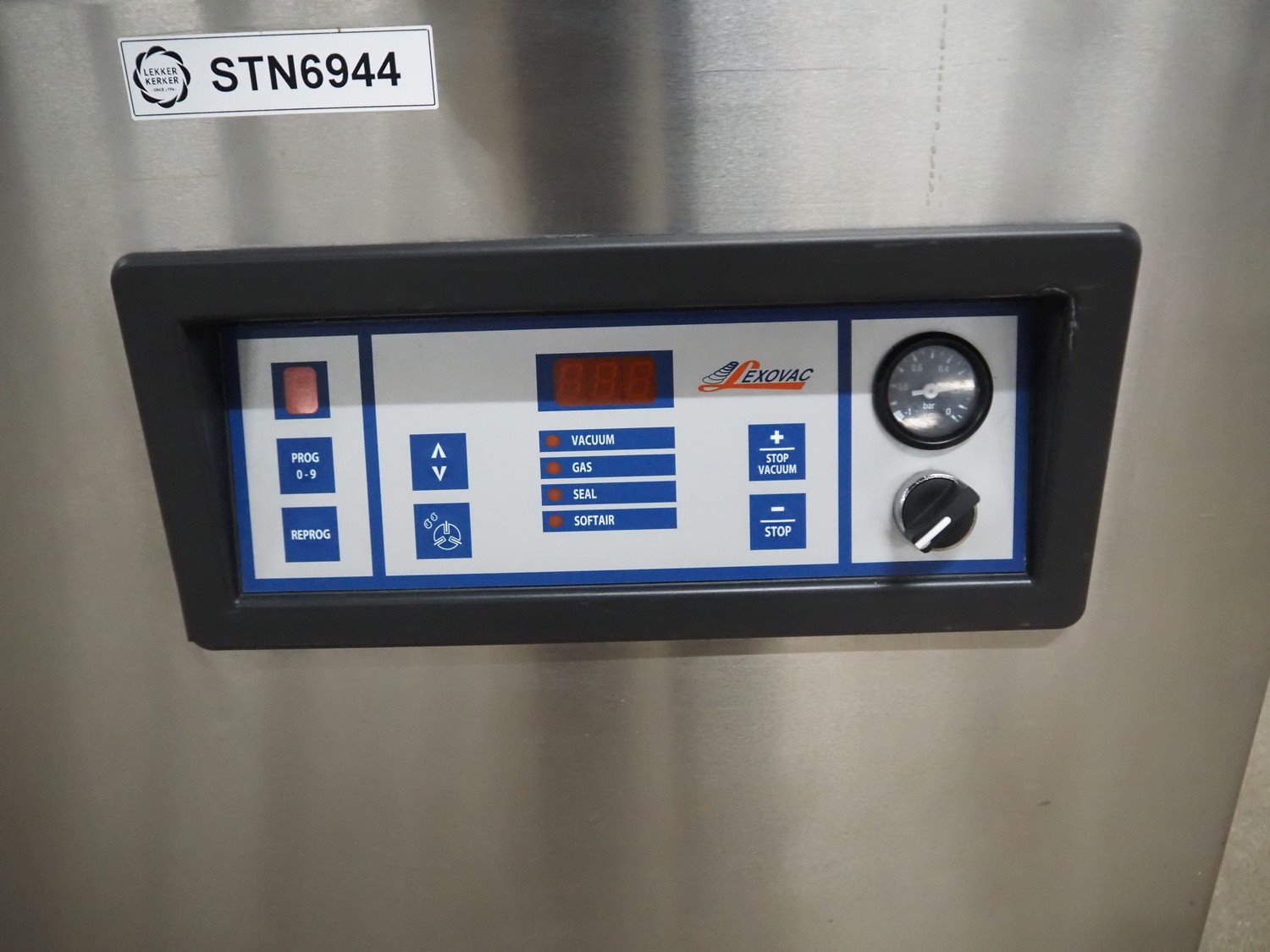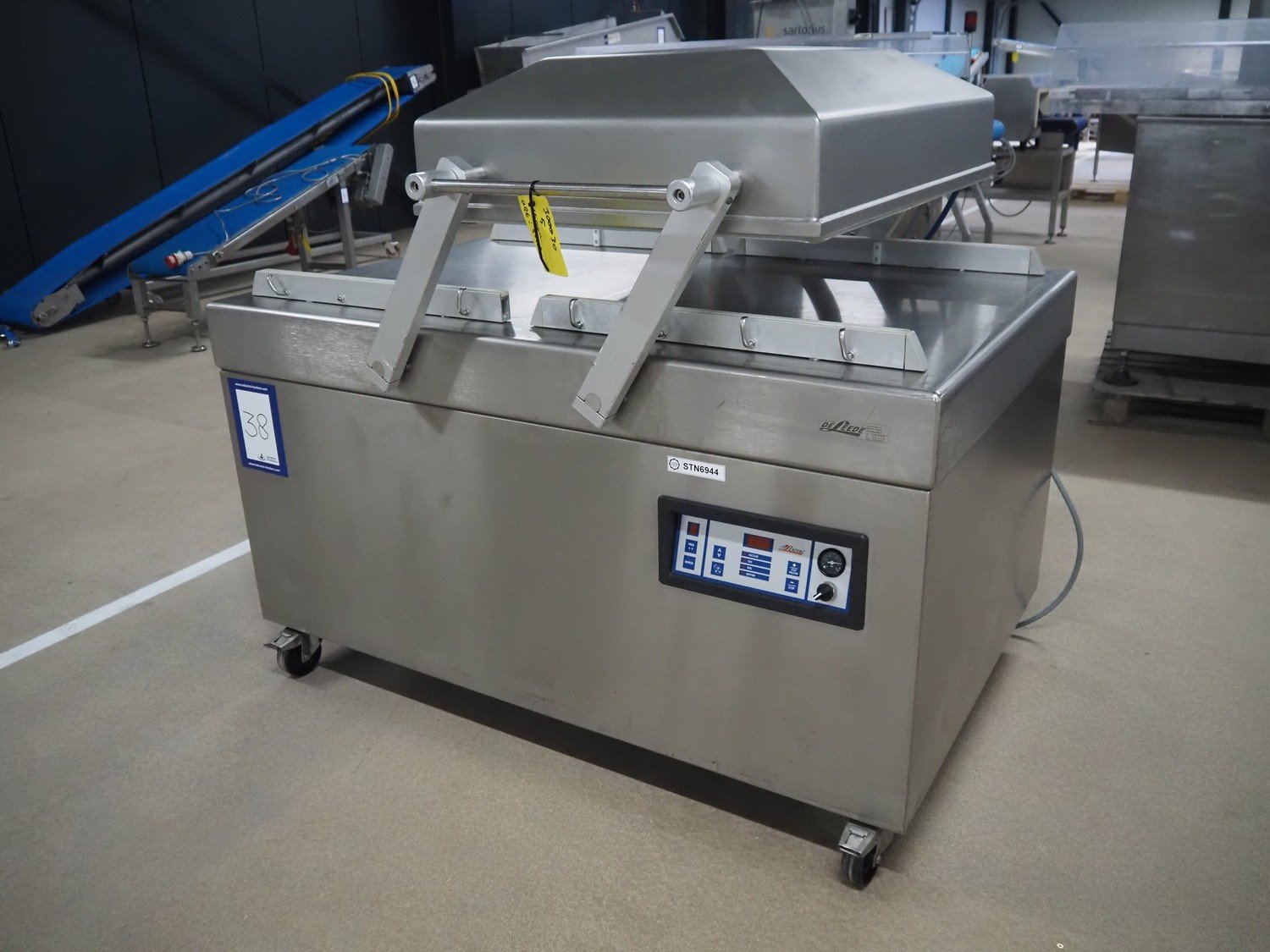 Lexovac mobile double chamber vacuum machine, type: 650, serial number: P400901005, year of construction: 2009, 400 V, 5.5 W, seal length: (4x) 620 mm, chamber: (2x) 650 mm x 750 mm, Busch vacuum pump, type: RA 0160 D 5Z1 QLXX, capacity: 160 m³ per hour, total dimensions: 1500 mm x 1200 mm x 1400 mm.