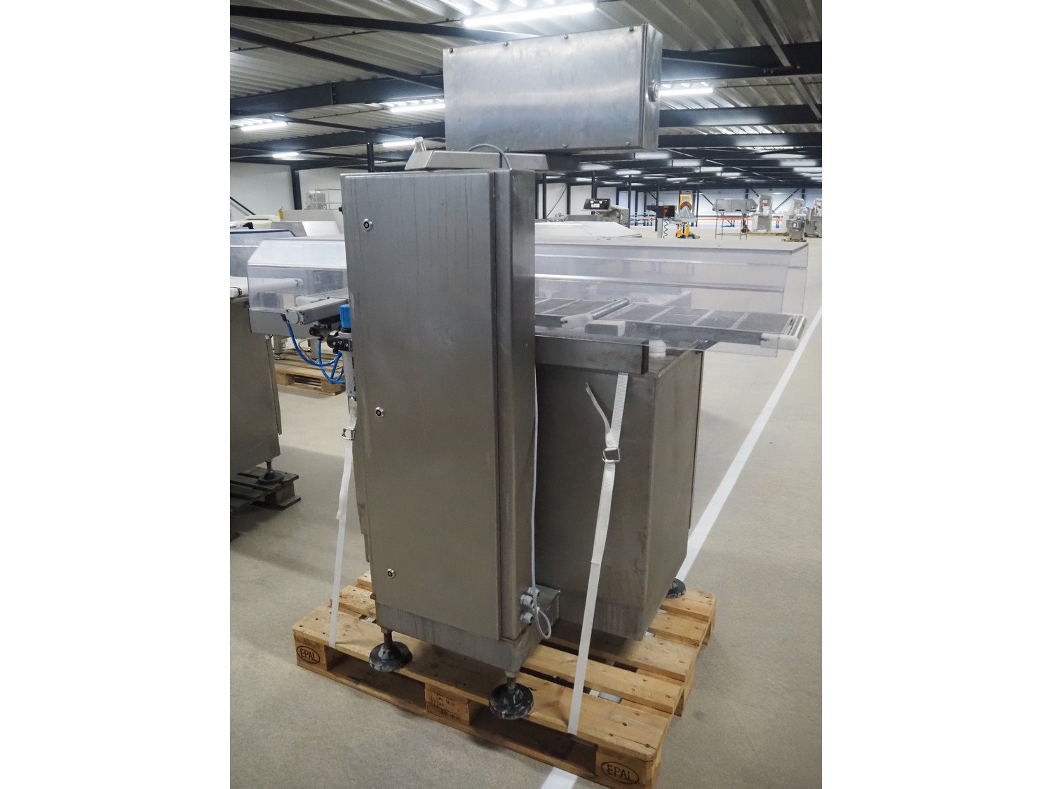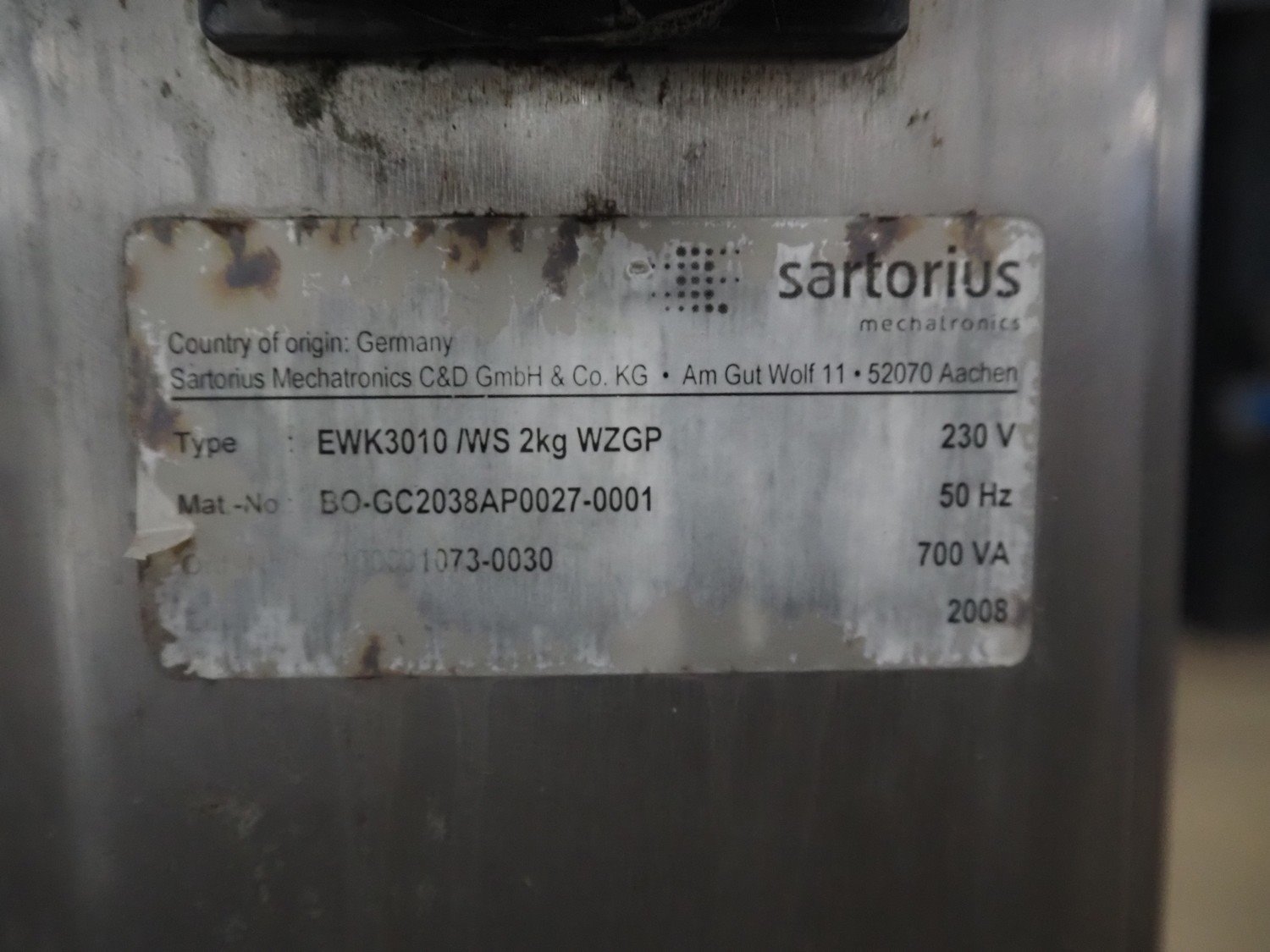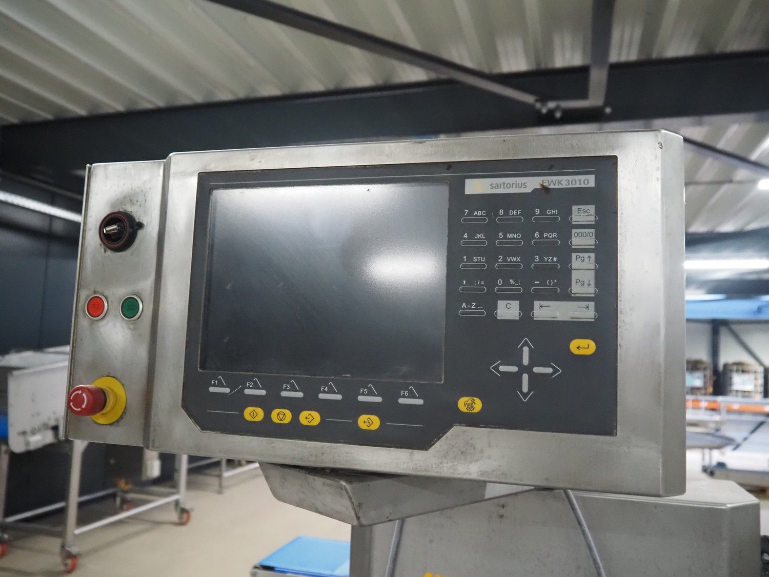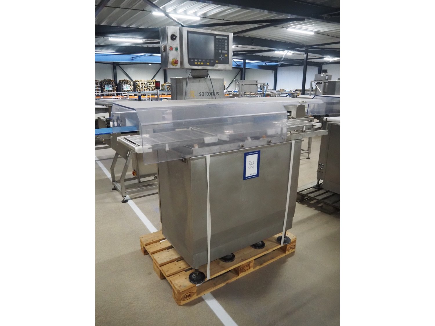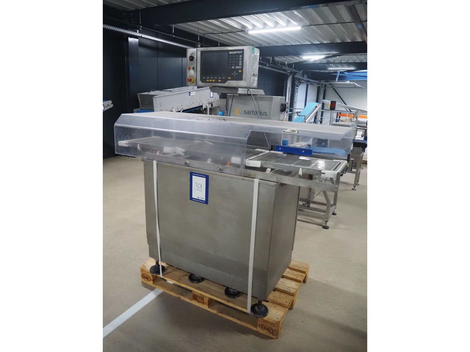 Sartorius checkweigher with rejector, type: EWK3010, number: BO-GC2038AP0027-001, year of construction: 2008, 230 V, 50 Hz, 700 vA, e=d= 0.2 gram, belt width: 300 mm, total dimensions: 1600 mm x 900 mm x 1700 mm. Missing belt.