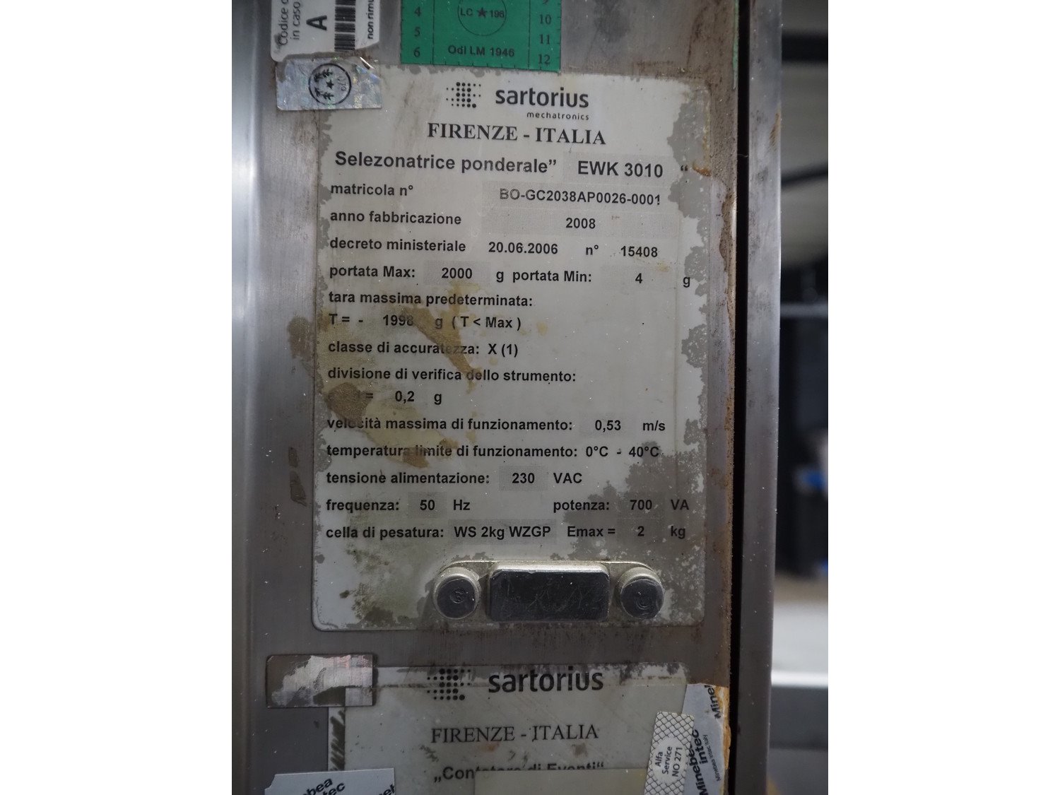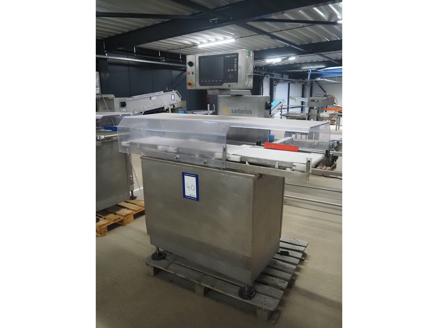 Sartorius checkweigher with rejector, type: EWK3010, number: BO-GC2038AP0026-001, year of construction: 2008, 230 V, 50 Hz, 700 vA, e=d= 0.2 gram, plastic belt, belt width: 300 mm, total dimensions: 1600 mm x 900 mm x 1700 mm.