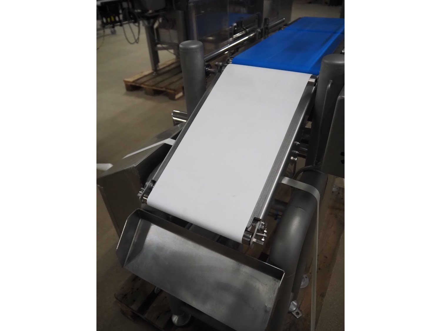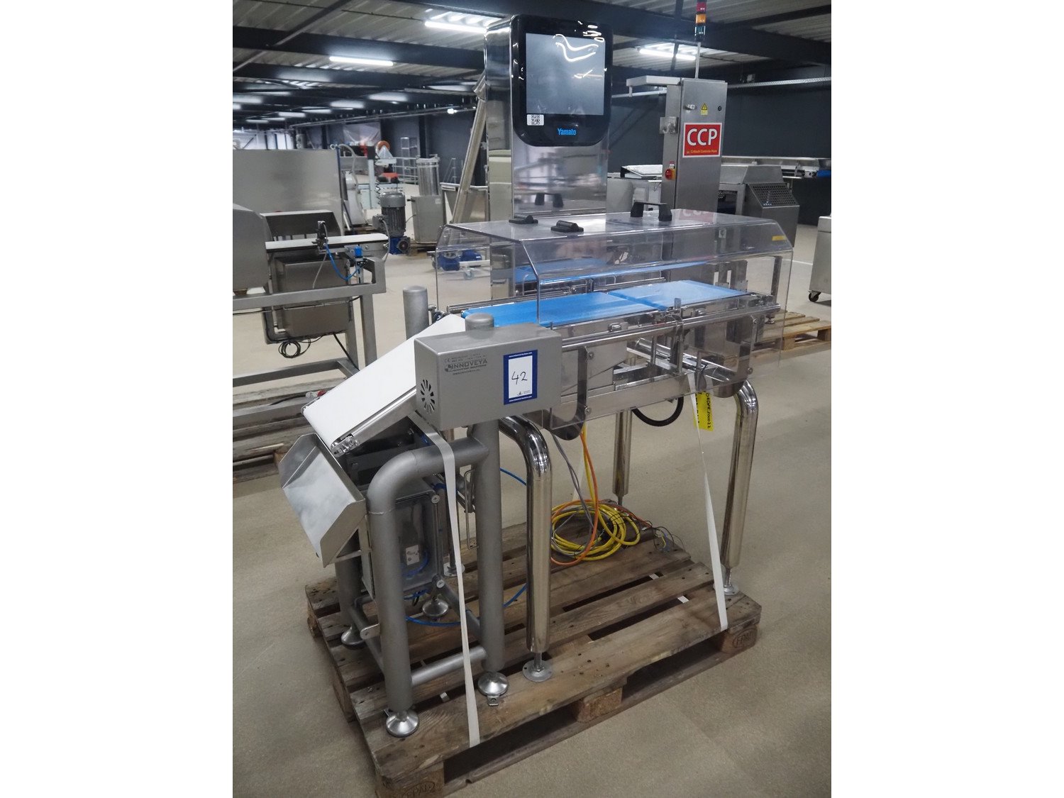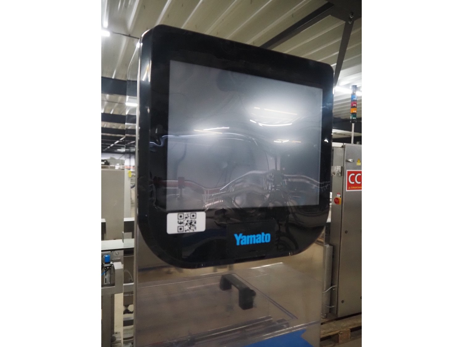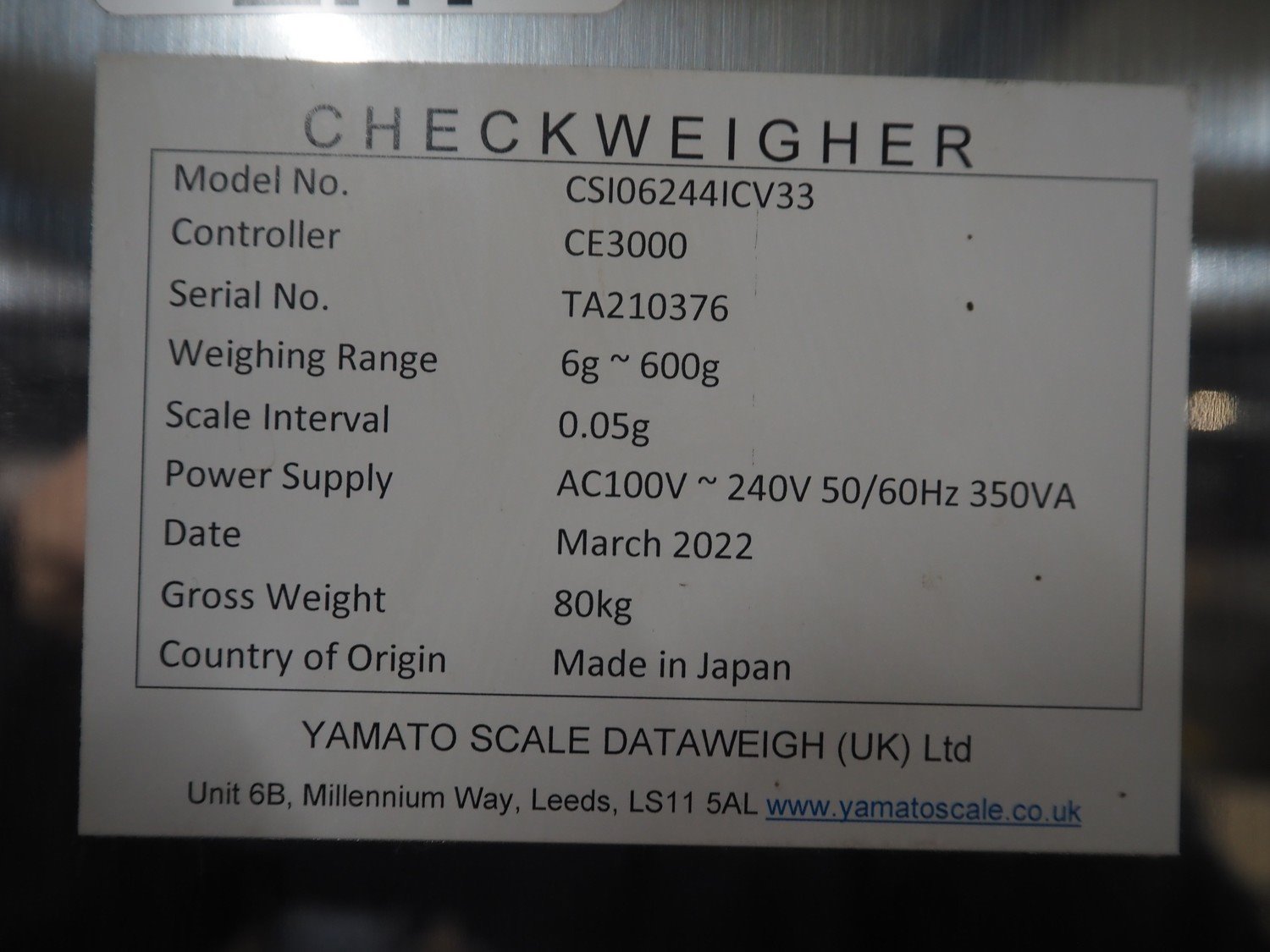 Yamato checkweigher with rejecting belt, model: CSI06244ICV33, serial number: TA210376, year of construction: 03/2022, 100/240 V, 1 Ph, 50/60 Hz, maximum weight: 600 g, minimum weight: 6 g, plastic belts, belt width: 240 mm, total dimensions: 1250 mm x 750 mm x 1630 mm.