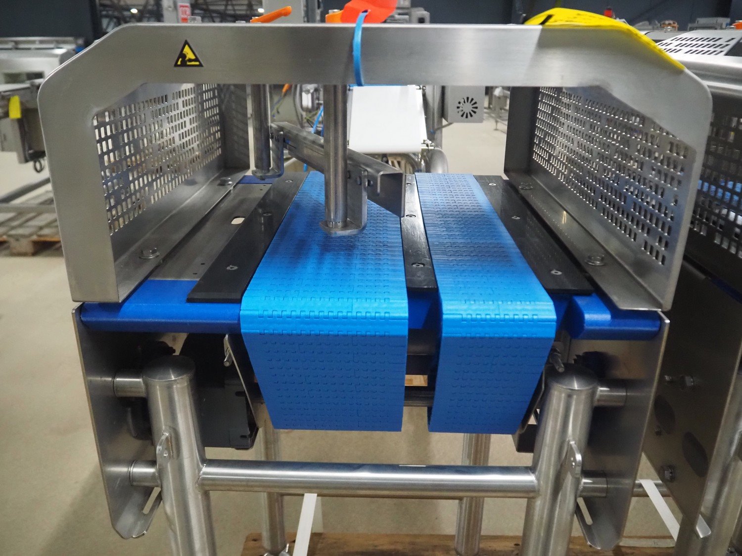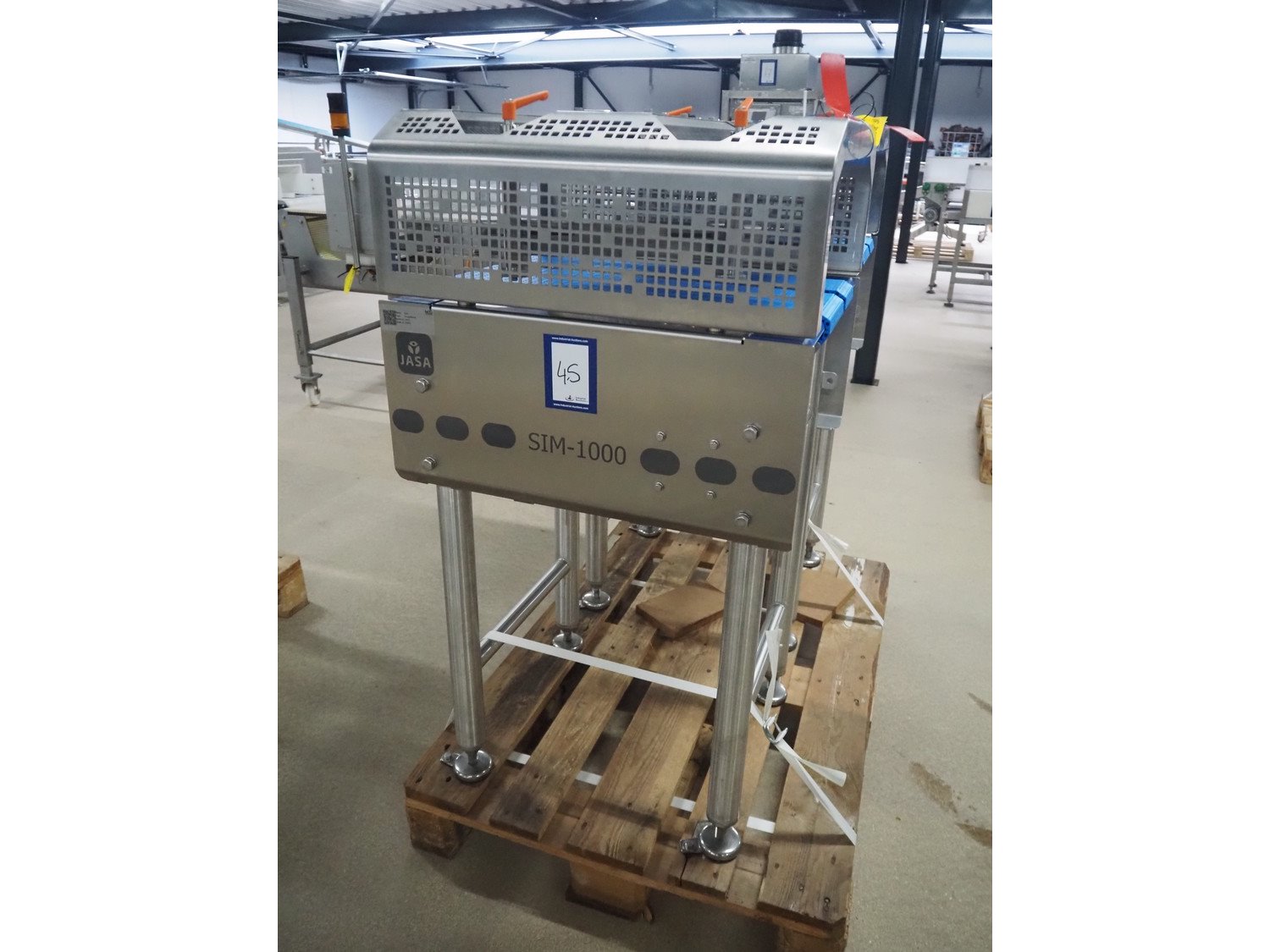 Jasa Packaging Solutions in/outfeed module, model: SIM-1000 DRAAI UNIT, 400 V, 3 Ph, 16 A, 0.47 kW, 6 bar, plastic belts, belt width: (1x) 100 mm, (1x) 150 mm, total dimensions: 600 mm x 550 mm x 1550 mm.