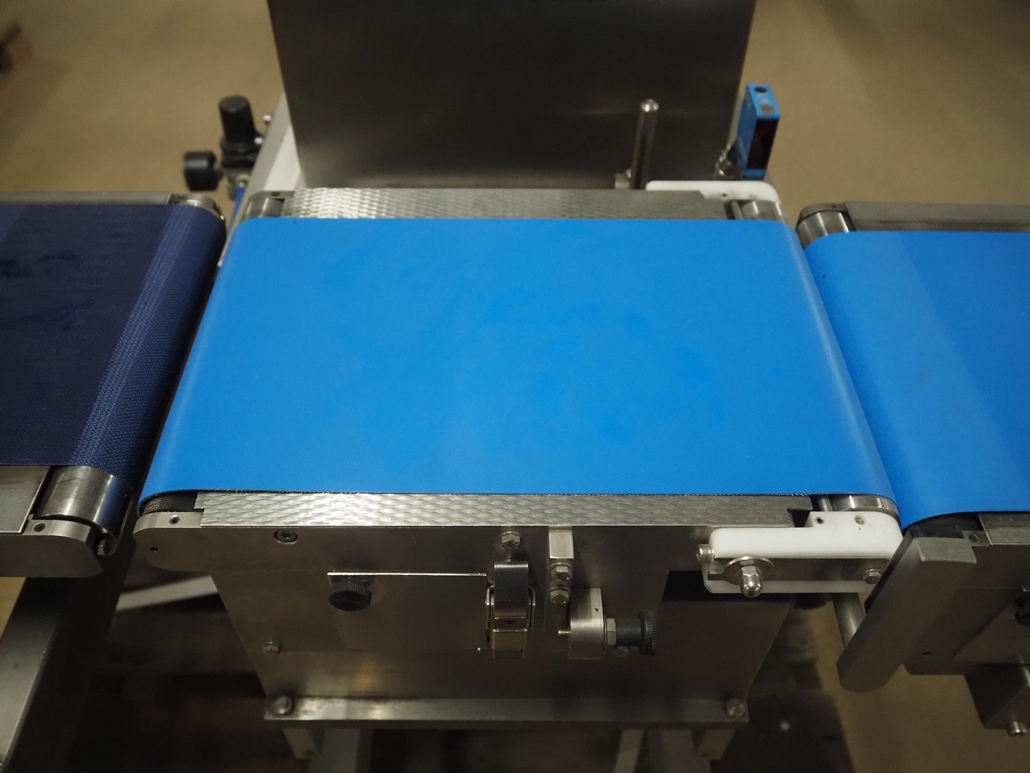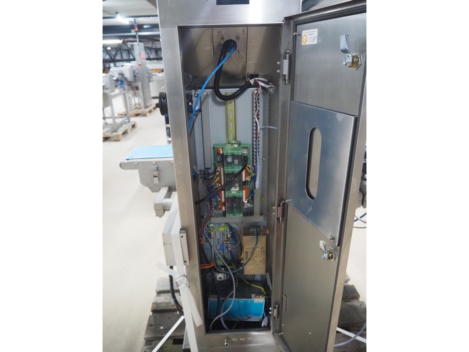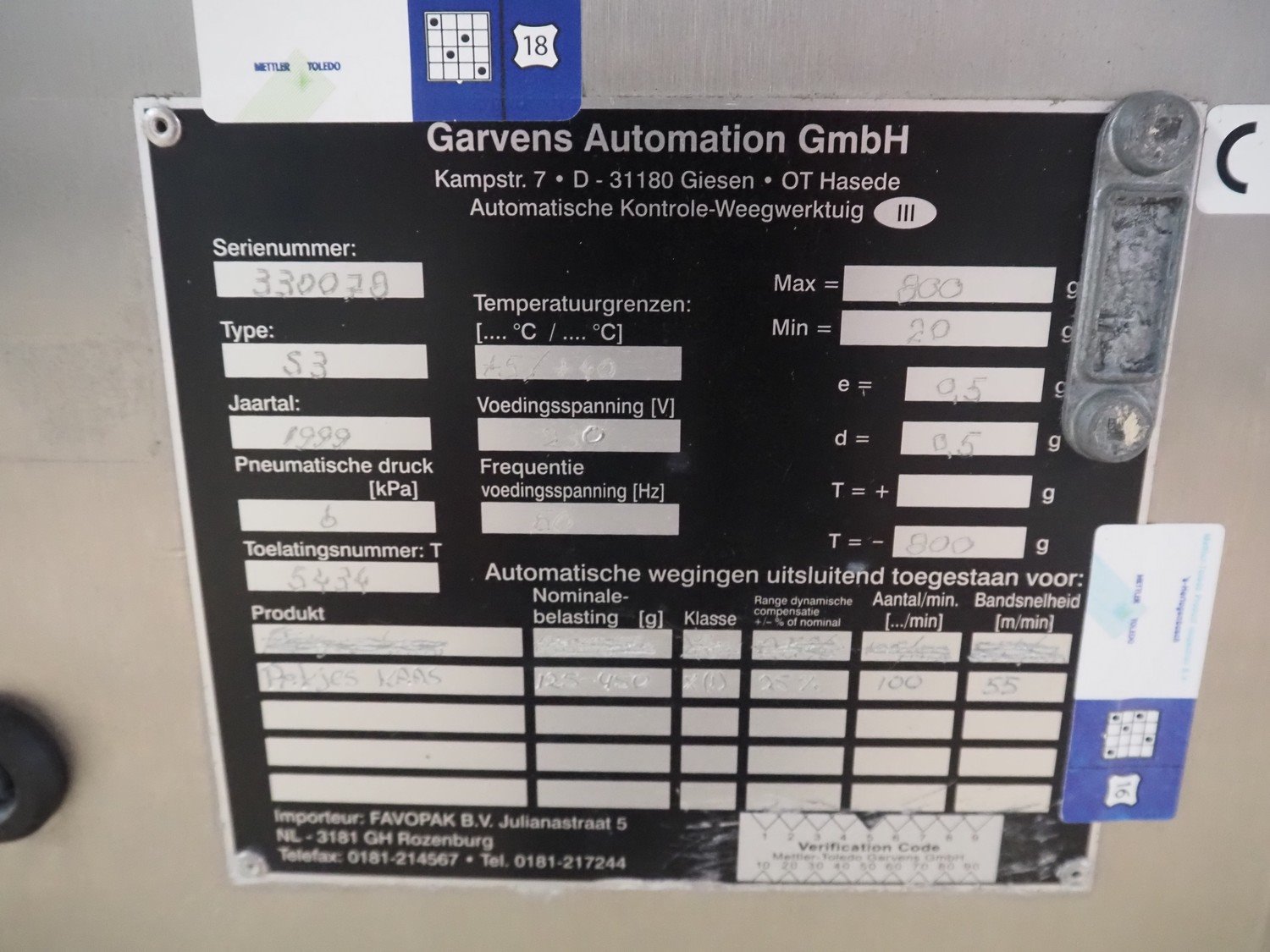 Garvens Automation GmbH checkweigher with rejector, type: S3, serial number: 330078, year of construction: 1999, 230 V, 50 Hz, maximum: 800 gram, minimum: 20 gram, e= 0.5 gram, plastic belt, belt width: 200 mm, total dimensions: 1200 mm x 750 mm x 1500 mm.