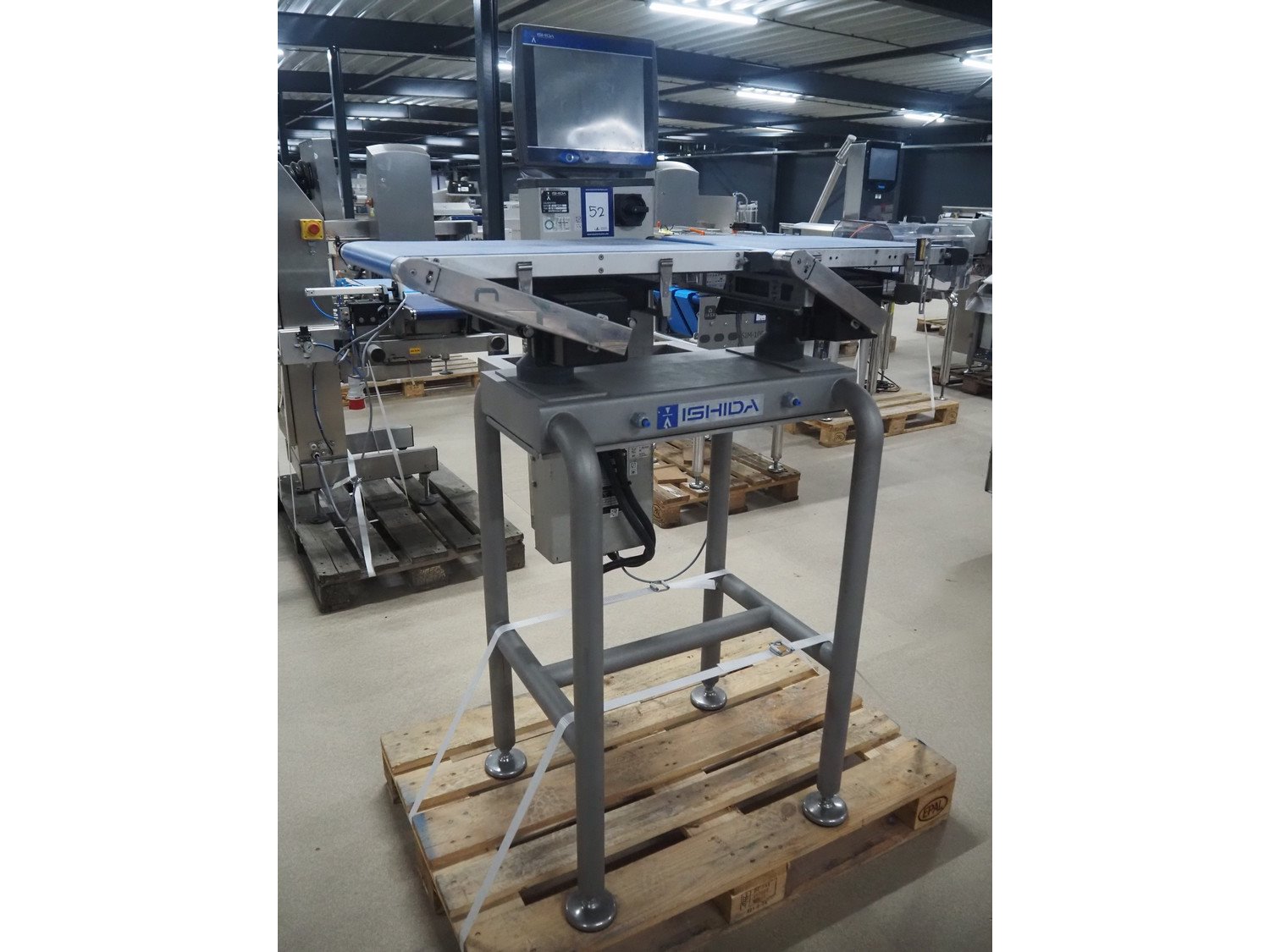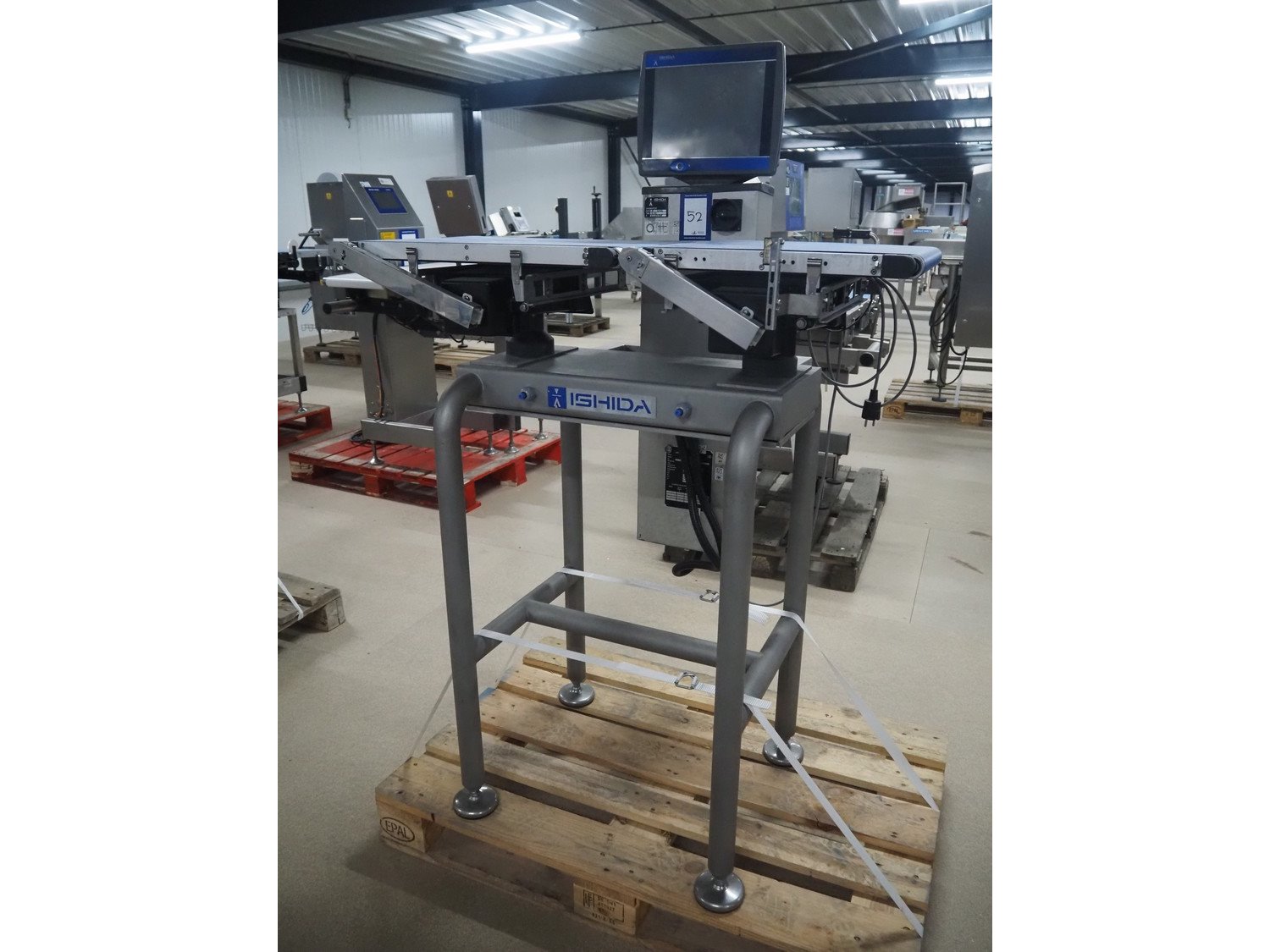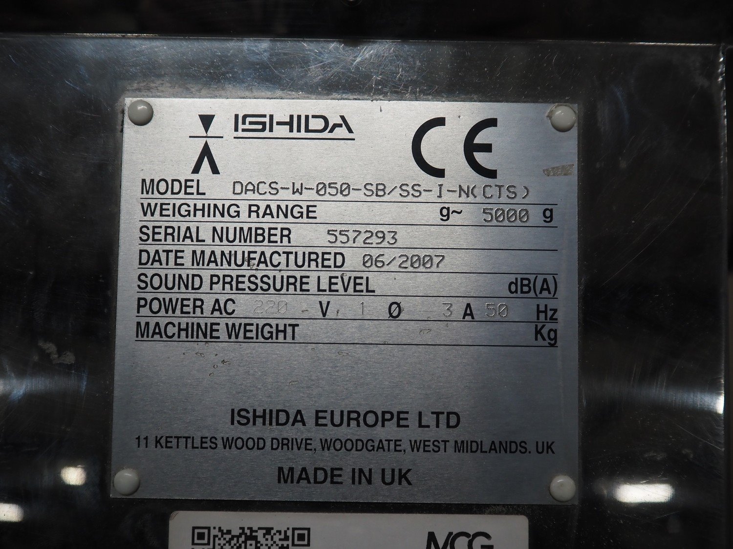 Ishida checkweigher, model: DACS-W-050-SB/SS-I-N(CTS), serial number: 557293, year of construction: 06/2007, 220 V, 1 Ph, 50 Hz, 3 A, plastic belt, belt width: 370 mm, total dimensions: 1070 mm x 850 mm x 1600 mm.