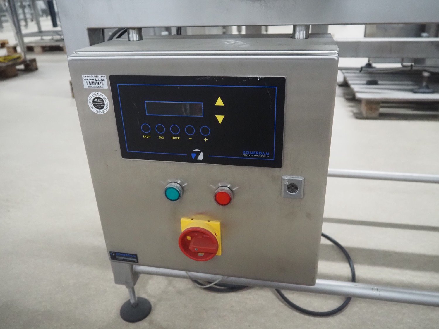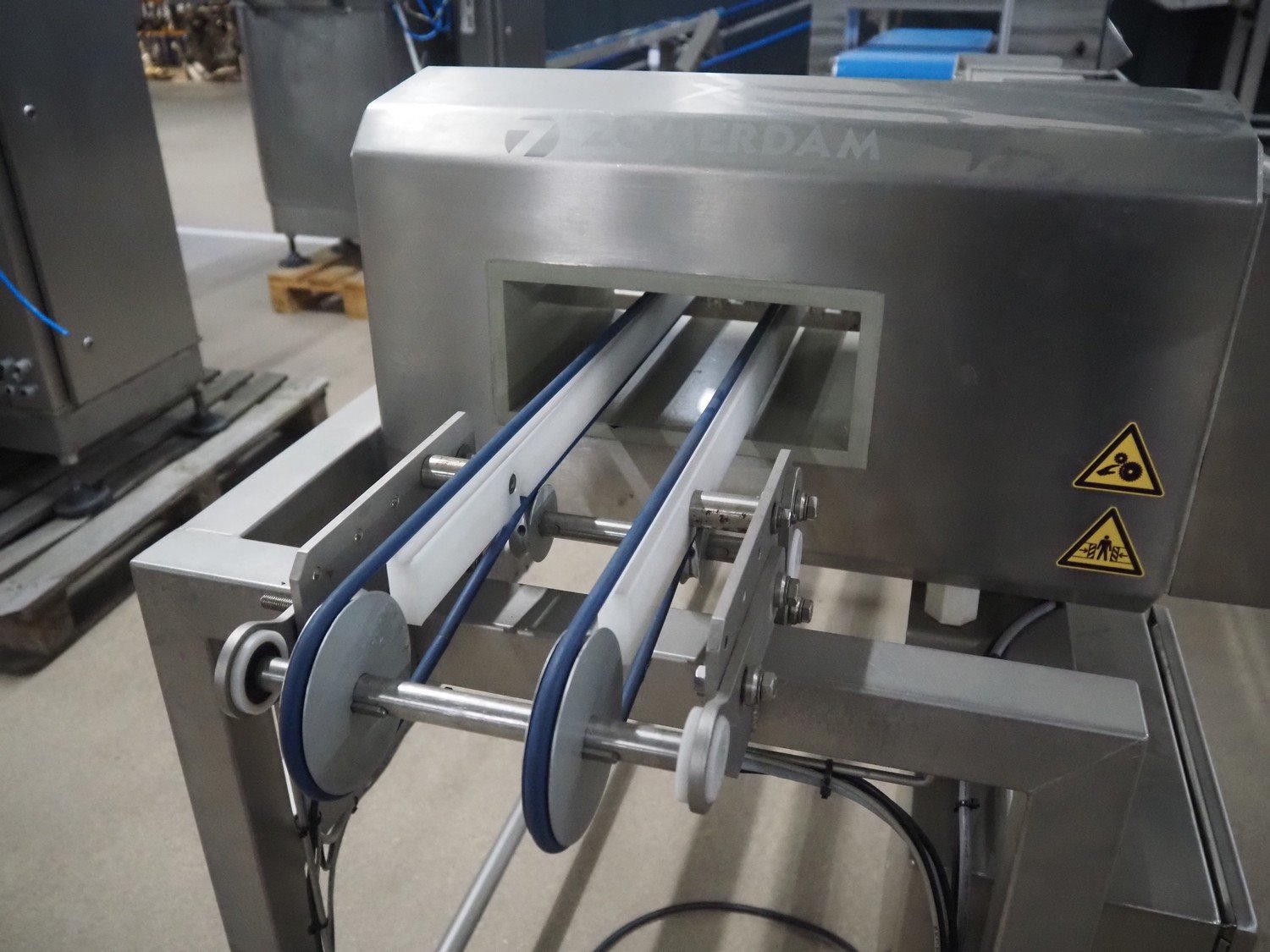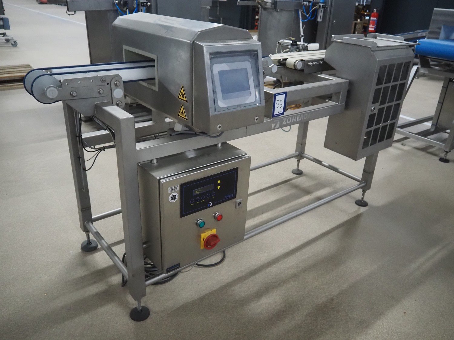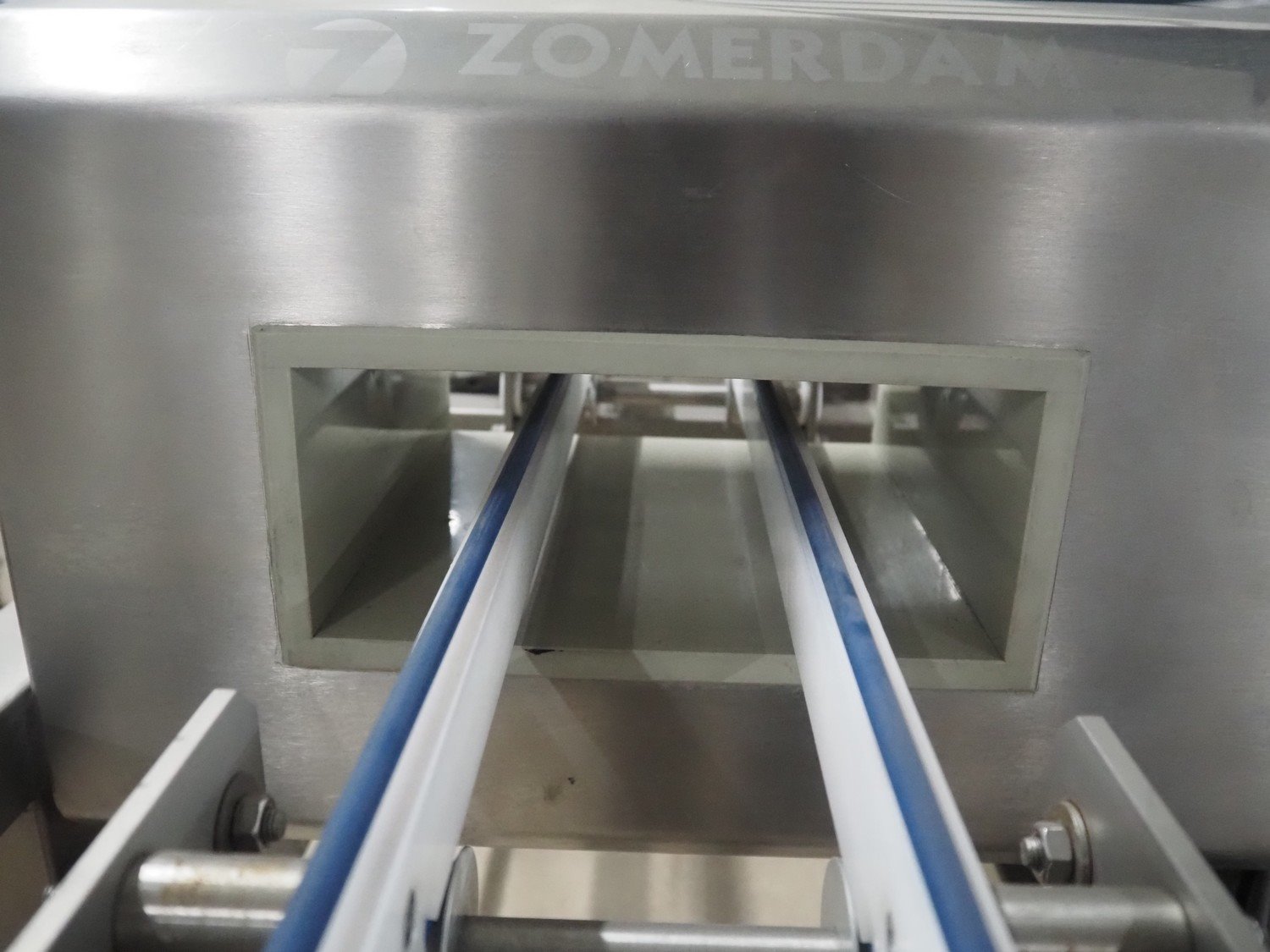 Zomerdam metal detector with rejector, type: MN 5.1 CI 250/100, serial number: 910816-CI, year of construction: 2009, 100/240 V, 50/60 Hz, 50/300 mA, string belt and plastic belt, belt width: 265 mm, clearance: 500 mm x 107 mm, total dimensions: 850 mm x 1850 mm x 1100 mm.