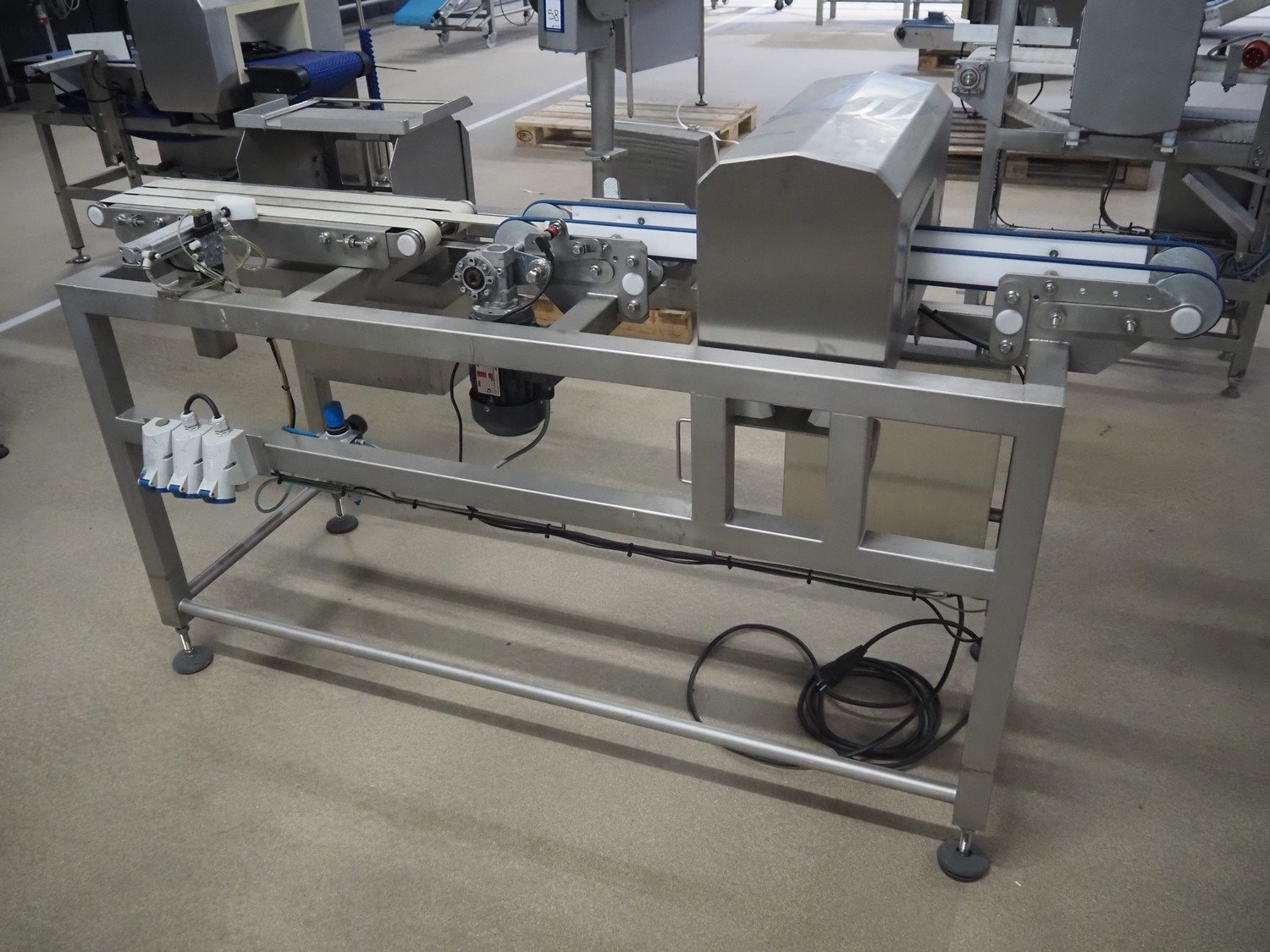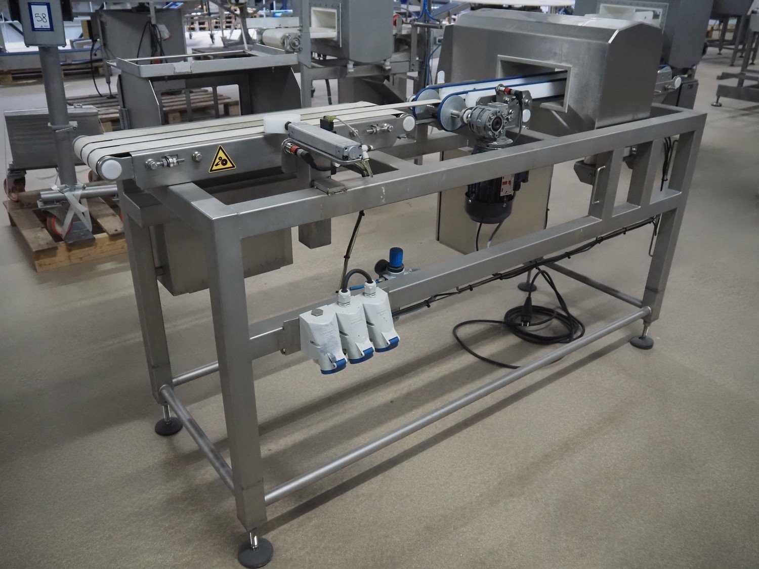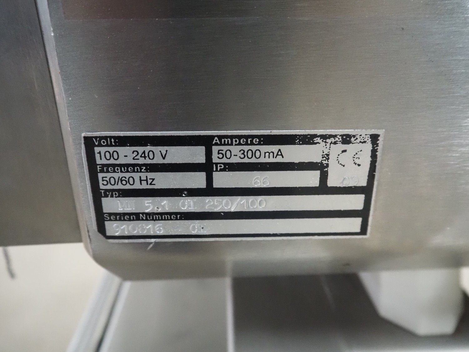 Zomerdam metal detector with rejector, type: MN 5.1 CI 250/100, serial number: 910816-CI, year of construction: 2009, 100/240 V, 50/60 Hz, 50/300 mA, string belt and plastic belt, belt width: 265 mm, clearance: 500 mm x 107 mm, total dimensions: 850 mm x 1850 mm x 1100 mm.