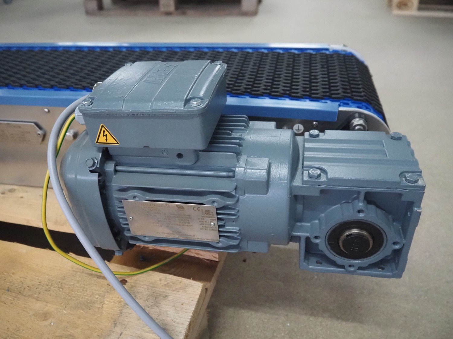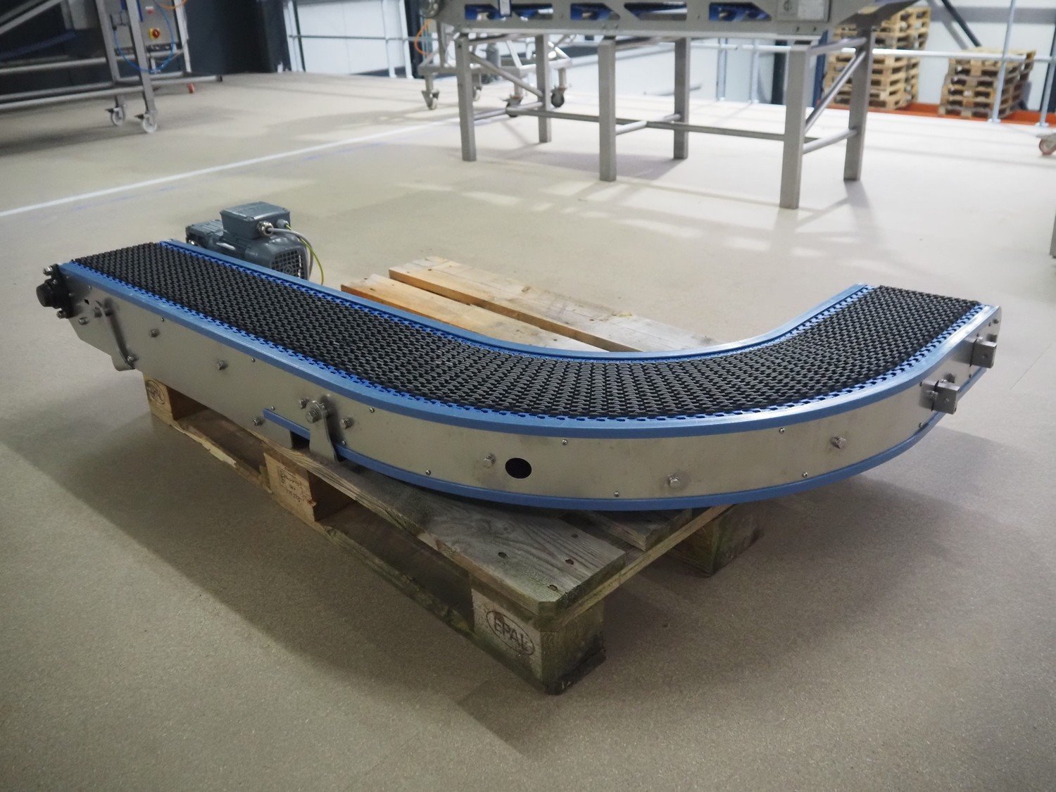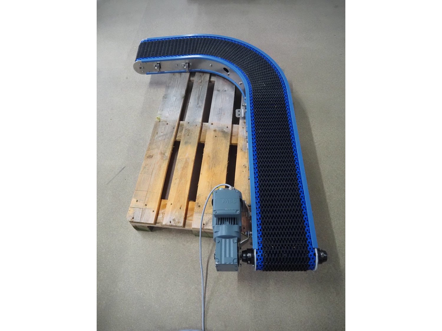 Hellings Machinebouw B.V. 90° curve conveyor, plastic mesh belt, belt width: 230 mm, total dimensions: 1600 mm x 1050 mm x 250 mm.