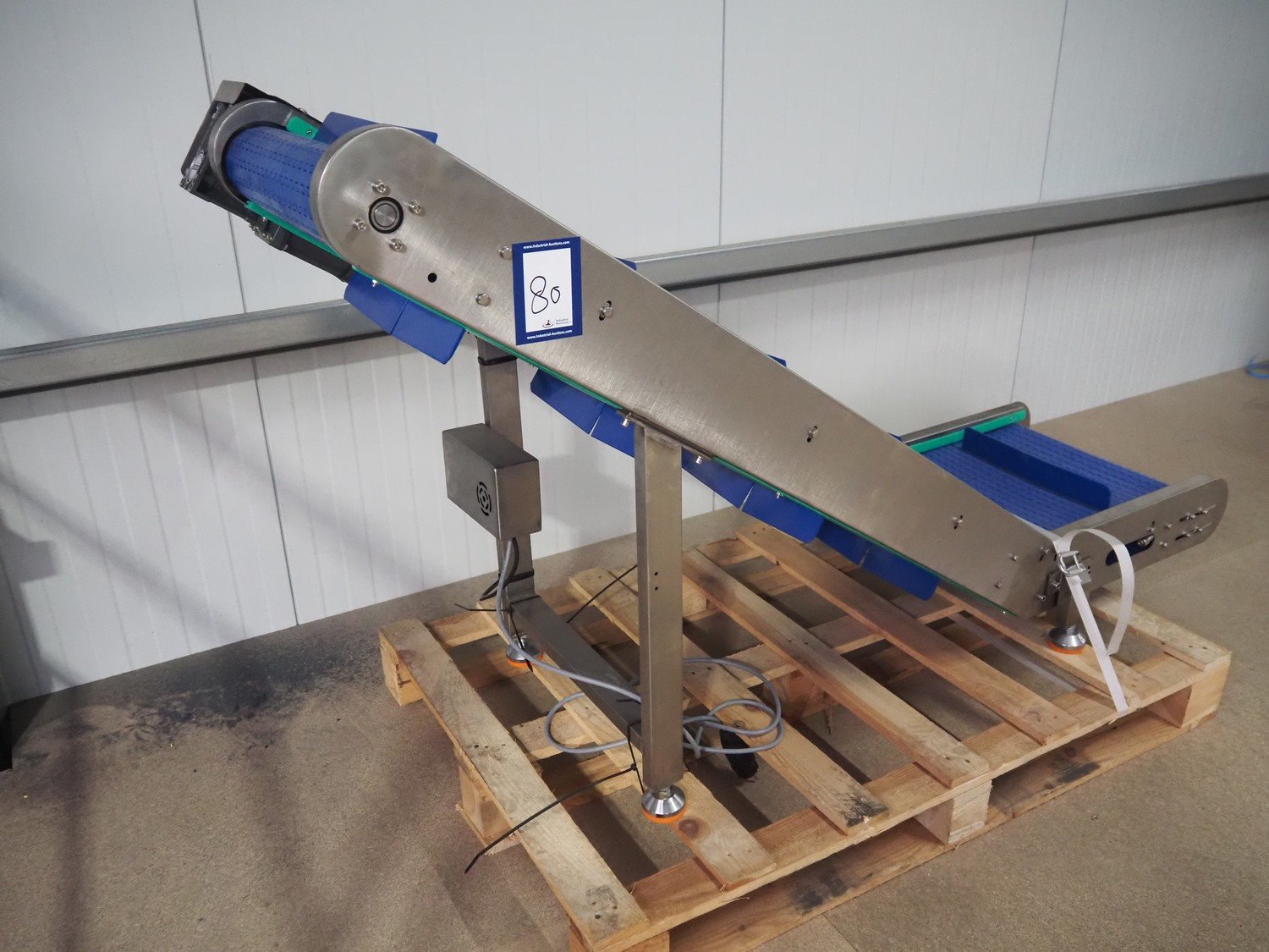 Elevating belt, plastic belt with dividers, belt width: 440 mm, divider height: 50 mm, distance between dividers: 260 mm, elevating height: 880 mm, total dimensions: 1600 mm x 600 mm x 900 mm.