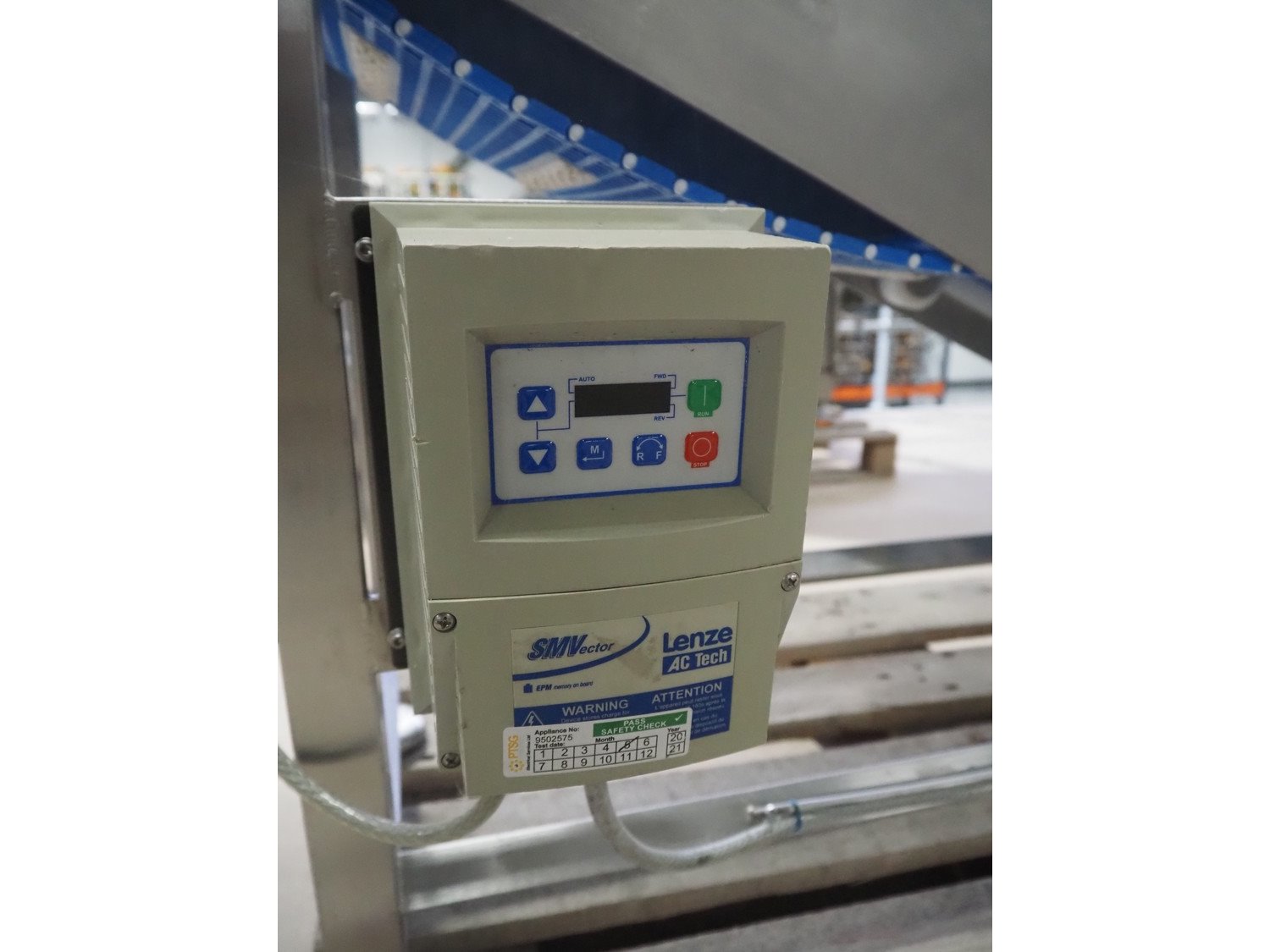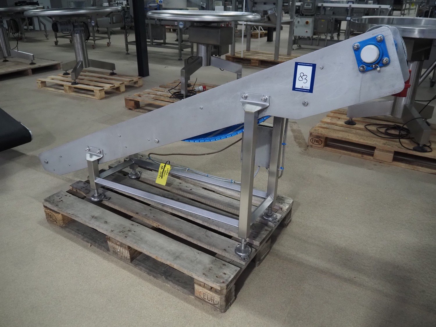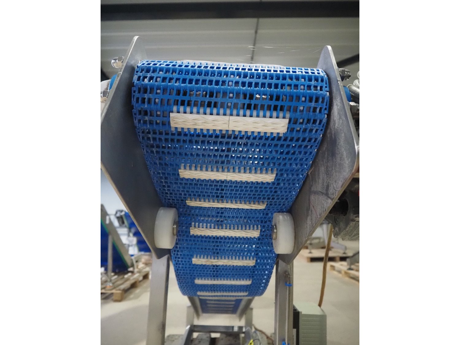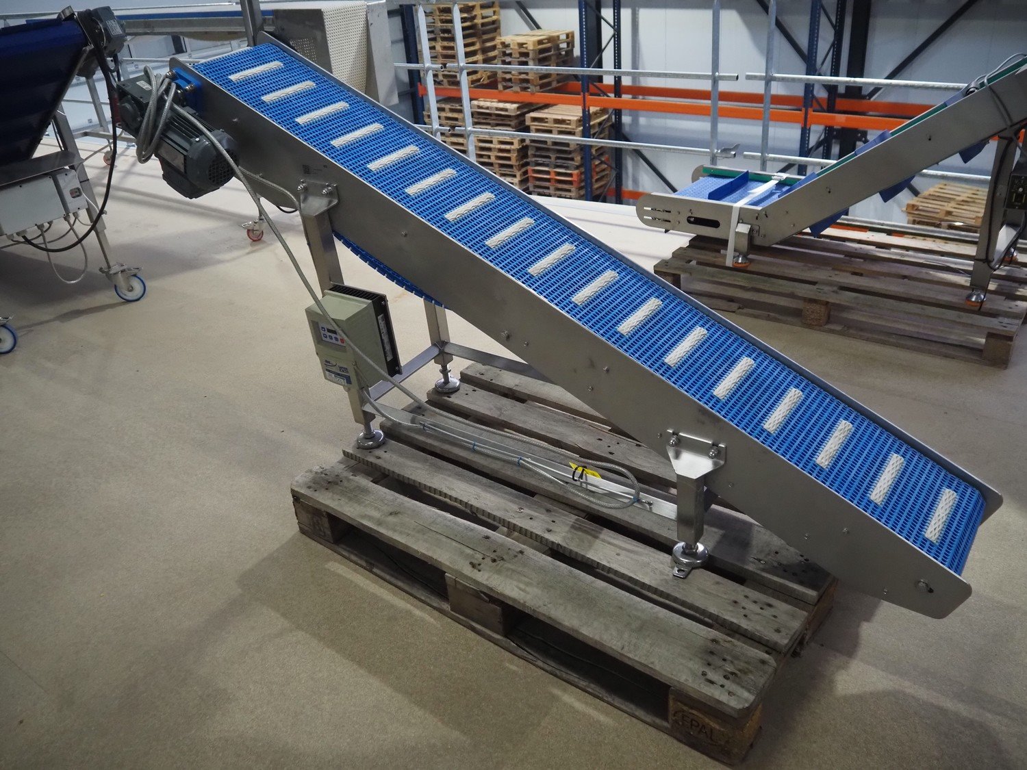 Elevating belt, s/s frame, plastic belt, belt width: 250 mm, elevating height: 950 mm, total dimensions: 1900 mm x 500 mm x 1000 mm.